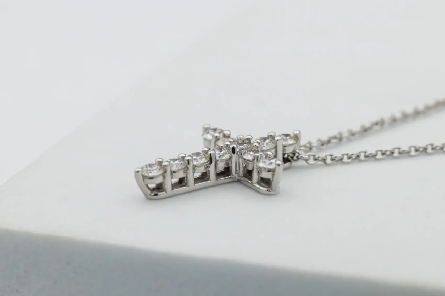 This elegant 18ct white gold cross pendant necklace combines timeless design with refined sparkle. Set with 0.51 carats of brilliant-cut natural diamonds, graded E colour and VS clarity, the pendant radiates exceptional brightness and purity. Each diamond is perfectly matched and meticulously set, creating a graceful, symmetrical cross that captures light beautifully from every angle.