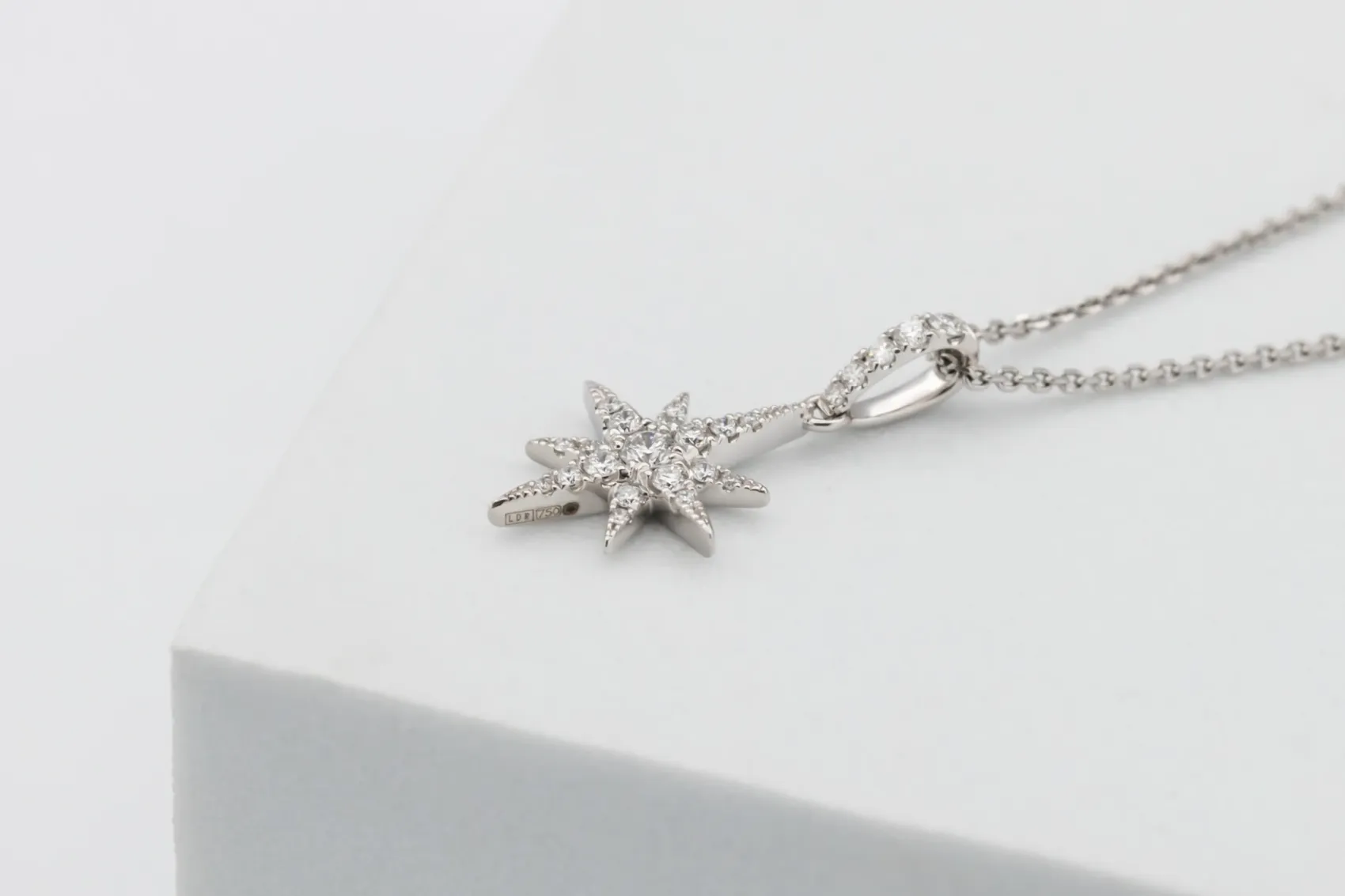 The diamond is set in a refined star-shaped 18ct white gold pendant, designed to reflect light gracefully with each movement. Suspended from a delicate white gold chain, this necklace is the perfect touch of timeless luxury for both everyday wear and special occasions.