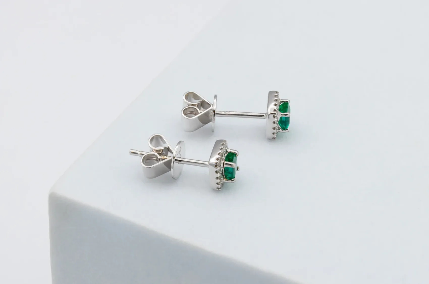 These exquisite 18ct white gold stud earrings feature a striking combination of emerald-cut natural emeralds and brilliant-cut natural diamonds, creating a perfect balance of colour, clarity, and sparkle. The vivid green of the emeralds is beautifully accentuated by the brilliance of the surrounding diamonds, resulting in a timeless and elegant design.