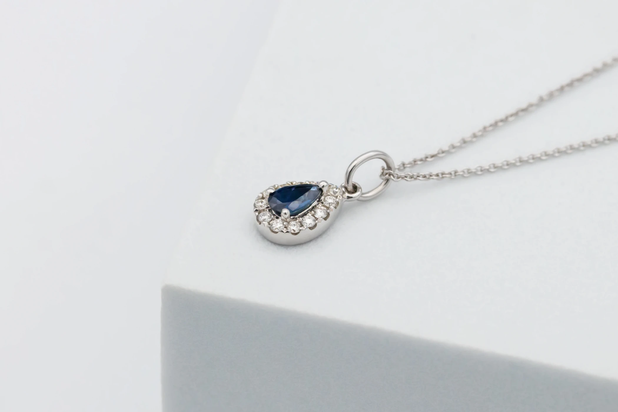 This elegant 18ct white gold pendant necklace showcases a beautifully cut natural pear-shaped sapphire, its rich blue hue radiating sophistication and timeless appeal. The sapphire is complemented by natural brilliant-cut diamonds, delicately set to enhance the gemstone’s depth and brilliance.