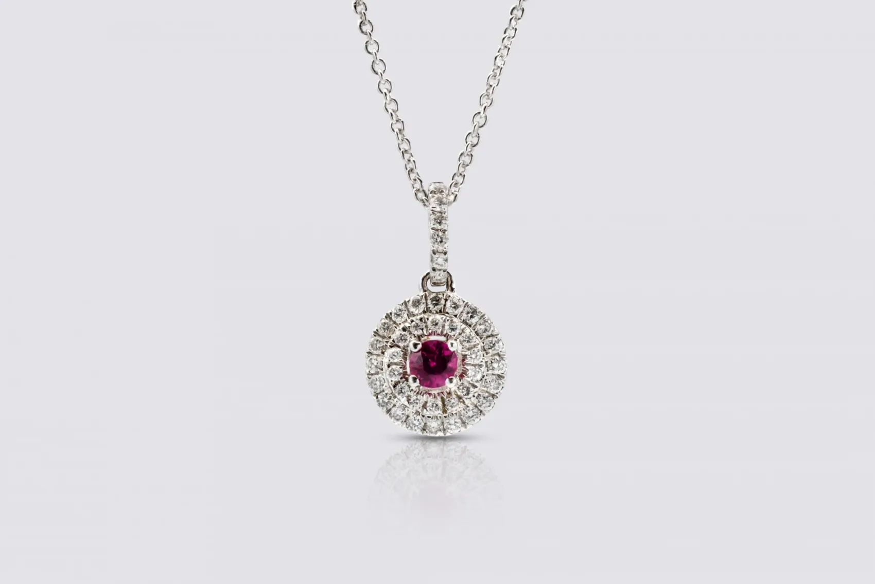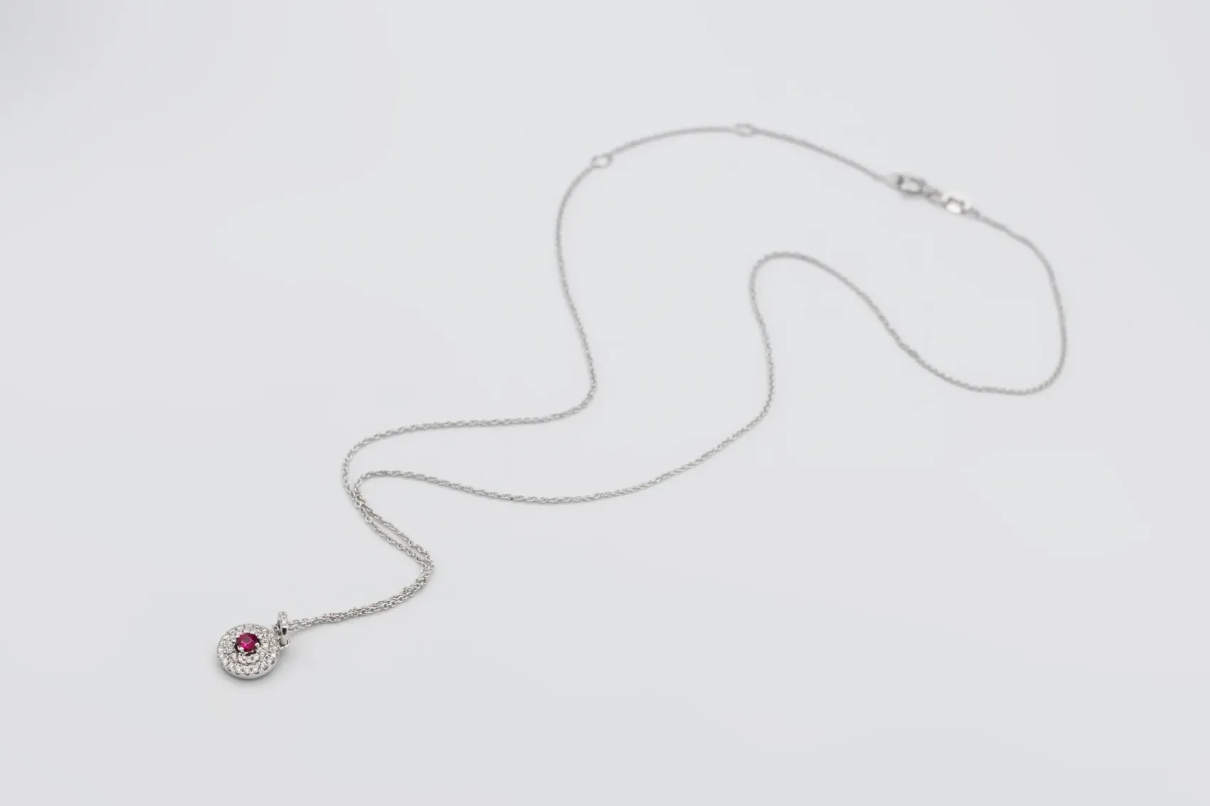 Crafted in 18ct white gold, the classic round pendant is suspended from a refined chain, offering a graceful and versatile design suitable for both everyday wear and special occasions. The harmonious blend of ruby and diamond creates a look that is both sophisticated and enduringly stylish.