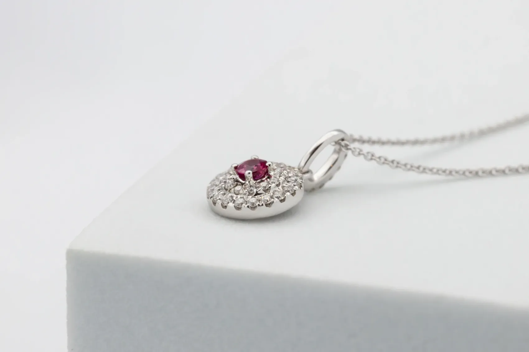 This elegant 18ct white gold pendant necklace showcases a stunning natural round-cut ruby, radiating vivid red tones that symbolise passion and timeless elegance. Surrounding the ruby are natural brilliant-cut diamonds, beautifully arranged to enhance the gemstone’s rich colour and captivating sparkle.