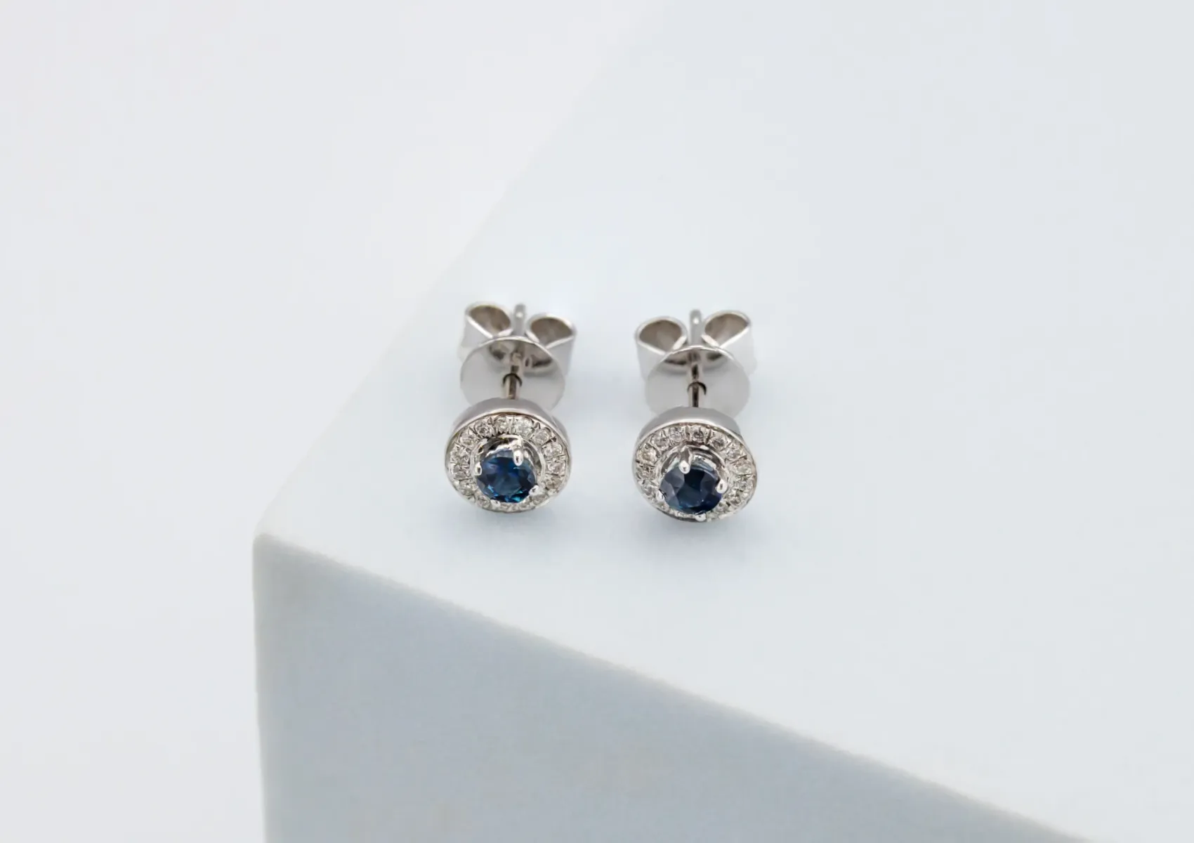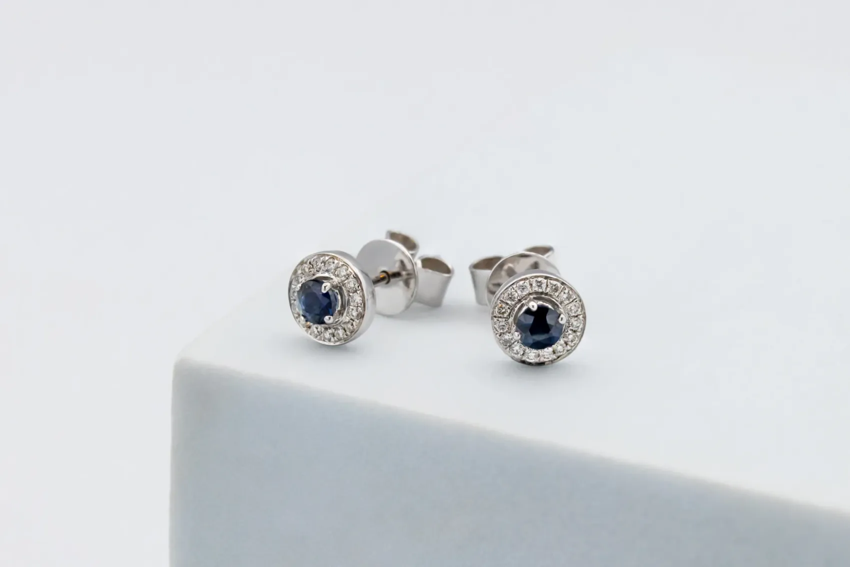 These elegant 18ct white gold sapphire and diamond stud earrings combine timeless beauty with refined craftsmanship. Each earring features a natural round-cut sapphire, radiating a deep, velvety blue hue, enhanced by brilliant-cut natural diamonds that add a touch of sparkle and sophistication.