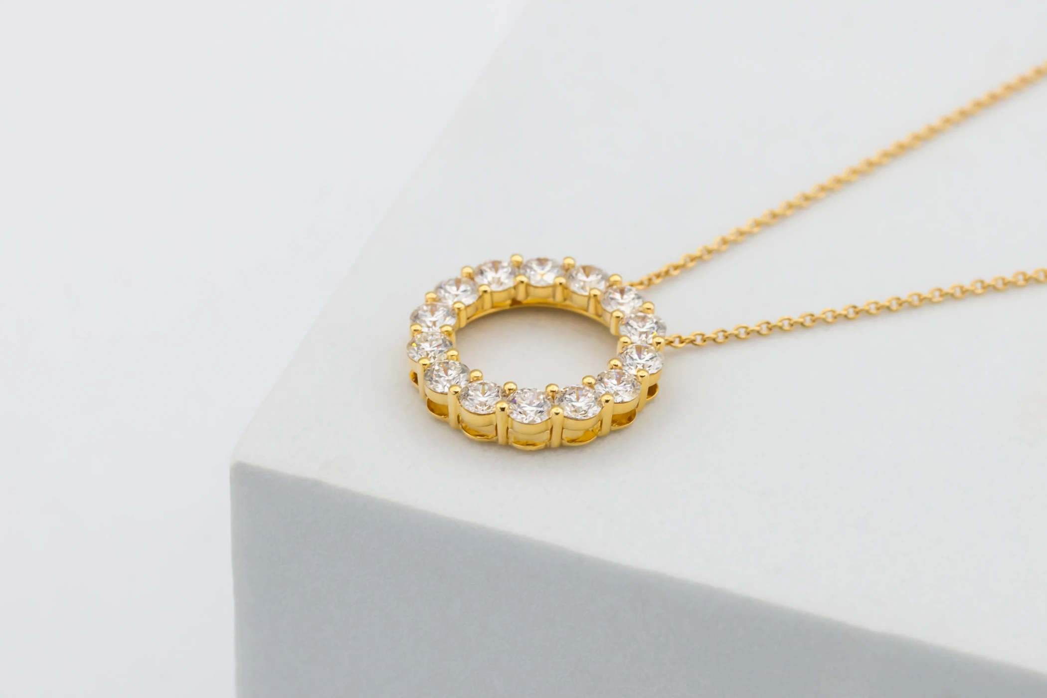 This stunning 18ct yellow gold diamond pendant necklace features a beautifully designed open circle pendant, elegantly claw set with natural brilliant-cut diamonds totalling an impressive 2.12 carats. The round design. a timeless symbol of unity and eternity, radiates light and sophistication from every angle.