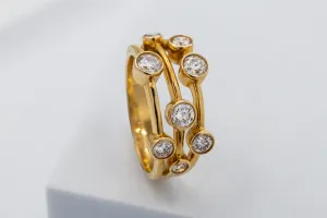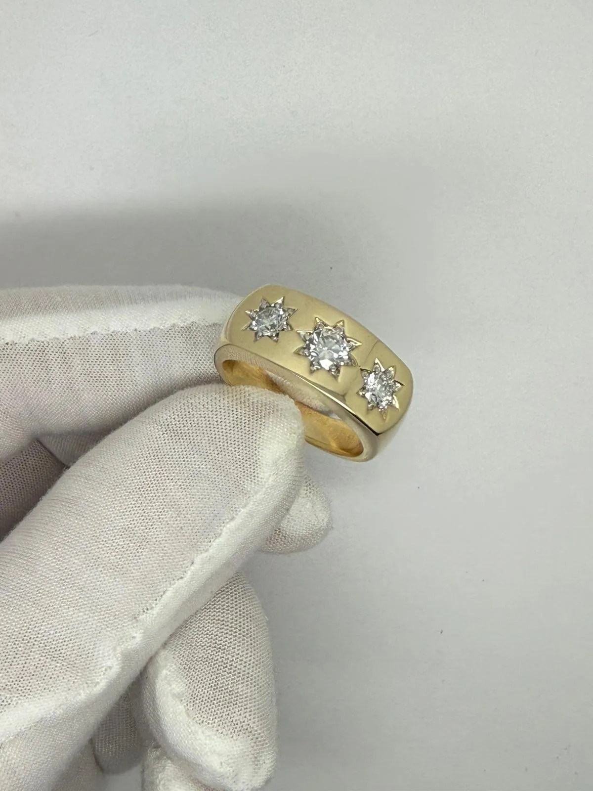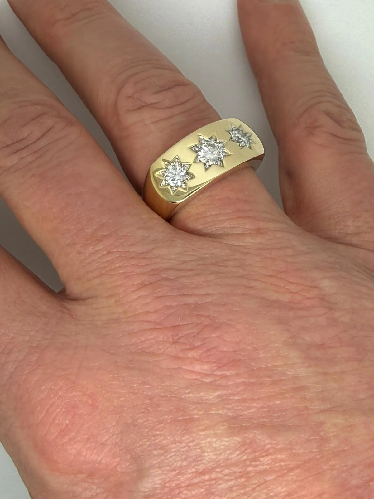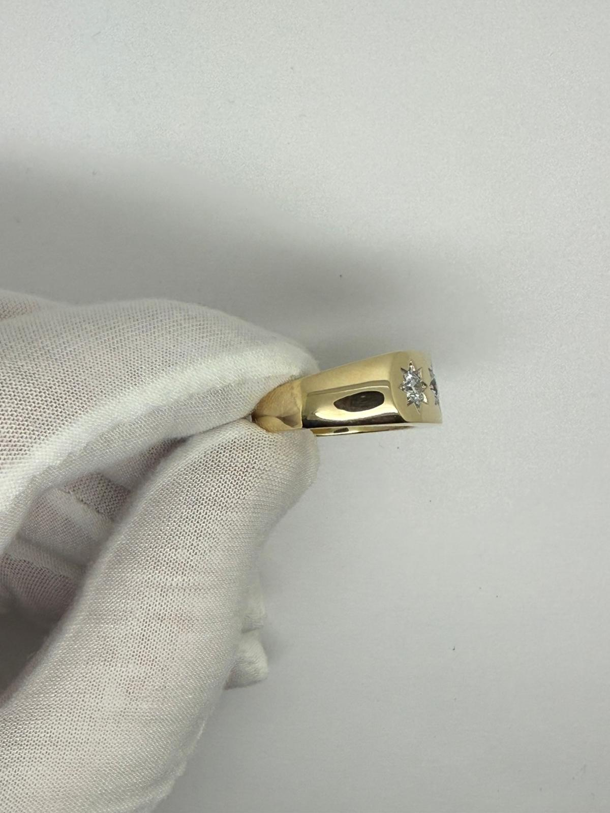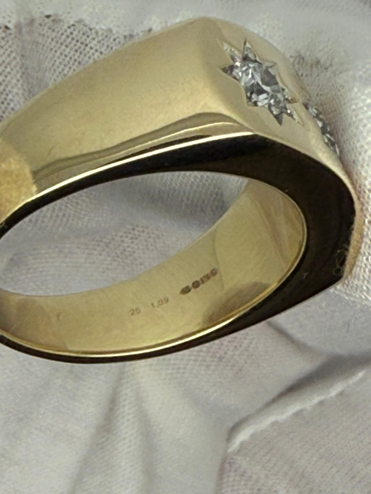 This brand new gents’ diamond gypsy ring is crafted in solid 9ct yellow gold and set with three round brilliant cut natural diamonds, totalling an impressive 1.09 carats. The diamonds are graded G colour and SI clarity, offering excellent brightness and presence, perfectly suited to the bold, traditional gypsy ring style.