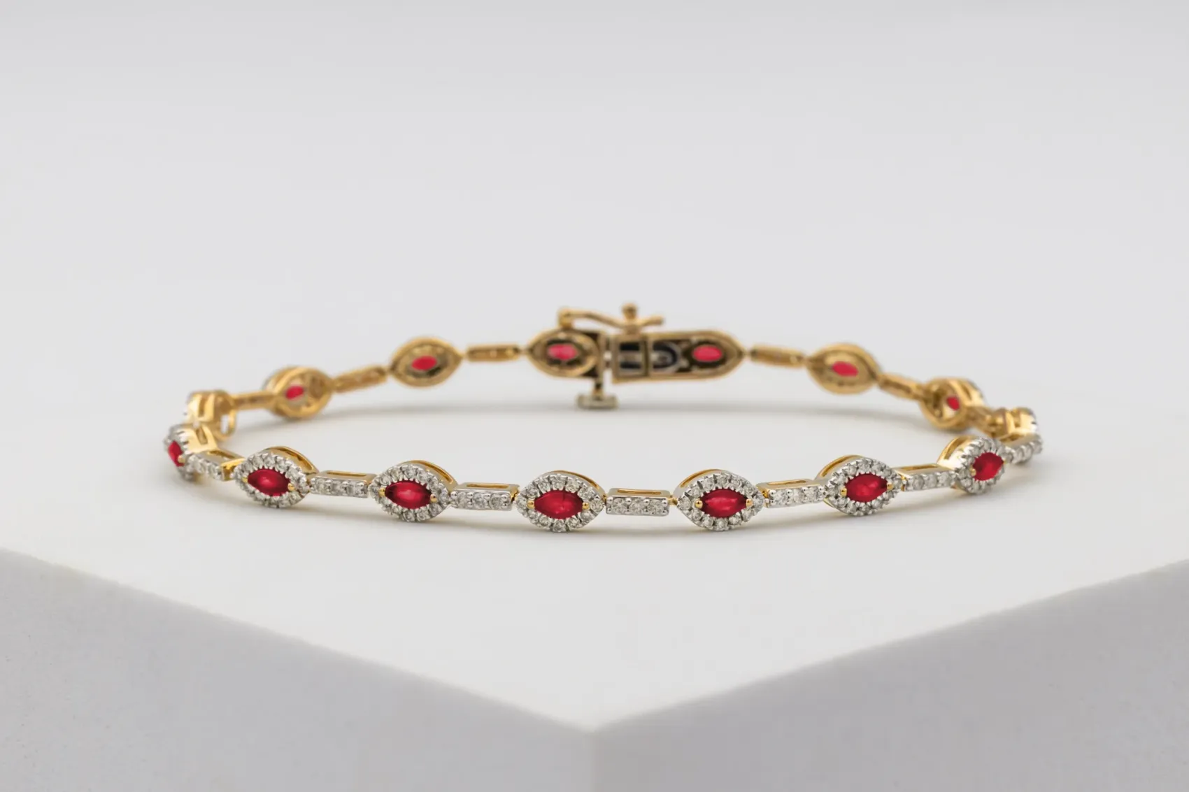 This elegant 9ct yellow gold ruby and diamond bracelet combines classic design with luxurious detail. The centrepiece features a striking marquise-cut ruby, showcasing a vivid red tone that symbolises passion and elegance. Surrounding the ruby are 1.40 carats of natural brilliant-cut diamonds, carefully selected for their sparkle and set in warm yellow gold to create a stunning contrast.