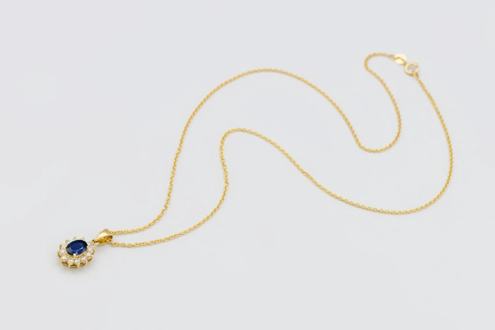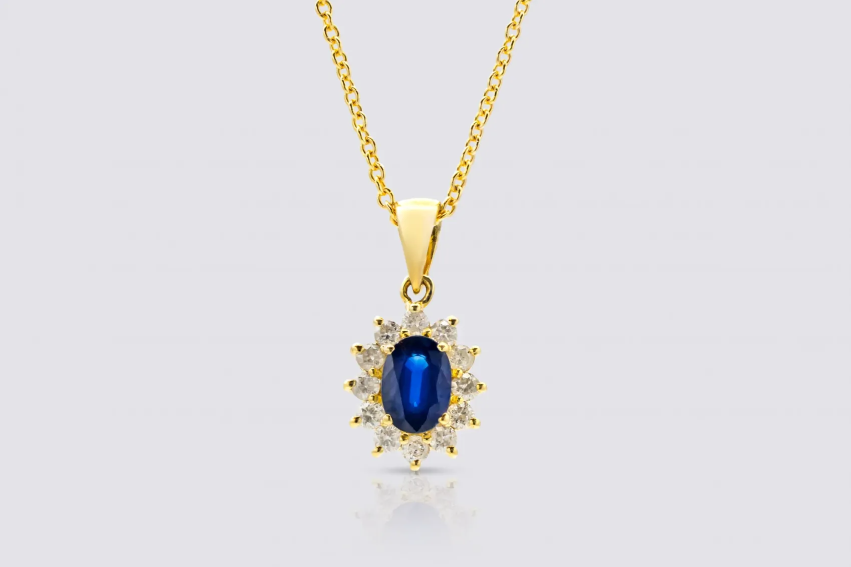 This elegant 9ct yellow gold trace necklace features a stunning natural oval-cut sapphire weighing 1.05 carats, displaying a rich, velvety blue hue that radiates timeless sophistication. Accentuating the centre stone are 0.42 carats of natural brilliant-cut diamonds, adding exceptional sparkle and contrast against the deep sapphire tones.
