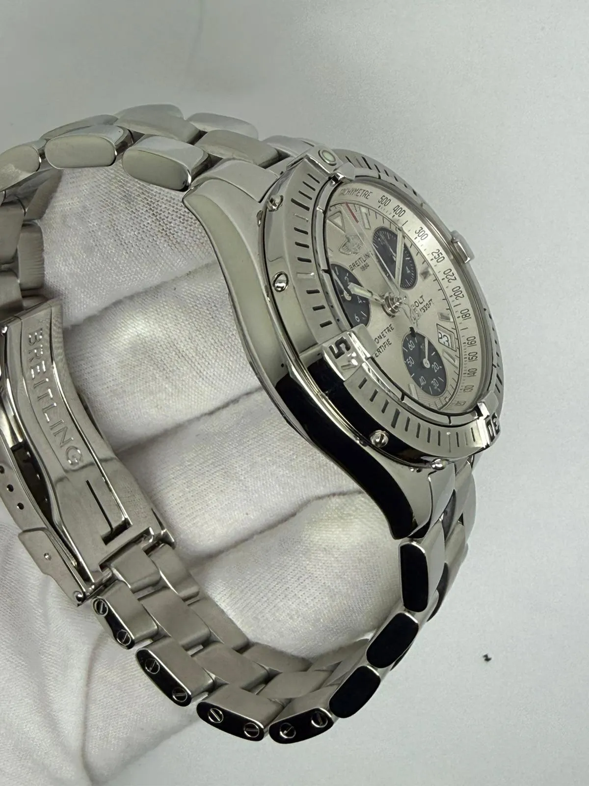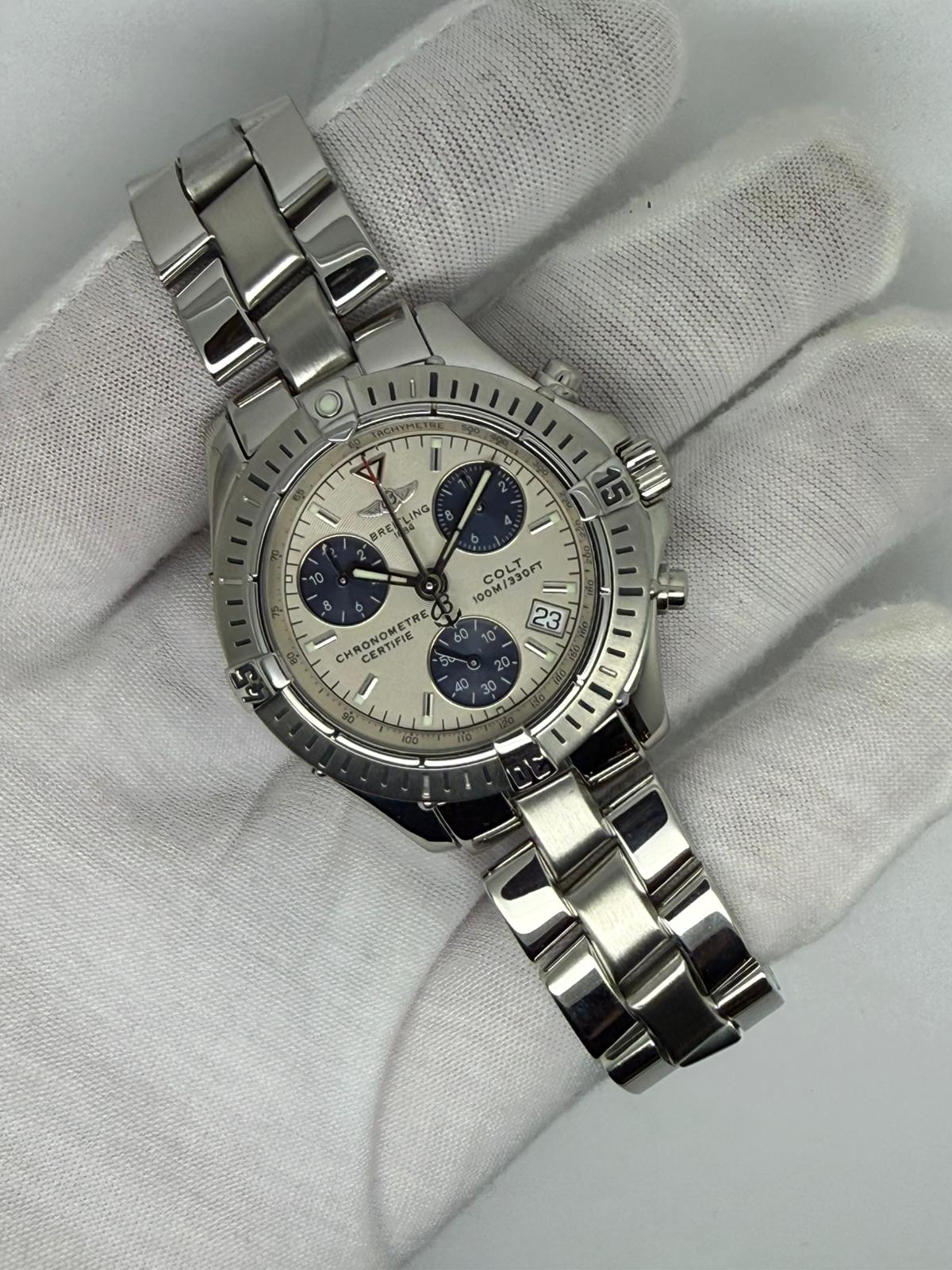 This sporty 2005 Breitling Colt Quartz Chronograph Chronometer, reference A73350, features a versatile 38mm stainless steel case paired with a striking silver dial with blue sub-dials, offering a bold and highly legible design.