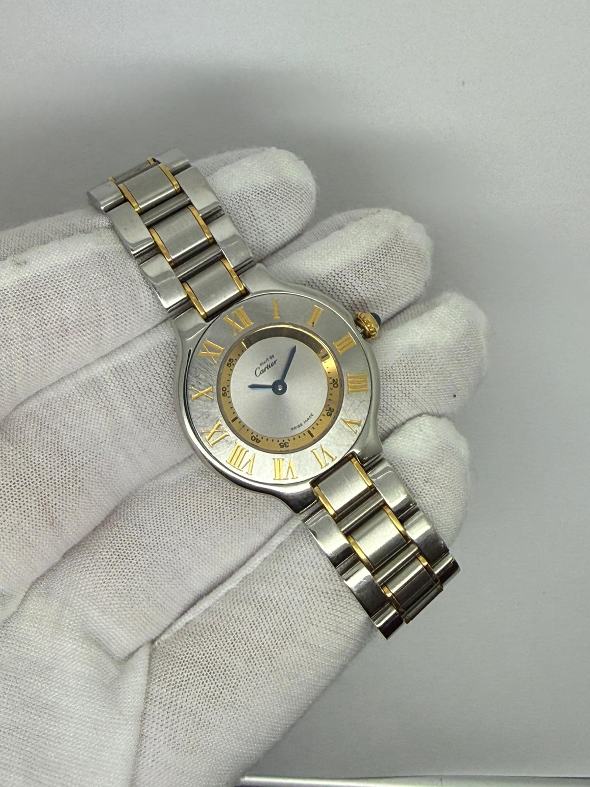 This elegant 1990s Cartier Must de Cartier 21, reference 1340, features a refined 28mm case crafted in stainless steel and gold, paired with the distinctive bracelet design that defines this iconic Cartier model. The Must de Cartier 21 collection is celebrated for its timeless styling and effortless wearability.