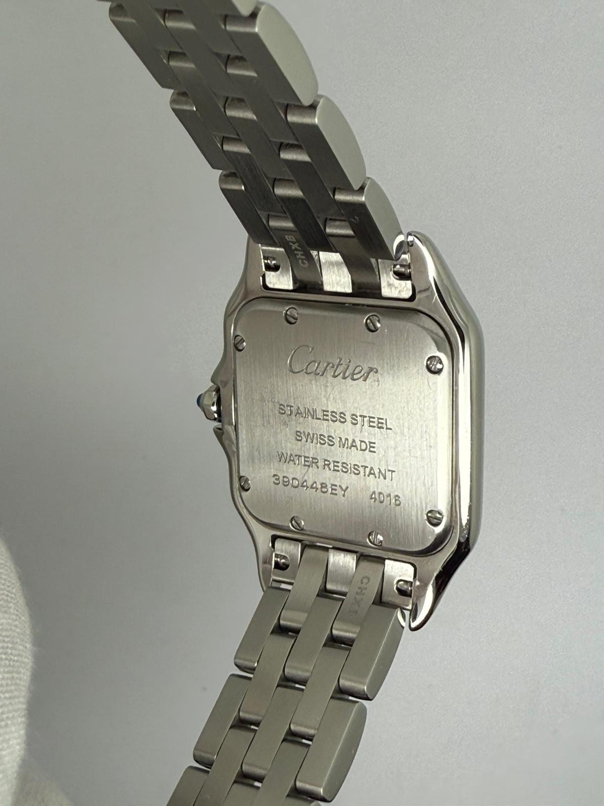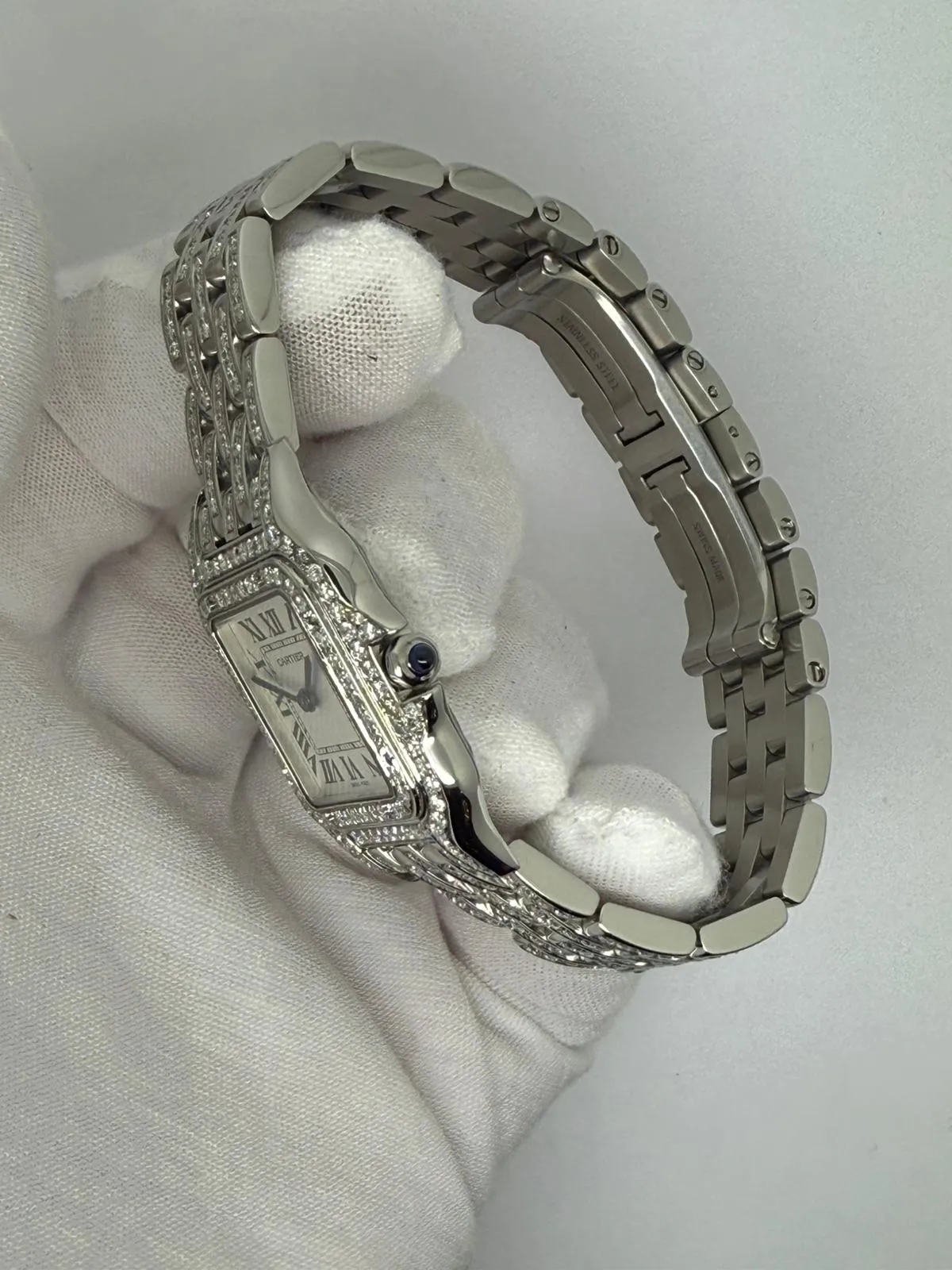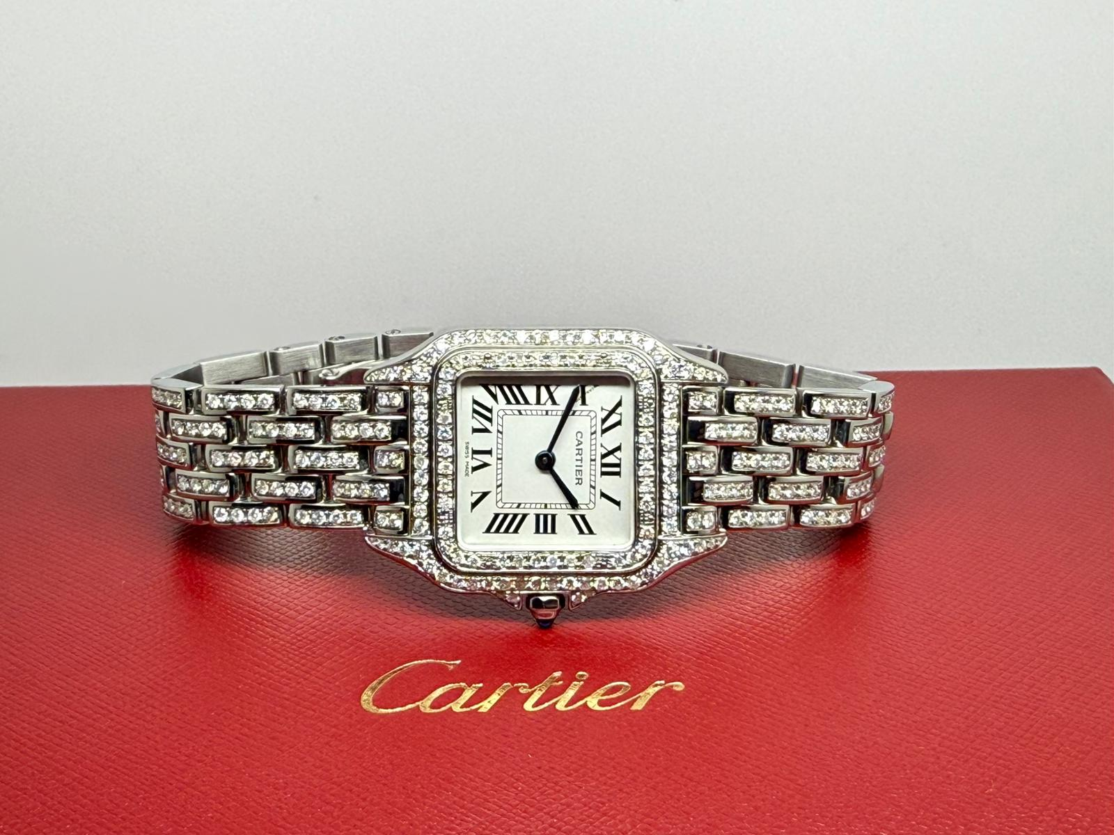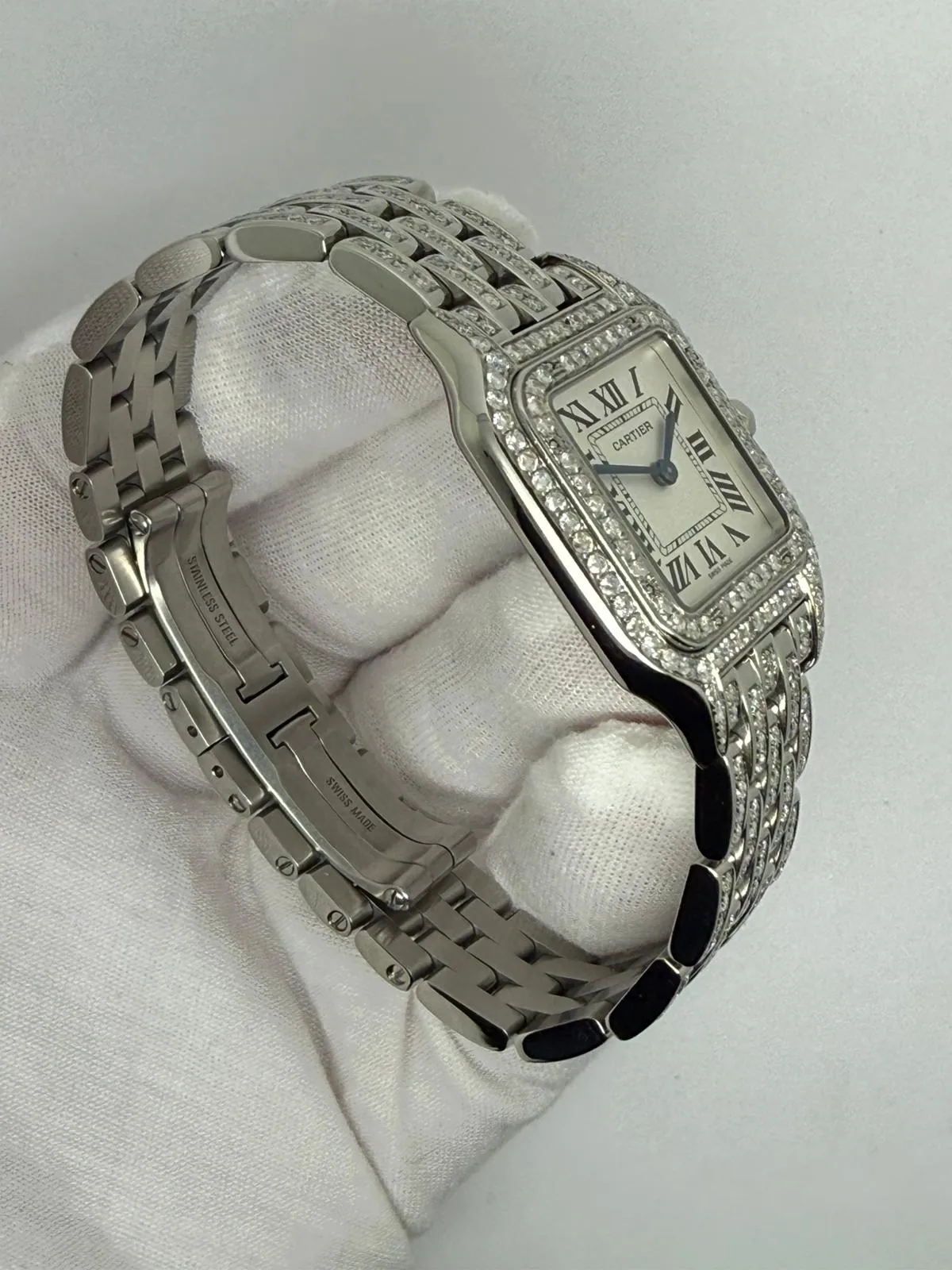 This stunning 2025 Cartier Panthère, reference WSPN007, features the elegant 27mm medium-size stainless steel case with a classic silver dial, elevated by a custom diamond-set design using natural round brilliant-cut white diamonds. The result is a refined yet striking interpretation of one of Cartier’s most iconic ladies’ watches.