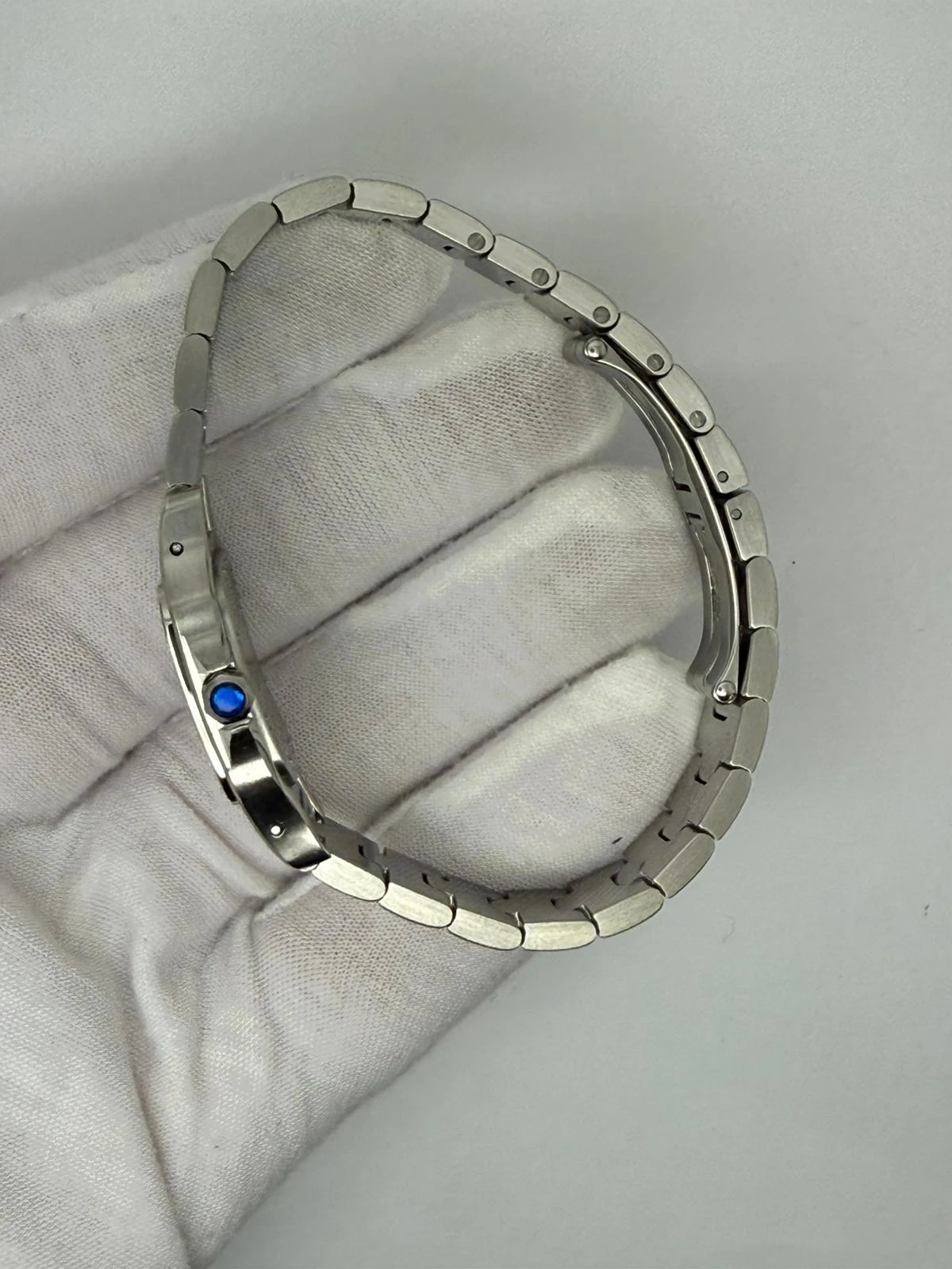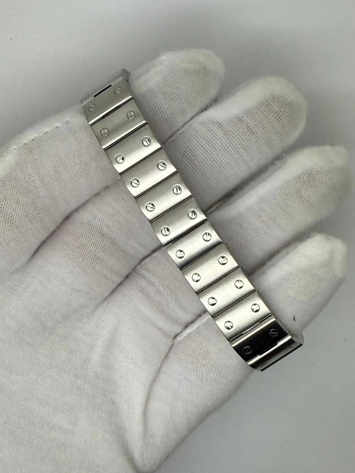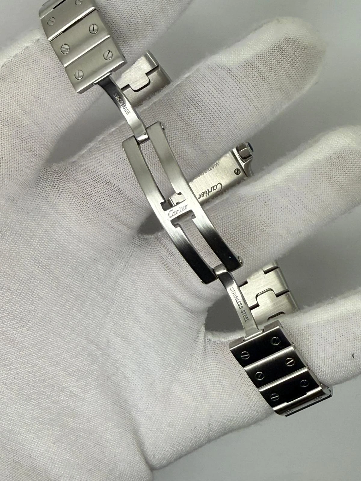 This 2019 Ladies Cartier Santos Galbée, reference 1565, features a refined 24×35mm stainless steel case in the signature curved Santos design. Presented in immaculate condition, it comes as a full set with Cartier box and papers, offering both elegance and reliability.
