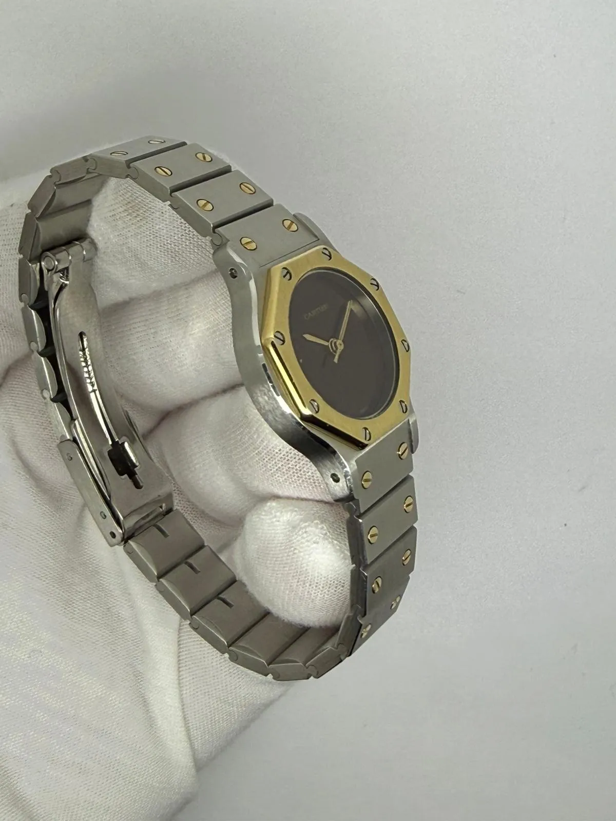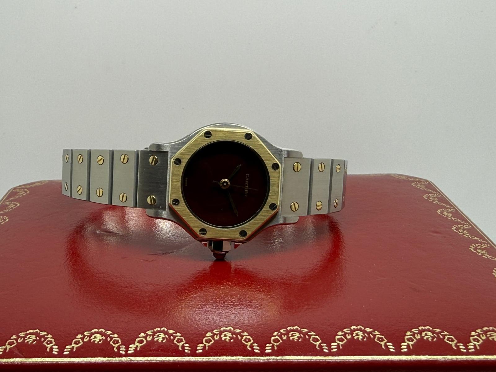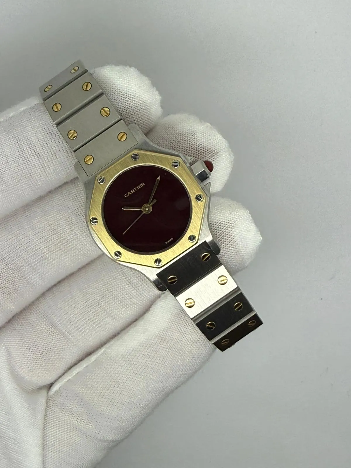 This highly collectible 1980s Cartier Santos Octagonal, reference 2965, features the distinctive 26x31mm case crafted in stainless steel and 18ct yellow gold. Retaining its original two-tone bracelet and original cabochon gemstone crown, this example also showcases the rare and sought-after burgundy dial, a standout feature among Santos collectors.