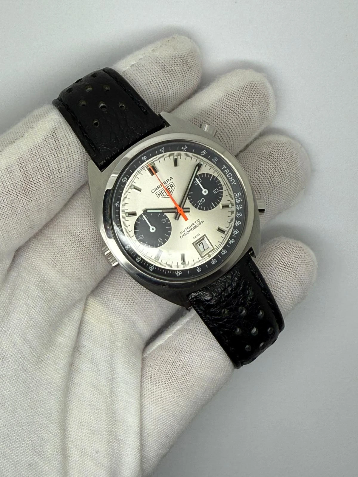 This 1970s Heuer Carrera Chronograph, reference 1153S, is a truly exceptional example of one of Heuer’s most iconic vintage models. Housed in a 39mm stainless steel case, it features an automatic chronograph movement — part of the pioneering generation of self-winding chronographs that cemented the Carrera’s place in horological history.