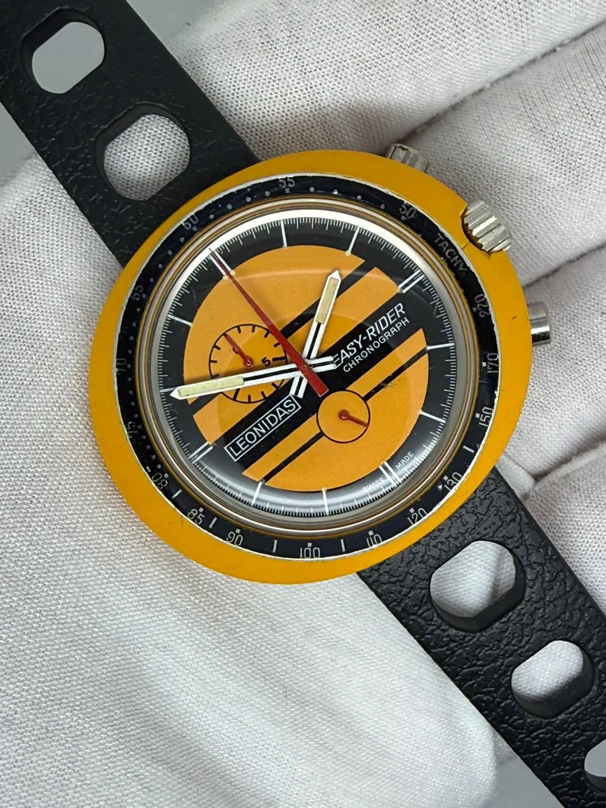 This vibrant circa 1972 Heuer Leonidas Heuer Easy Rider Chronograph, reference 423.809J, features a bold 45x40mm fibreglass monocoque case paired with a striking orange and yellow dial, perfectly capturing the distinctive racing aesthetic of the early 1970s. A true statement vintage chronograph with strong collector appeal, particularly among Leonidas Heuer enthusiasts.