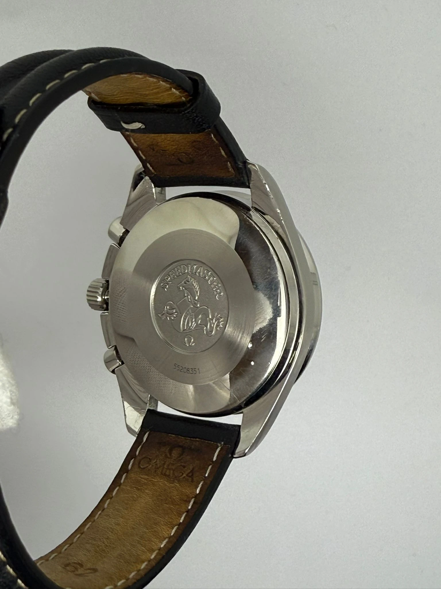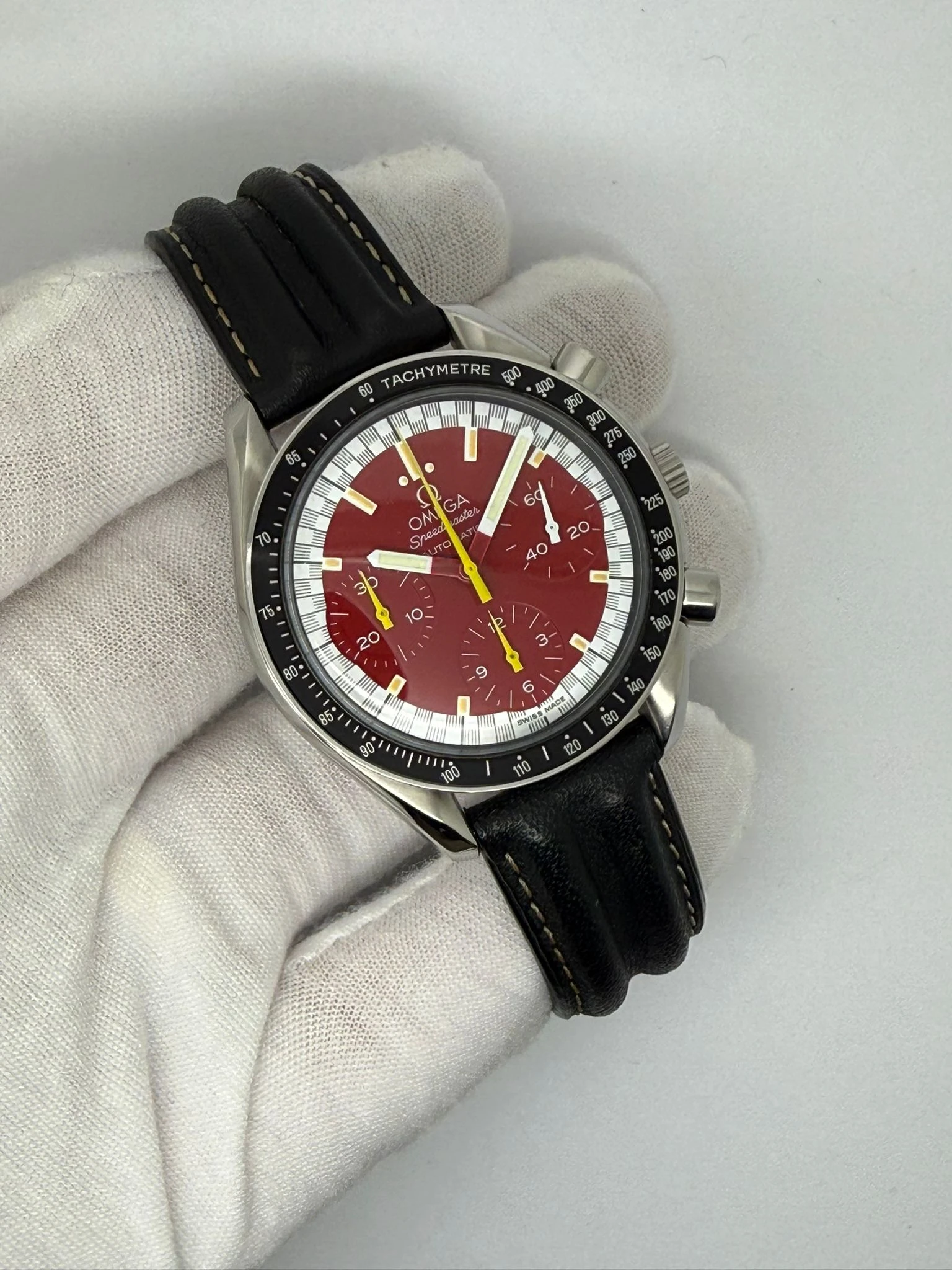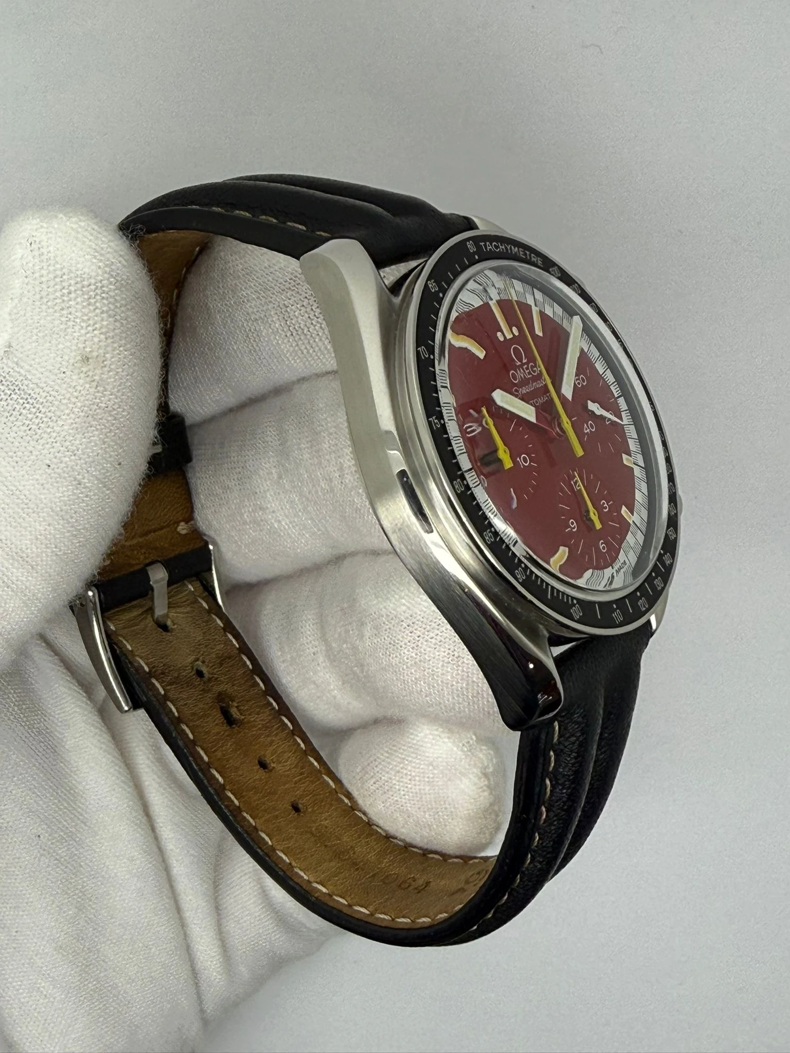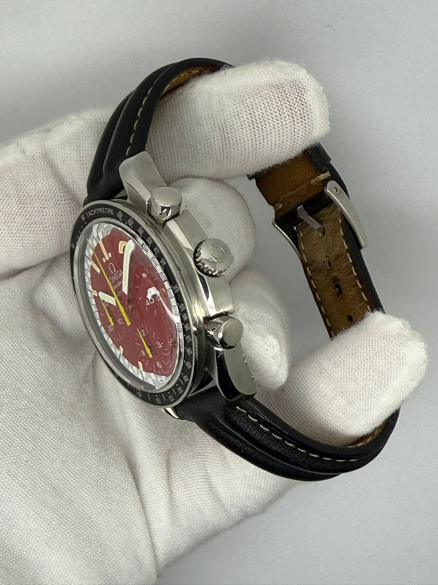 This 1999 Omega Speedmaster Automatic ‘Schumacher Edition’, reference 175.0032, is a highly collectable model celebrating Omega’s partnership with Formula 1 legend Michael Schumacher. Housed in a 39mm stainless steel case, it is powered by the calibre 1141 automatic chronograph movement — fully serviced and offered with a two-year guarantee for precision and reliability.