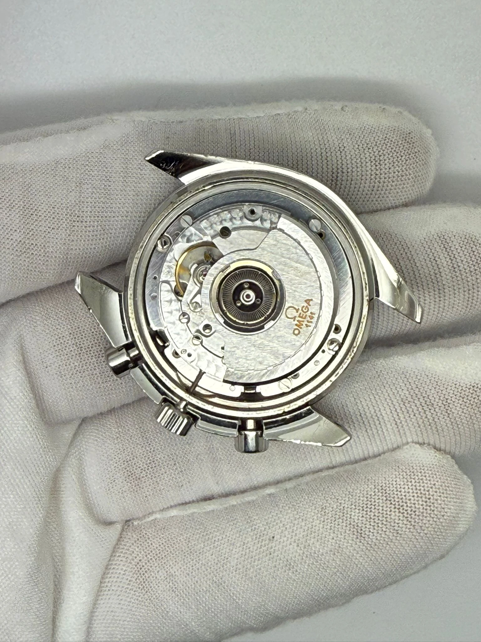This example retains its original Omega strap and buckle and is presented as a complete collector’s set, including its original box, papers, booklets, and the distinctive Formula 1 wheel display stand — a rare and sought-after feature among enthusiasts. The watch is in superb condition throughout, combining the classic Speedmaster design with motorsport heritage and genuine collector appeal.