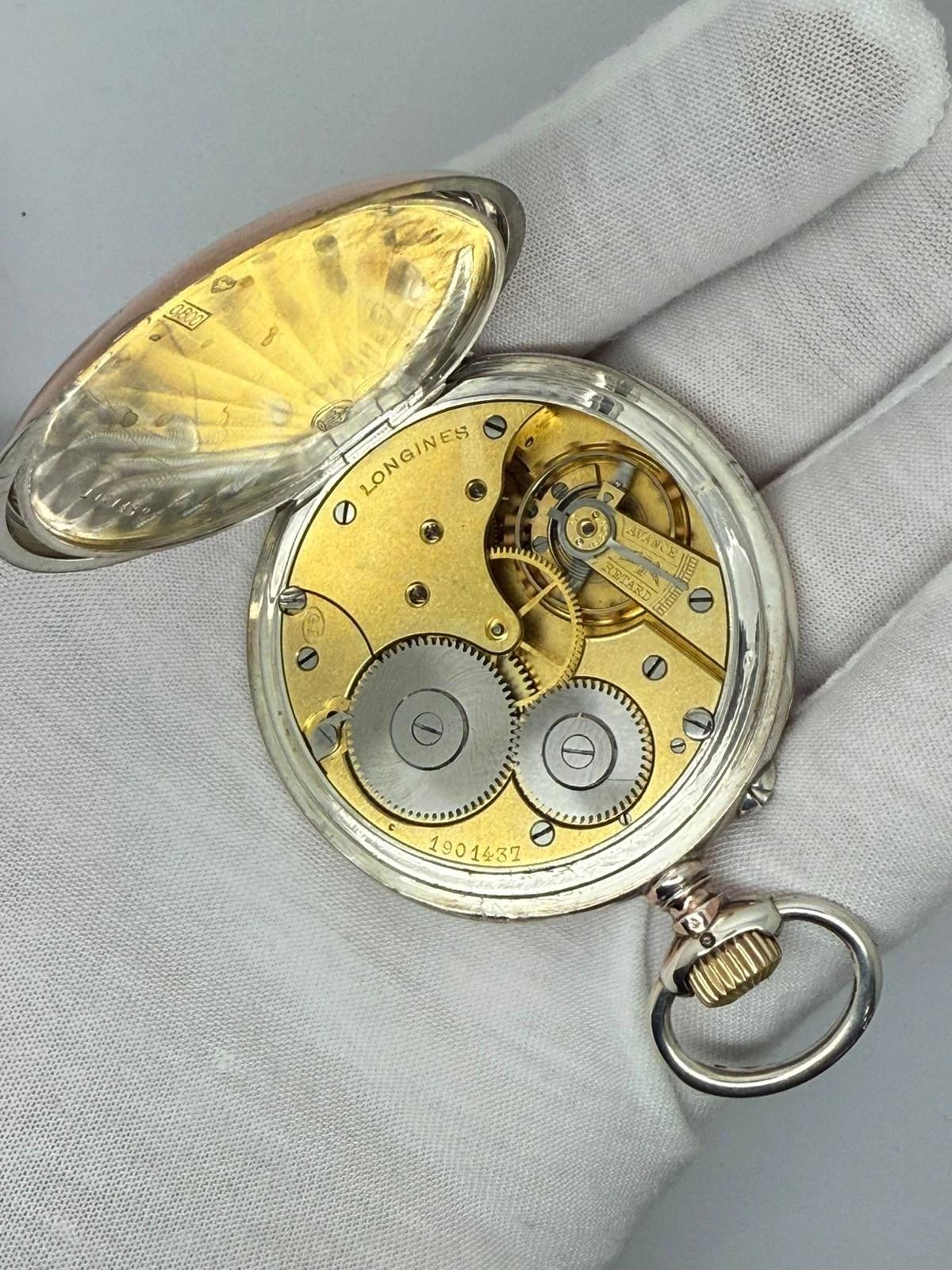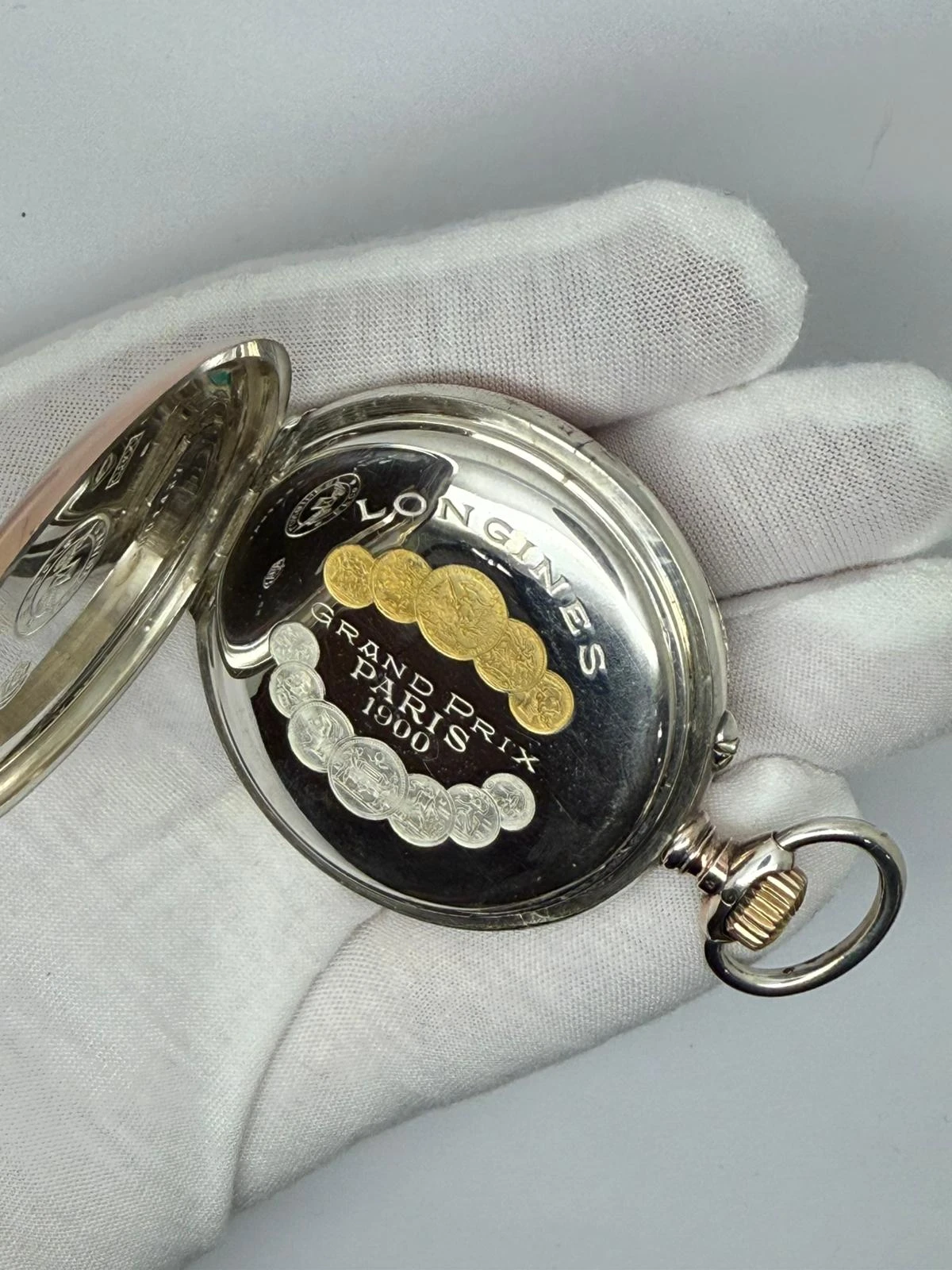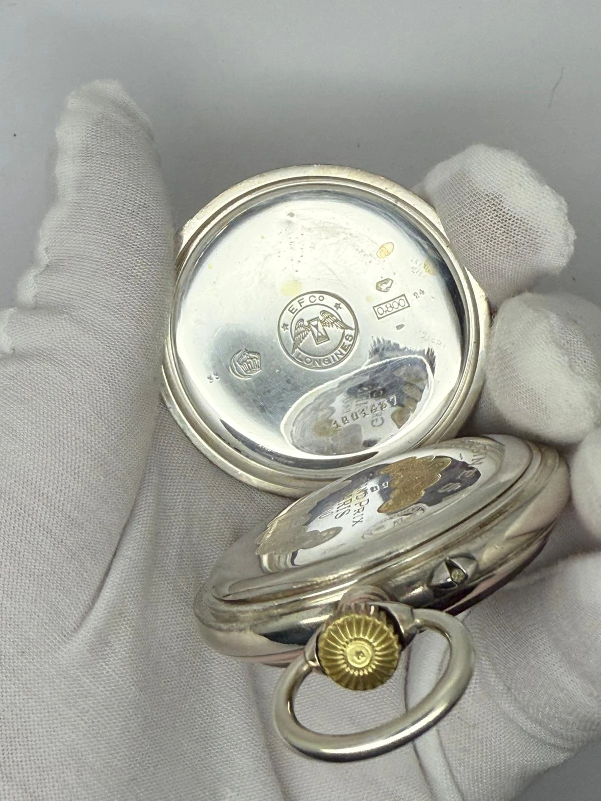 This 1906 Longines open face pocket watch is a beautifully preserved example of early 20th-century craftsmanship, featuring a striking combination of silver and rose gold. Presented in immaculate condition, it showcases exquisite detailing and true historical charm — a genuine piece of horological heritage.