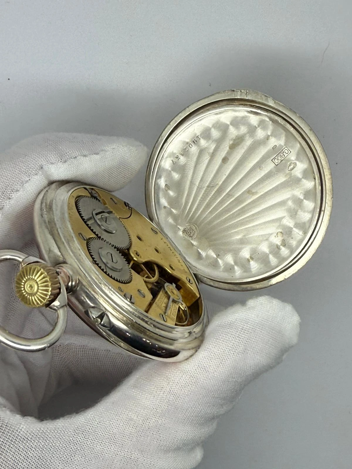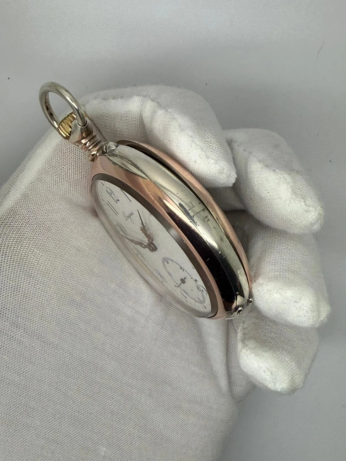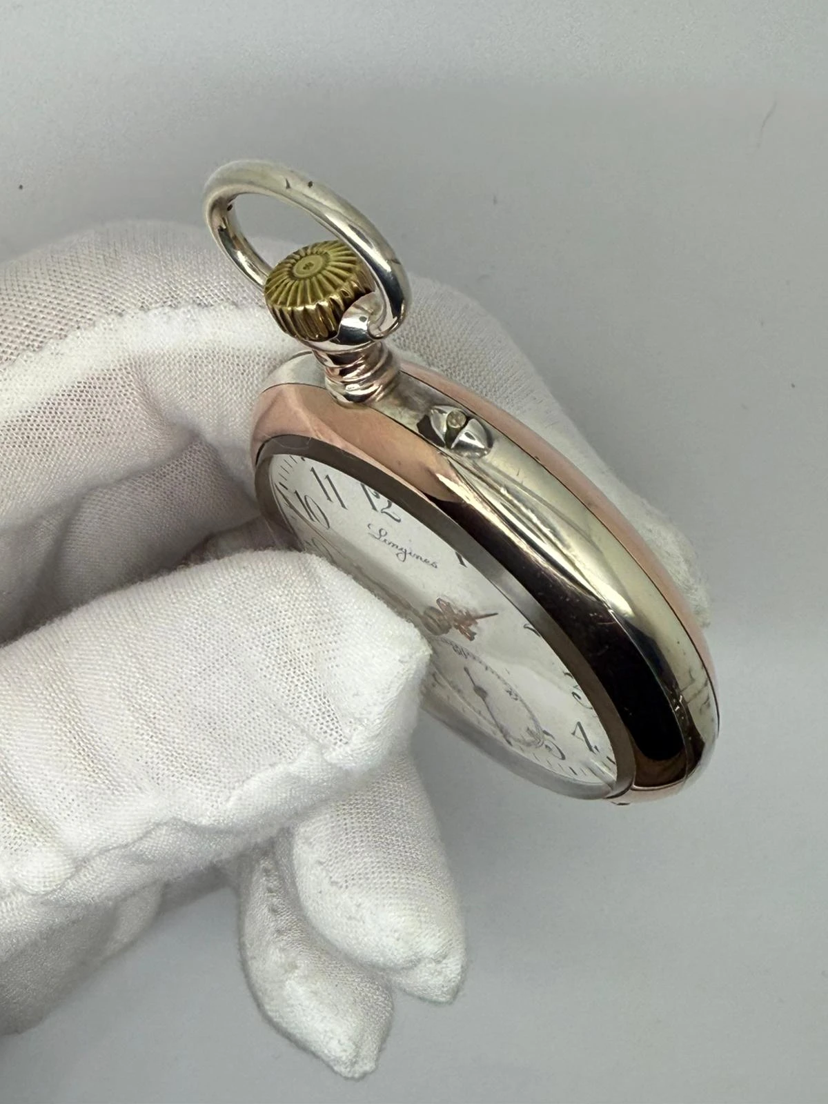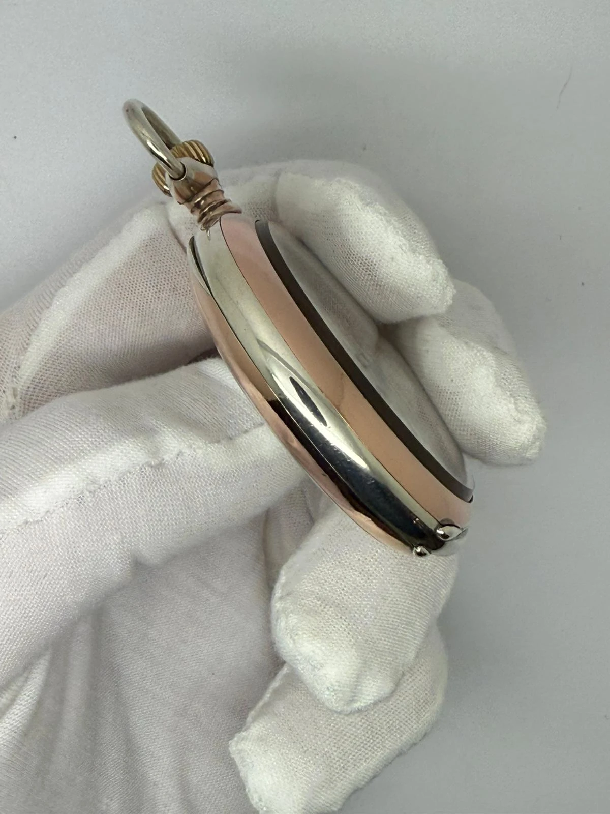 This 1906 Longines open face pocket watch is a beautifully preserved example of early 20th-century craftsmanship, featuring a striking combination of silver and rose gold. Presented in immaculate condition, it showcases exquisite detailing and true historical charm — a genuine piece of horological heritage.