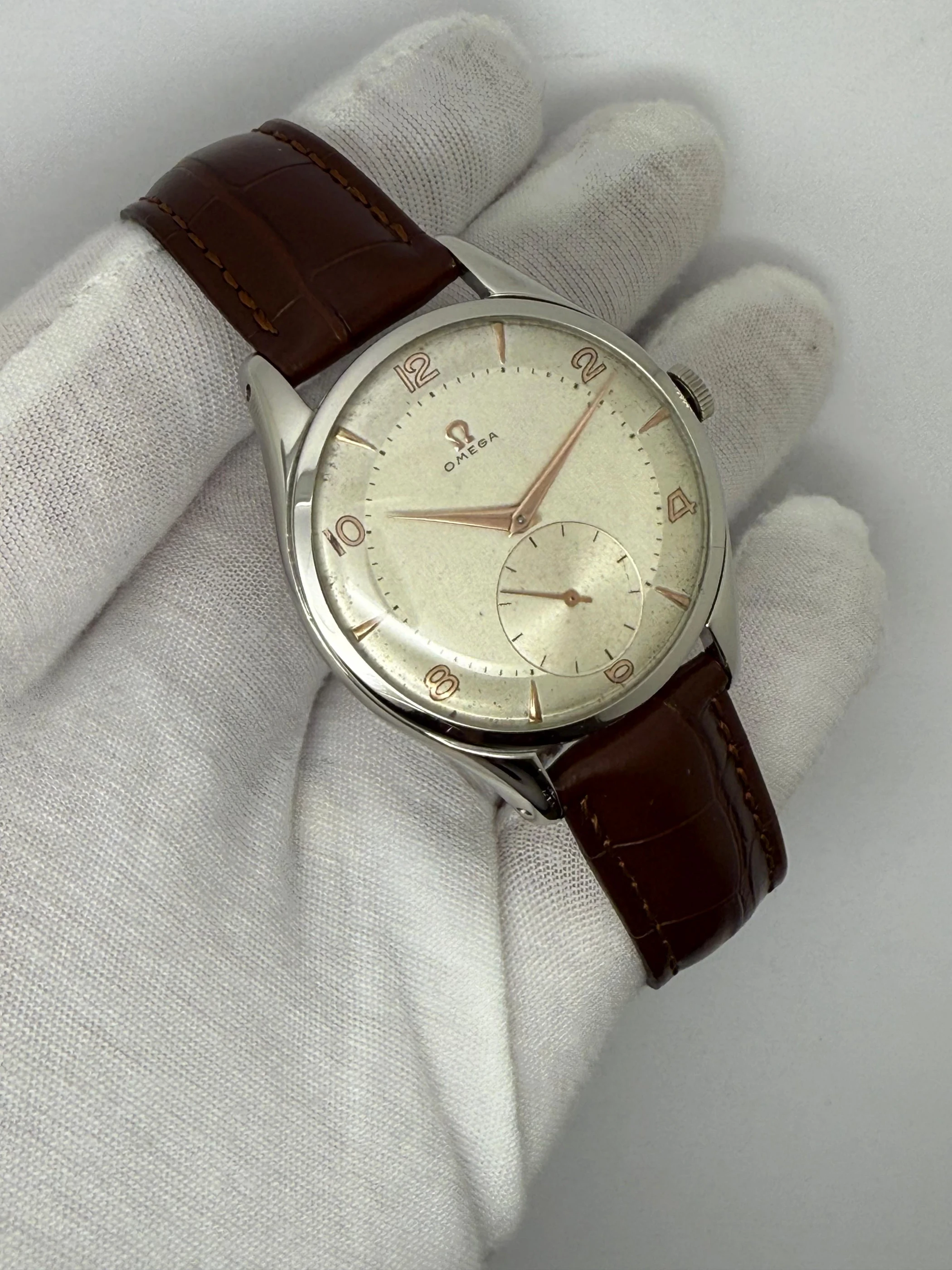 This striking 1940s Omega 2505 features a beautifully aged dial with vintage charm, framed by a substantial 38mm stainless steel case – a “Jumbo” size that remains highly desirable among collectors today. The watch is powered by Omega’s reliable calibre 265 manual wind movement, recently serviced and offered with a full two-year guarantee for complete assurance. It is presented on a Hirsch genuine alligator strap with a steel vintage Omega pin buckle and is accompanied by a vintage Omega box, making it an especially appealing set for enthusiasts and collectors. Priced at £1,495, this piece offers an excellent opportunity to own a refined and historic Omega with strong wrist presence.