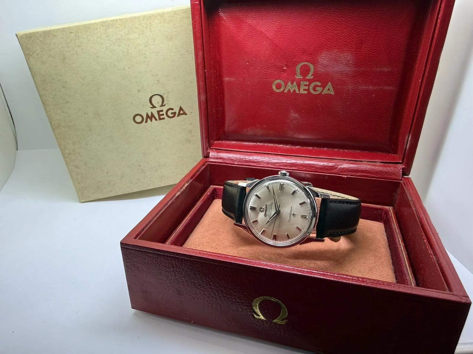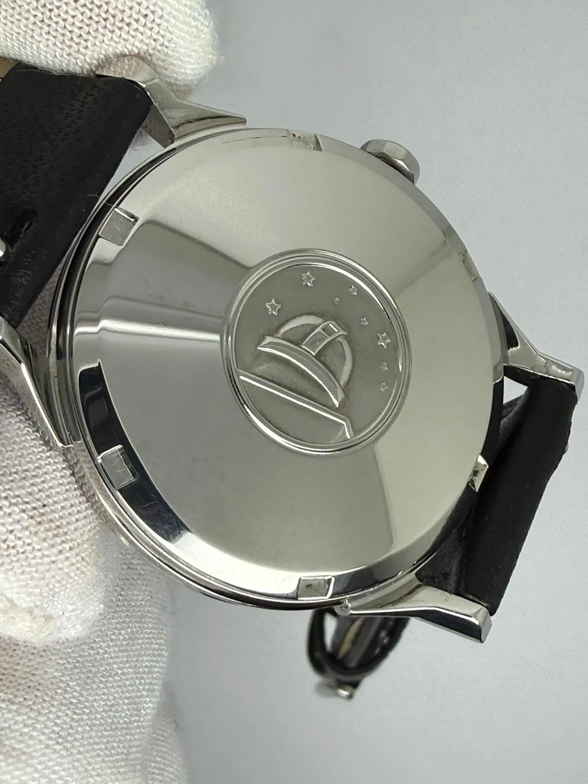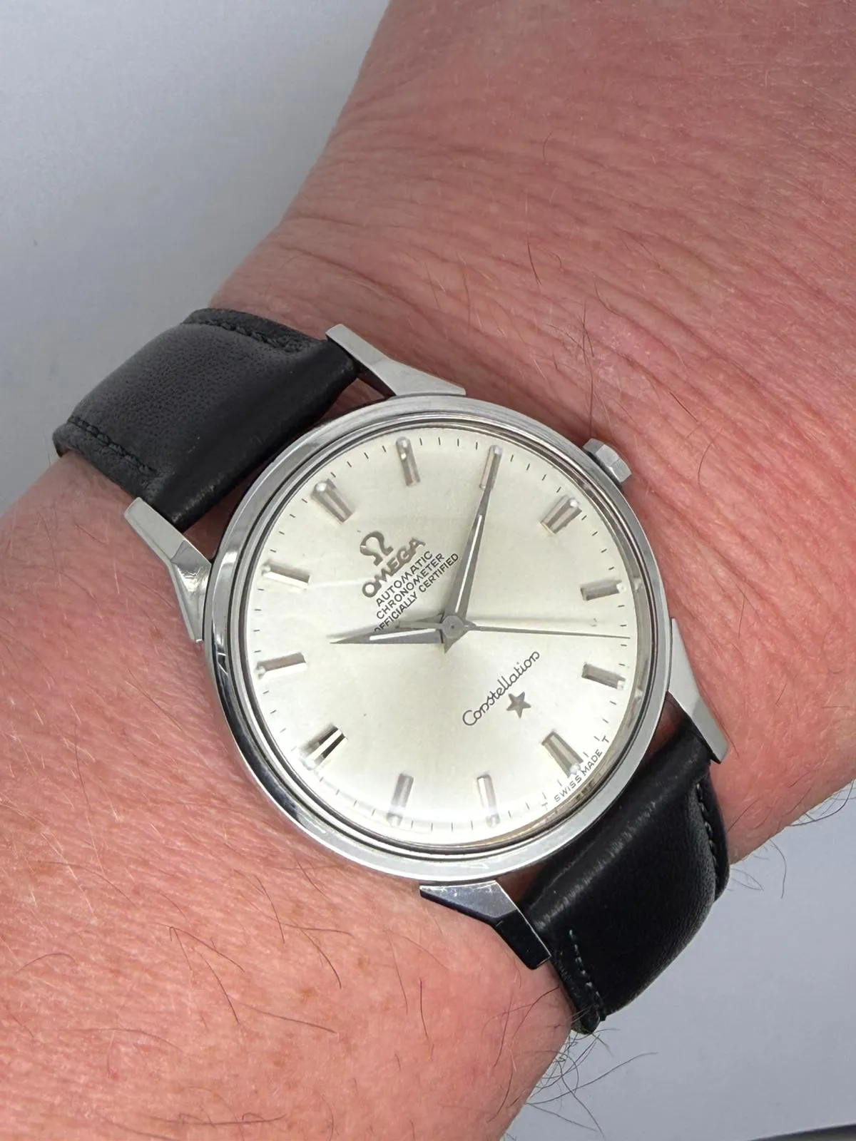 This elegant 1963 Omega Constellation Automatic Chronometer, reference 167.005, features a classic 34mm stainless steel case with the highly desirable dog leg lugs, a signature design detail of vintage Constellation models. The silver dial adds timeless sophistication, making this a standout mid-century Omega.