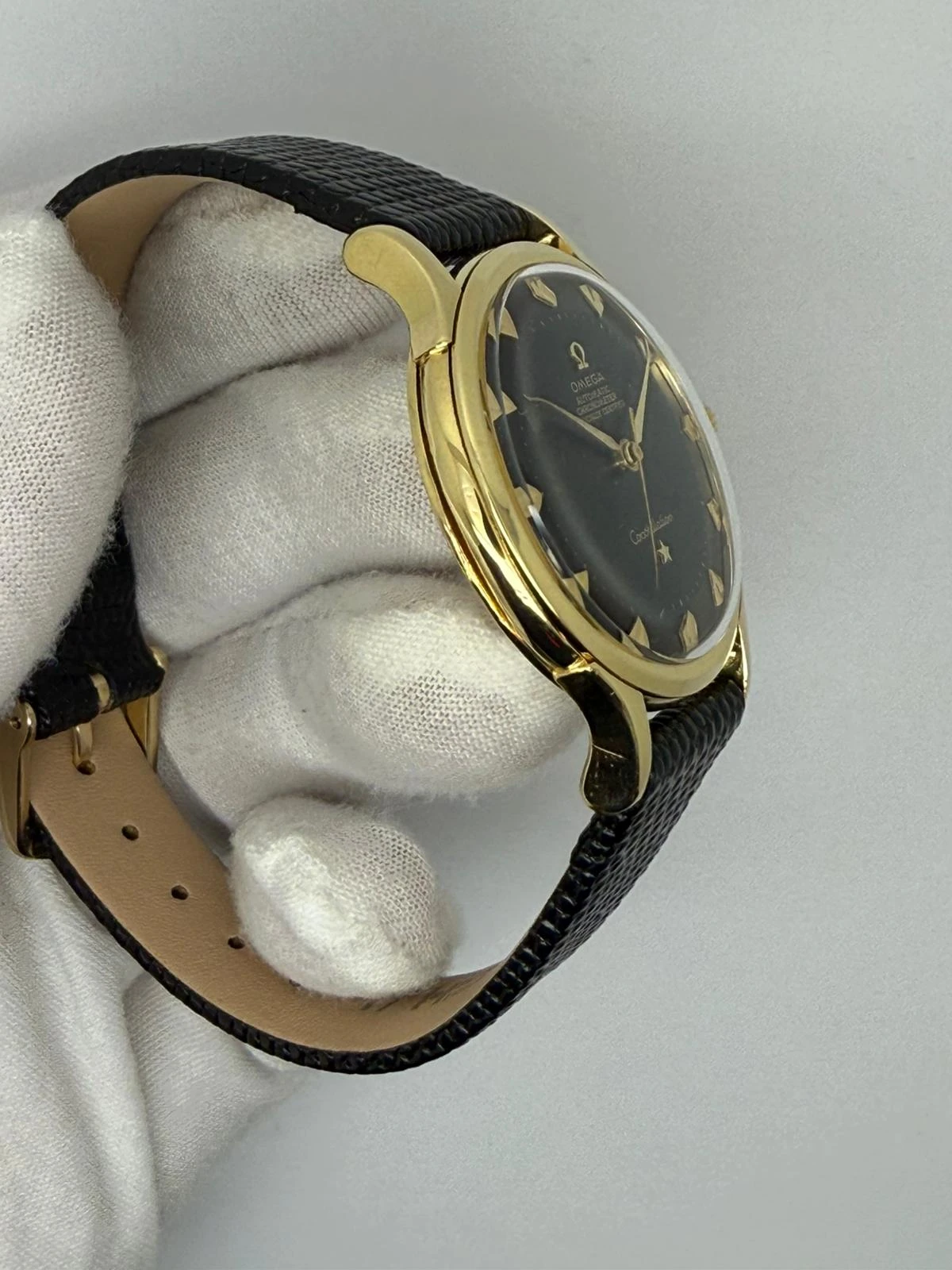 Omega Constellation De Luxe 33.5mm 18ct Gold Black Pie Pan Dial Reference 2700SC – Vintage Box – 1952