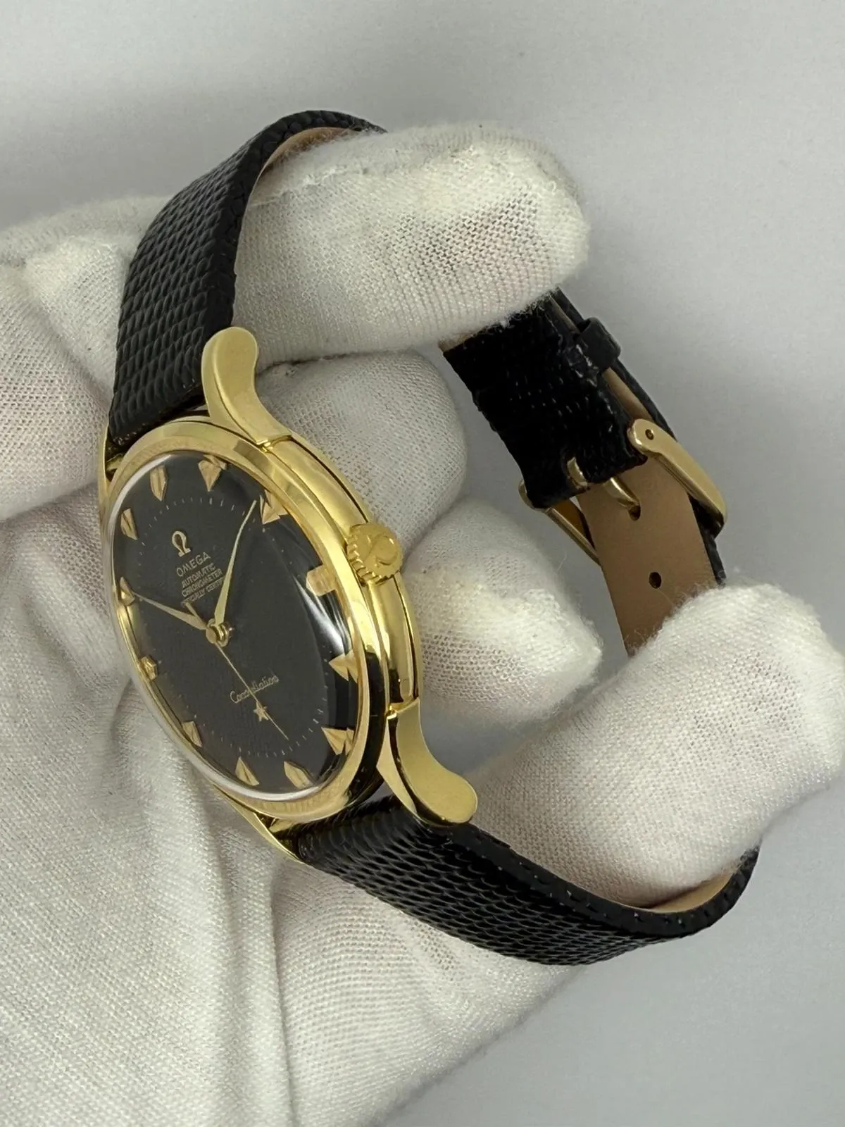 This 1952 Omega Constellation De Luxe, reference 2700SC, is a superb and rare example of one of Omega’s most celebrated chronometer watches. Crafted in solid 18ct yellow gold, the 33.5mm case houses a striking black pie pan dial, beautifully detailed with arrowhead hour markers and dagger hands — an iconic combination that epitomises early Constellation design.