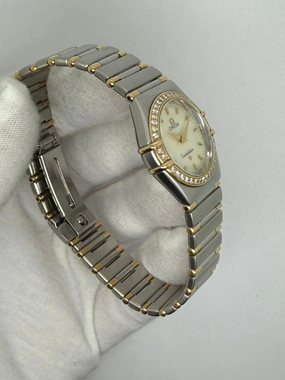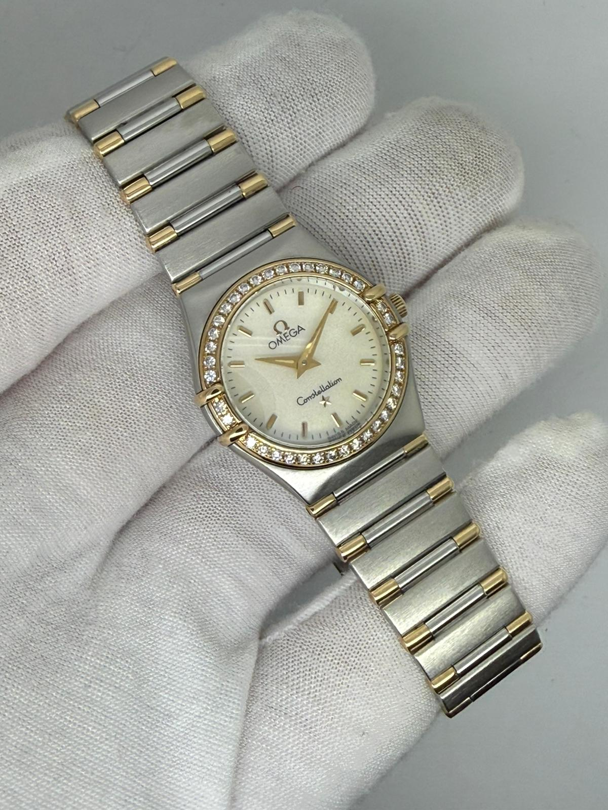 This elegant 1996 Omega Ladies Constellation, reference 1377.70.00, features a refined 25.5mm stainless steel and 18ct yellow gold case enhanced by a diamond-set bezel and a beautiful mother of pearl dial, creating a luxurious and timeless aesthetic.