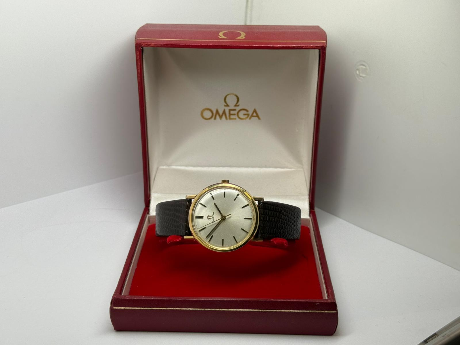 Powered by the reliable Omega Calibre 601 manual wind movement, this watch has been fully serviced and is offered with a two-year guarantee for complete peace of mind. It is fitted with a new Hirsch genuine lizard strap, complementing the warmth of the gold-capped case while maintaining a smart, period-correct aesthetic. Presented with a vintage Omega box, this piece represents an excellent opportunity to own an authentic Omega from a celebrated era.