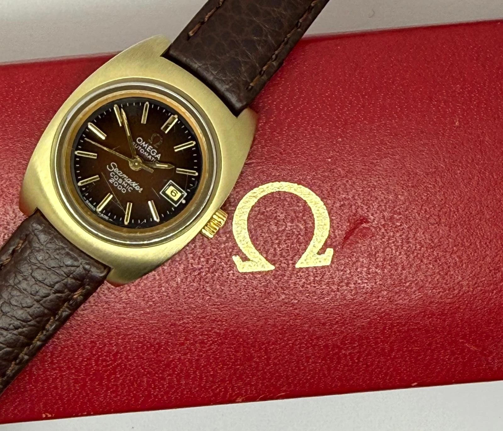This charming Omega Seamaster Cosmic 2000 Ladies Automatic Date is a fine example of Omega’s 1970s design — compact, elegant, and full of vintage character. Crafted from stainless steel and gold, the 26mm case offers a beautifully balanced profile that remains timeless in appearance.