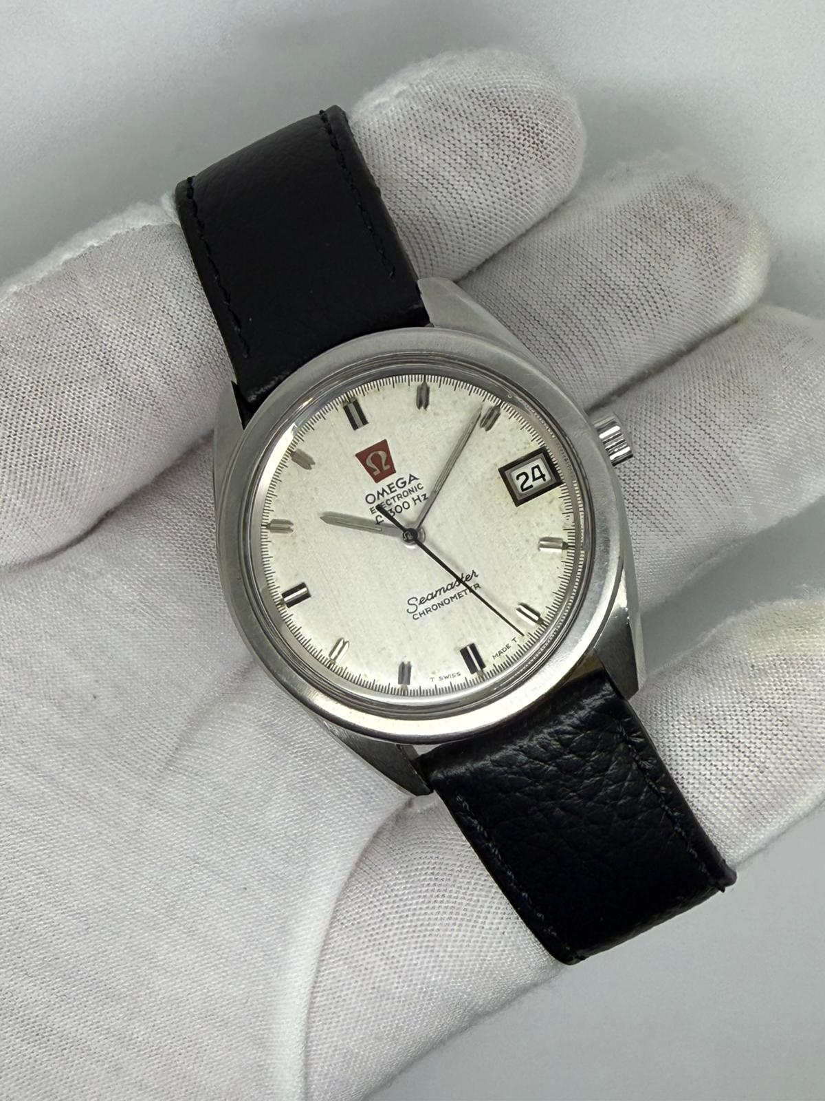 This fascinating 1970 Omega Seamaster f300 Hz Electronic Chronometer, reference 198.001, features a classic 36mm stainless steel case paired with a stunning silver dial, representing a unique era of innovation in Swiss watchmaking.
