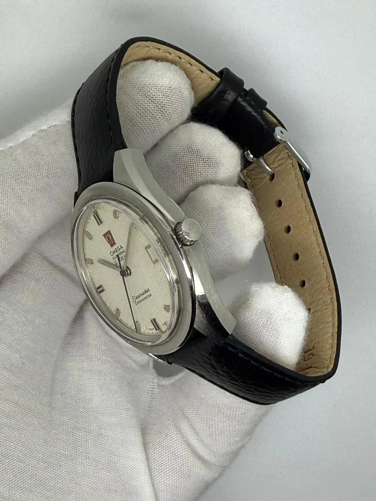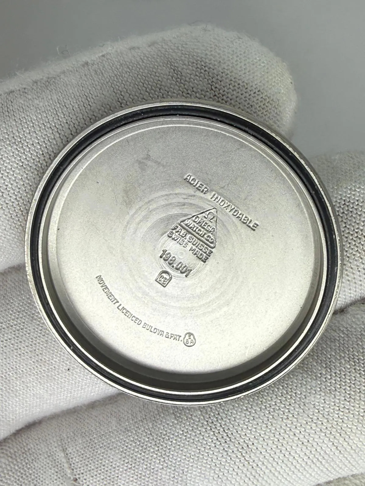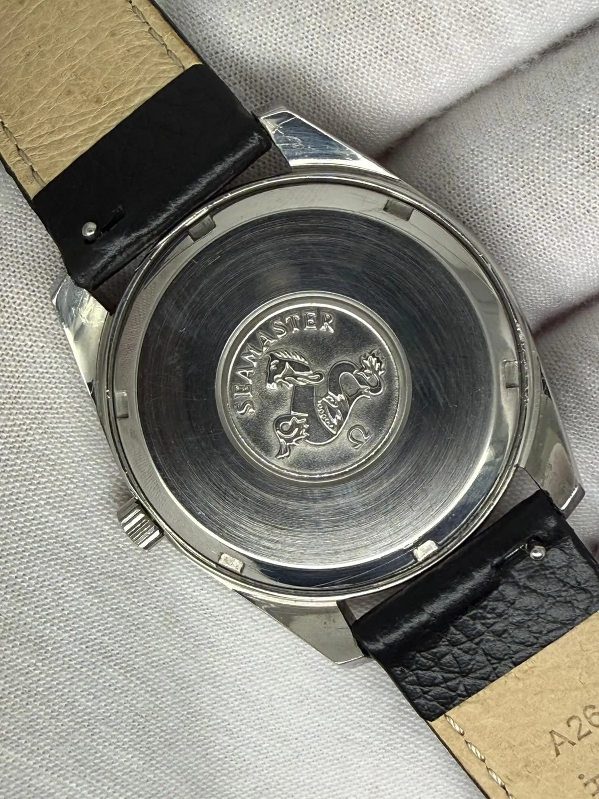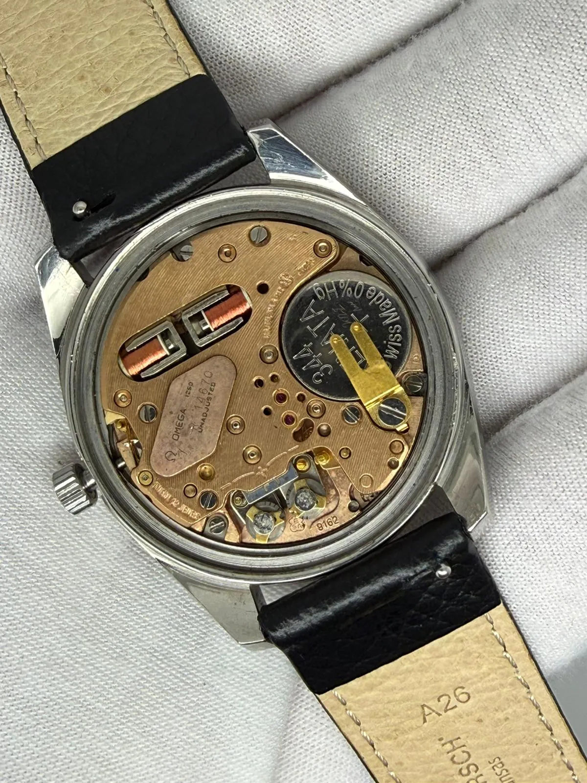 Powered by the Calibre 1250 electronic tuning fork chronometer movement (Bulova ESA 9162), this watch offers the distinctive smooth sweep associated with tuning fork technology. It has been fully serviced and is supplied with a two-year guarantee. Presented in excellent condition, it is fitted with a new top quality Hirsch strap and comes complete with a luxury Omega presentation box, making it a superb and highly interesting collector’s piece.