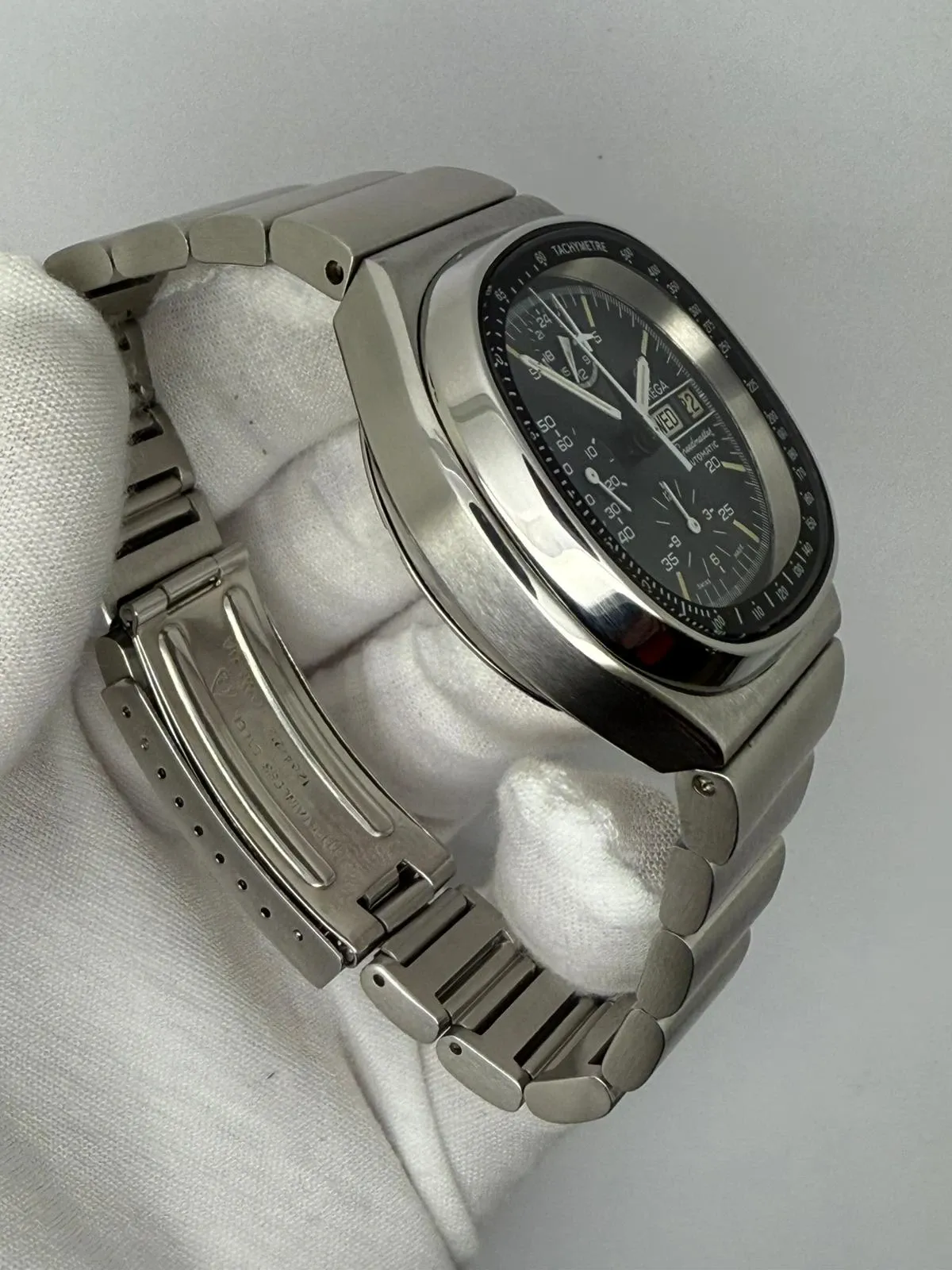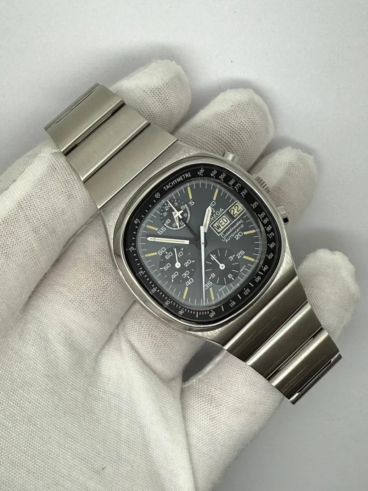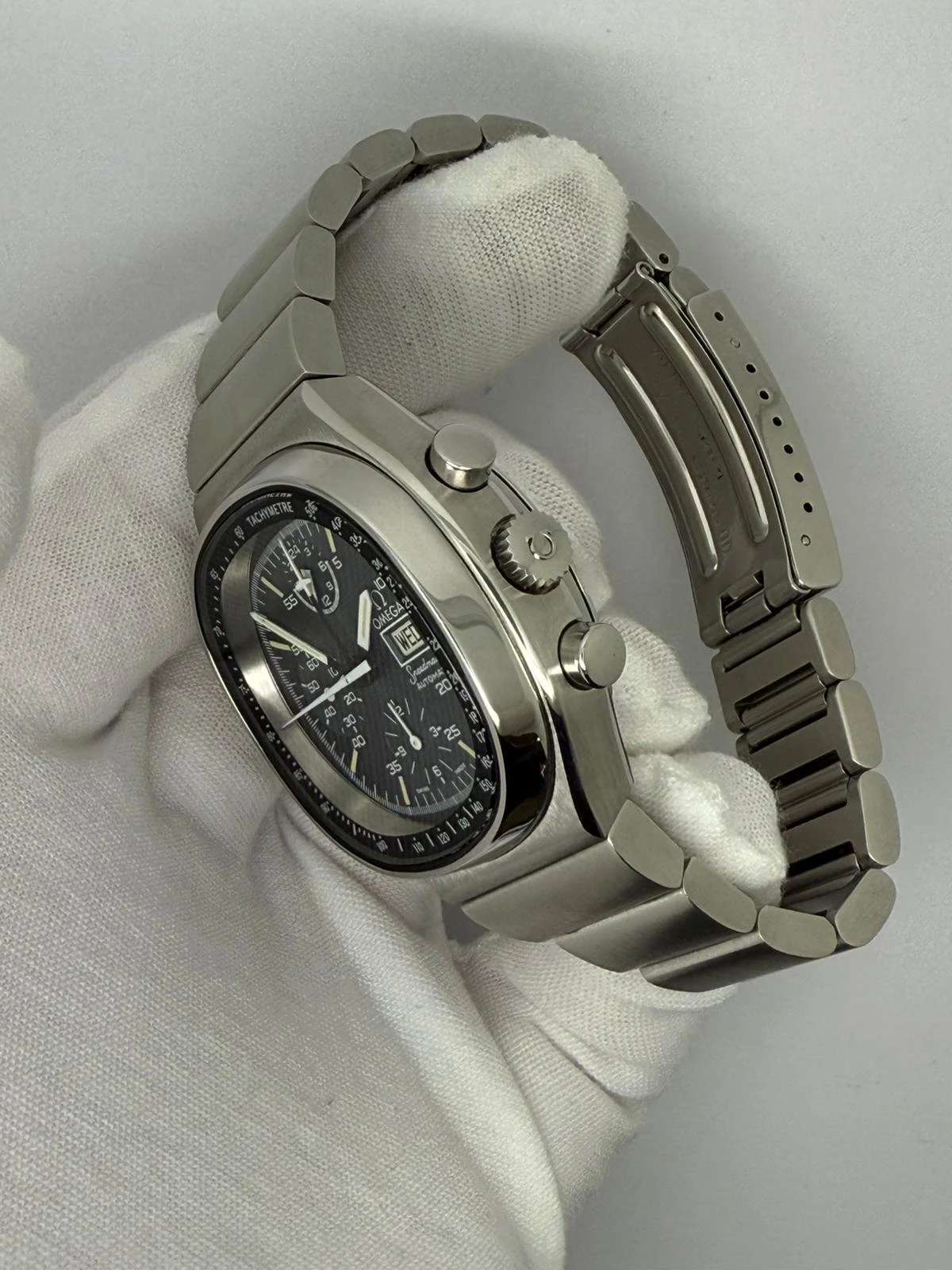 This remarkable Omega Speedmaster Automatic Day-Date “TV Screen”, reference 176.0014, is a rare and highly collectible vintage chronograph from the late 1970s. The distinctive 40mm stainless steel case takes its nickname from the unique television-shaped design, a bold departure from the traditional Speedmaster silhouette.