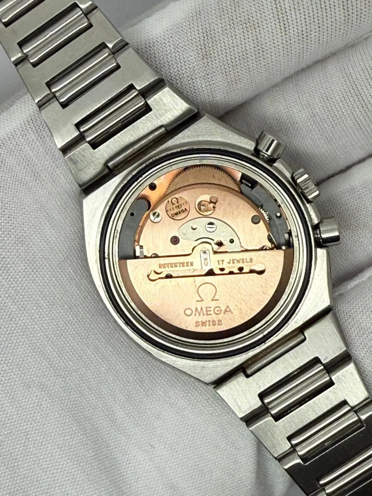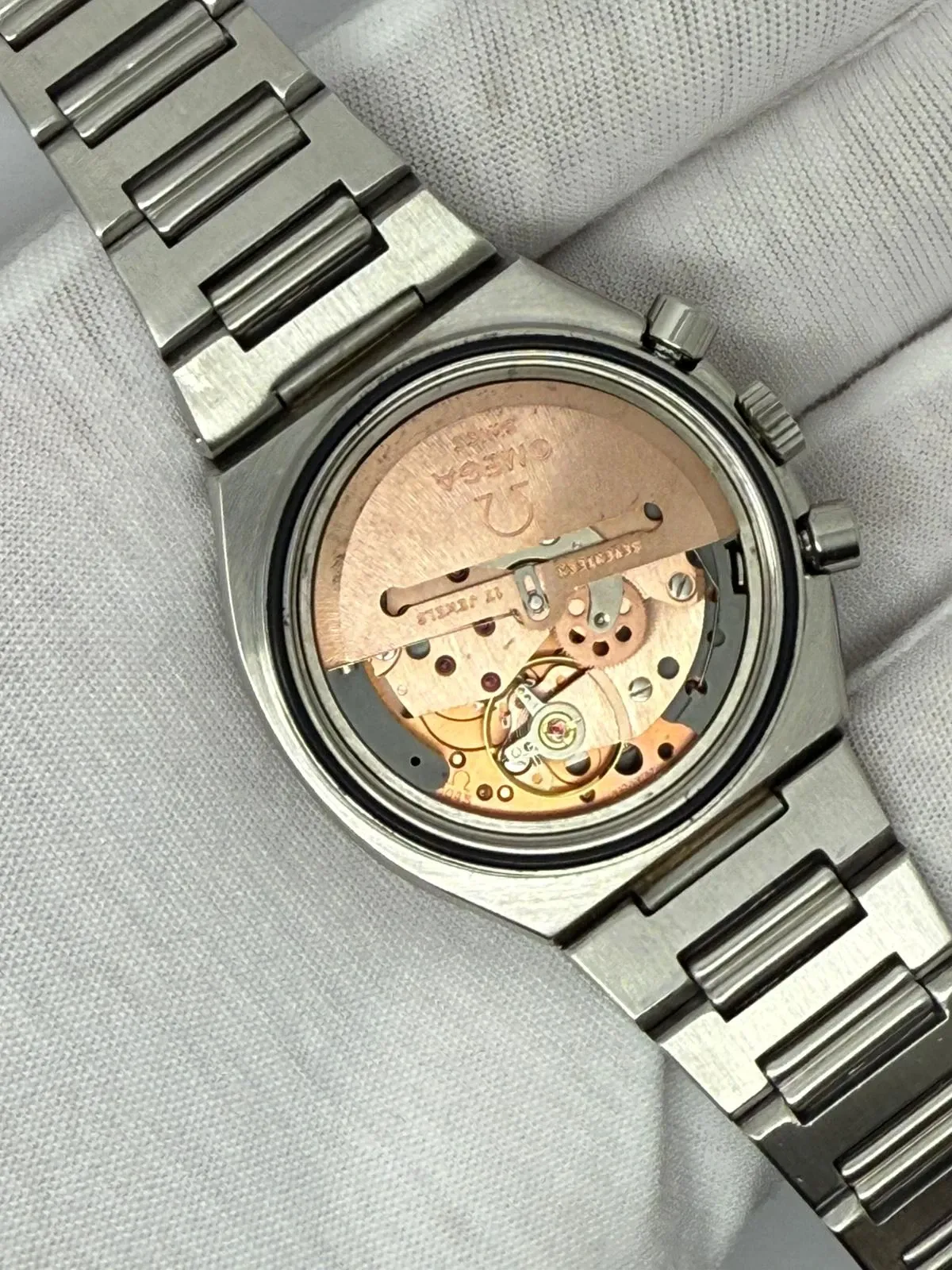 At its heart lies the Omega Calibre 1045 automatic chronograph movement, offering smooth functionality with day, date, and 24-hour indicators. The multi-register silver dial provides excellent legibility and a striking retro aesthetic, all protected by a robust mineral crystal.