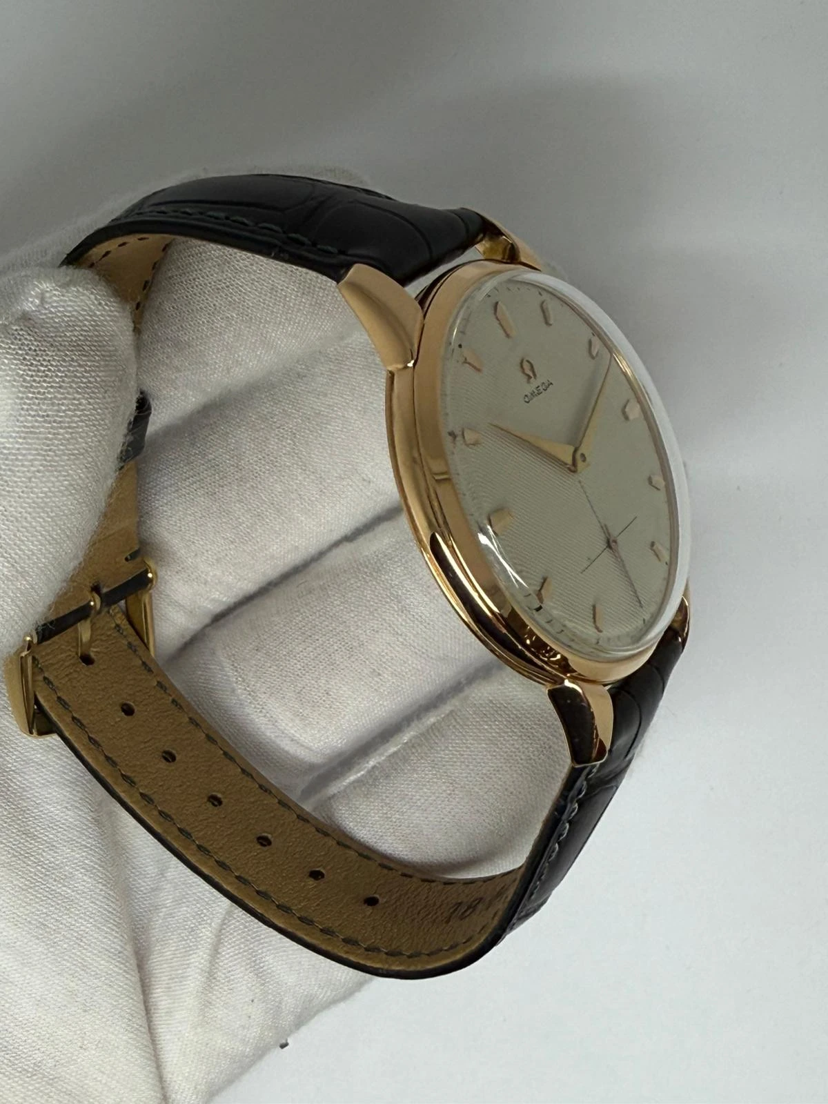 This exceptional 1954 Omega Trésor, reference 2687, features a highly desirable jumbo 37.5mm case crafted in solid 18ct rose gold, paired with a stunning and rare honeycomb dial. Presented in immaculate condition, this watch represents Omega dress watch design at its finest.