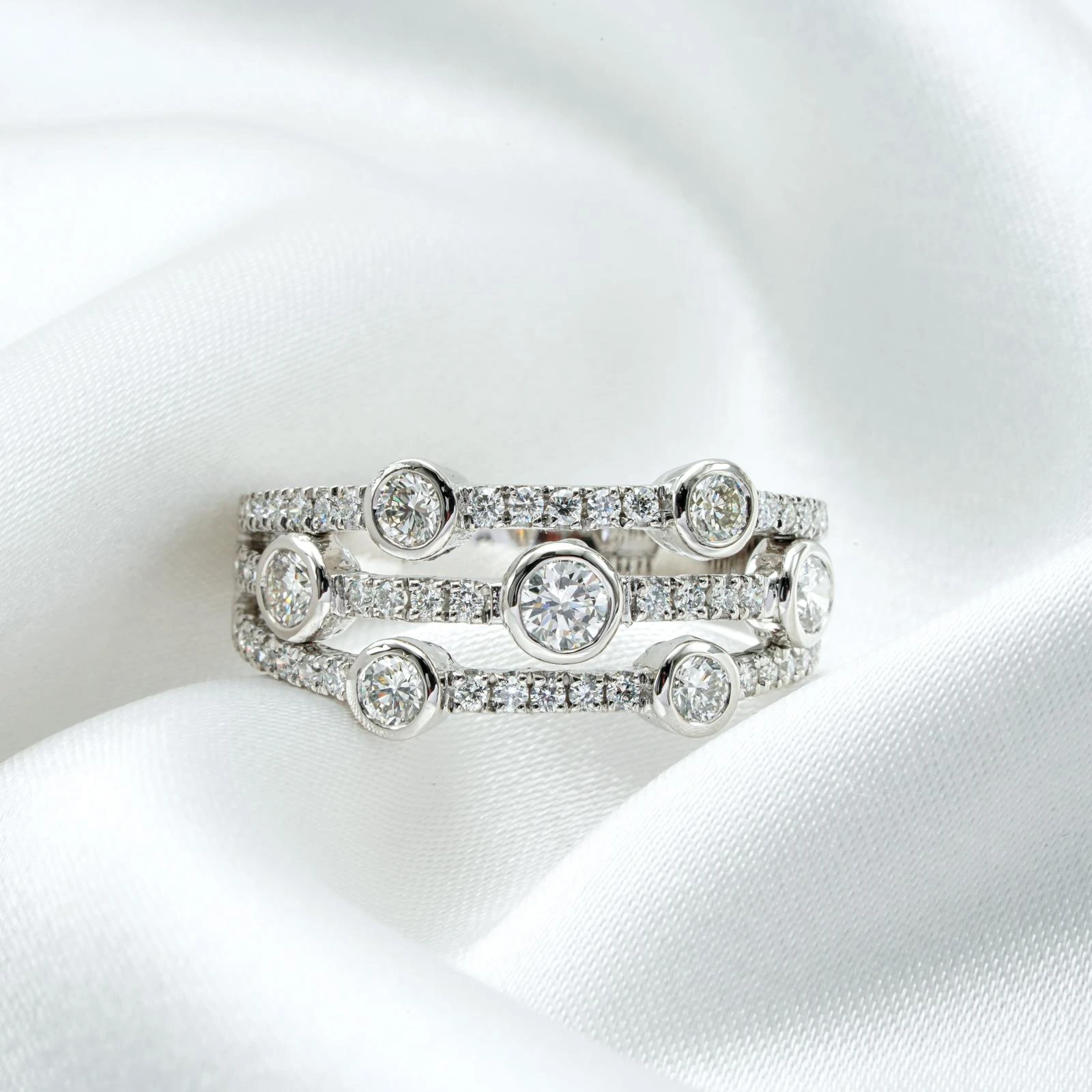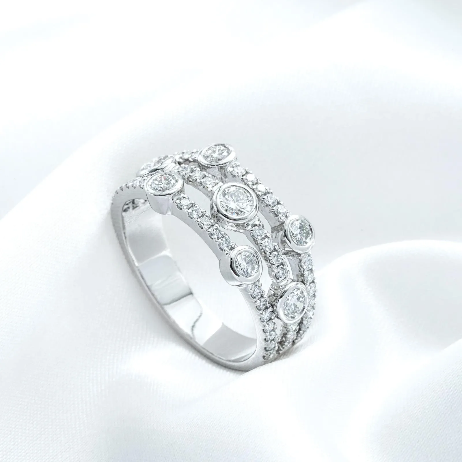 This stunning Platinum Diamond Bubble Ring is a truly distinctive and elegant design, set with a beautiful arrangement of natural round brilliant-cut diamonds totalling 1.20 carats. Graded G/H colour and SI clarity, the diamonds display exceptional brilliance and fire, creating a captivating sparkle from every angle.