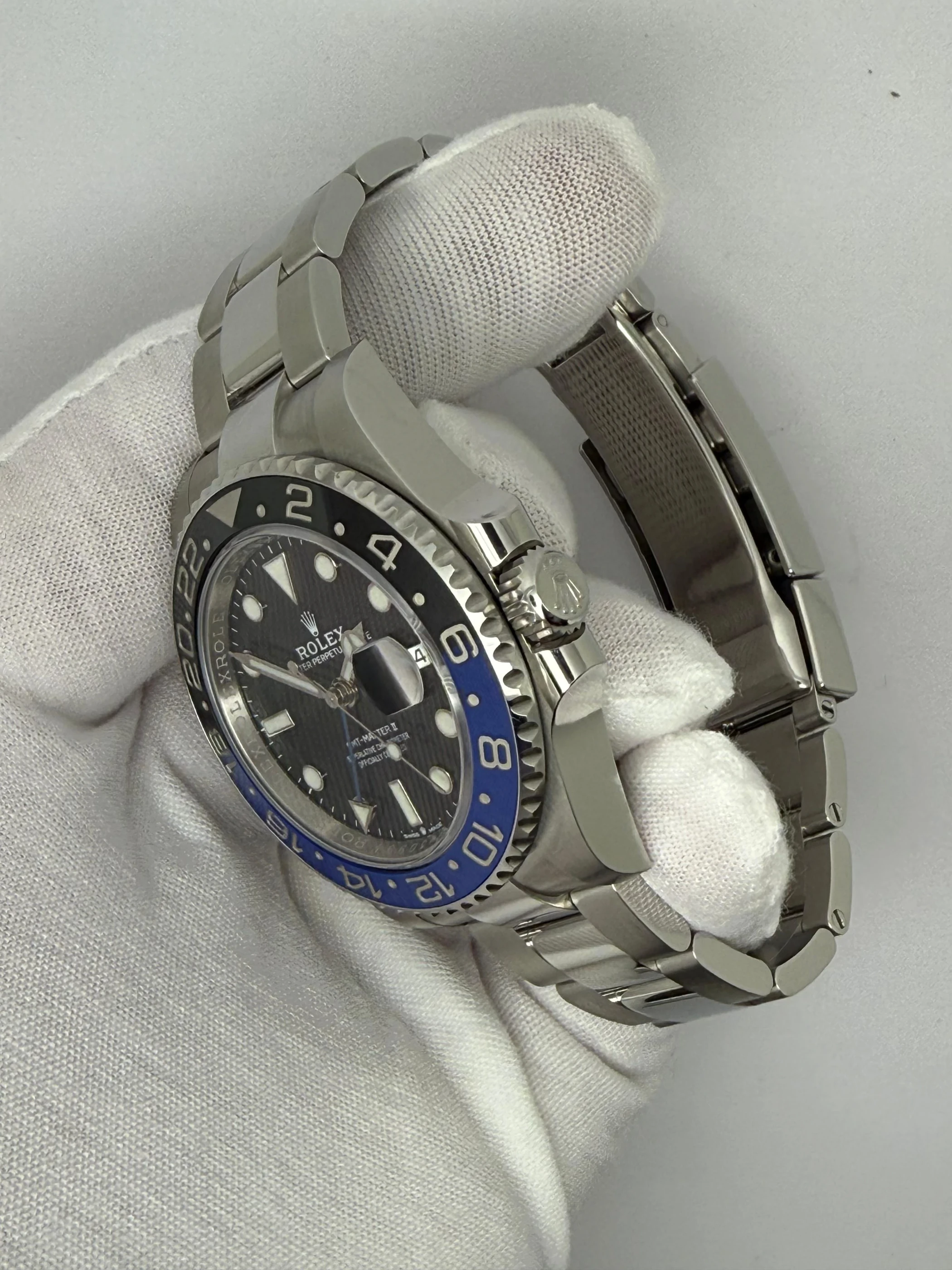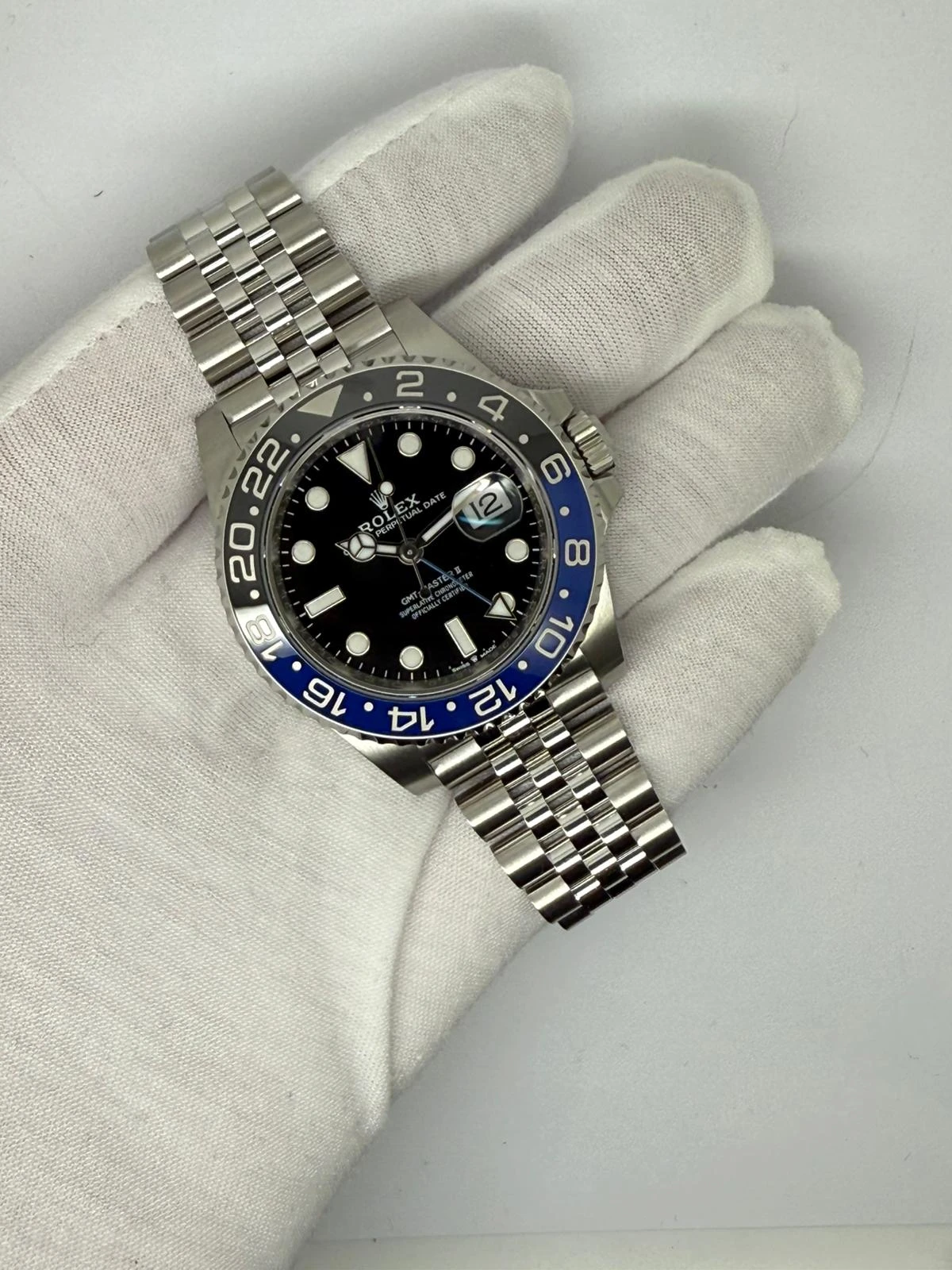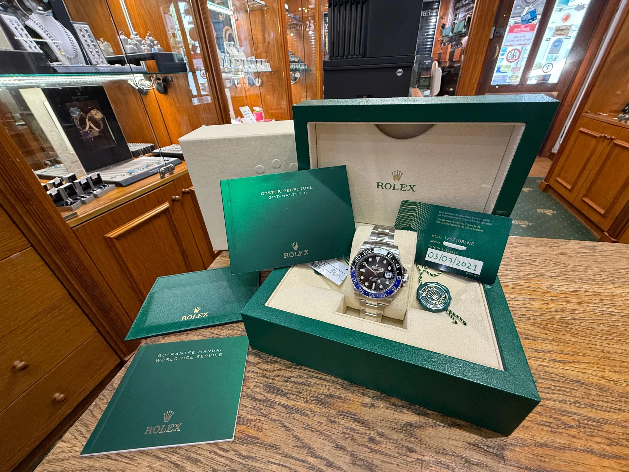 This 2021 Rolex GMT-Master II, reference 126710BLNR, is the iconic “Batman” model, instantly recognisable for its black and blue Cerachrom ceramic bezel. Crafted in 40mm stainless steel, the watch combines robust design with refined styling, making it one of Rolex’s most sought-after sports models. The black dial features luminous hour markers and the signature GMT hand, offering dual time zone functionality — a hallmark of the GMT-Master II collection.
