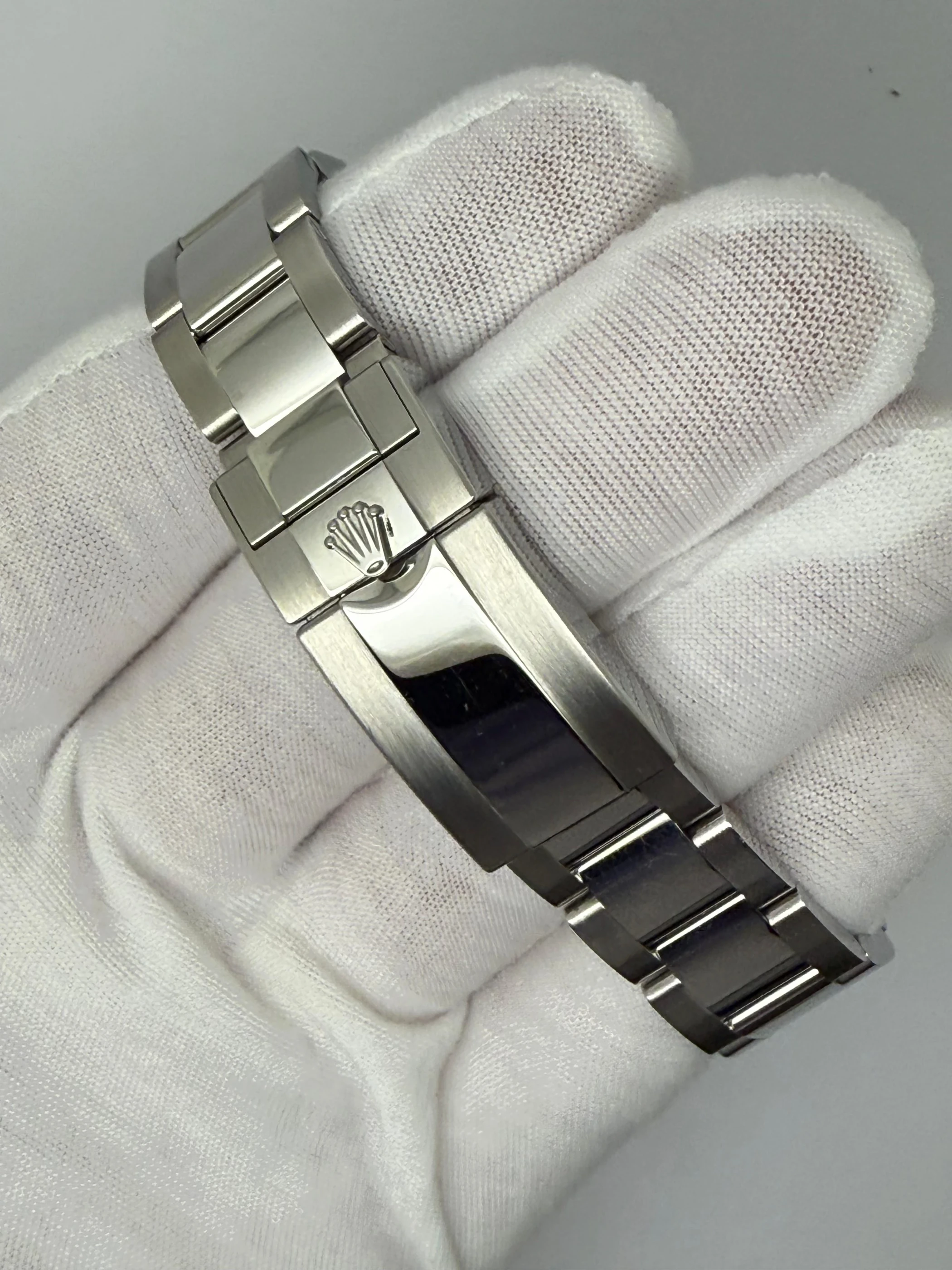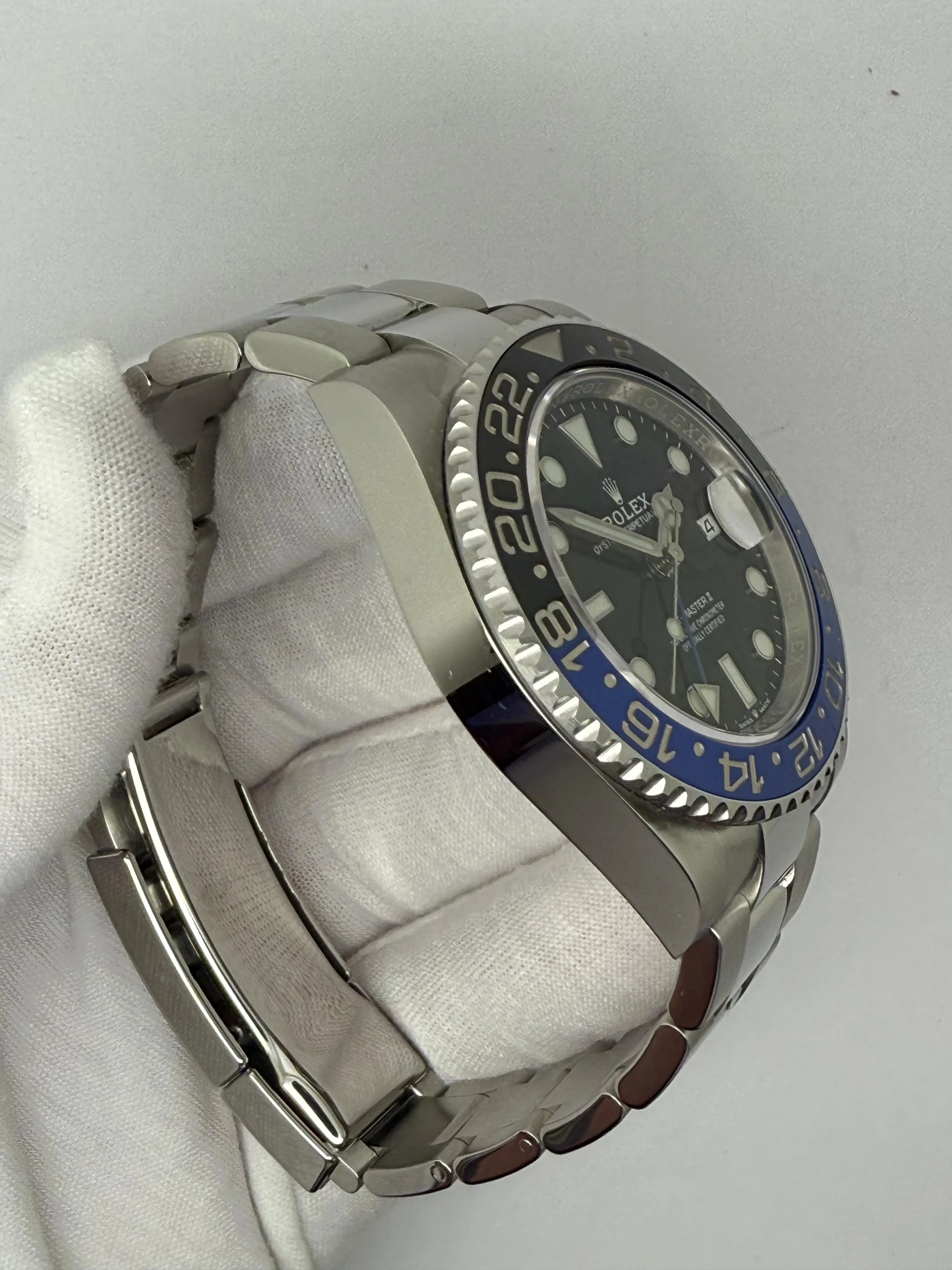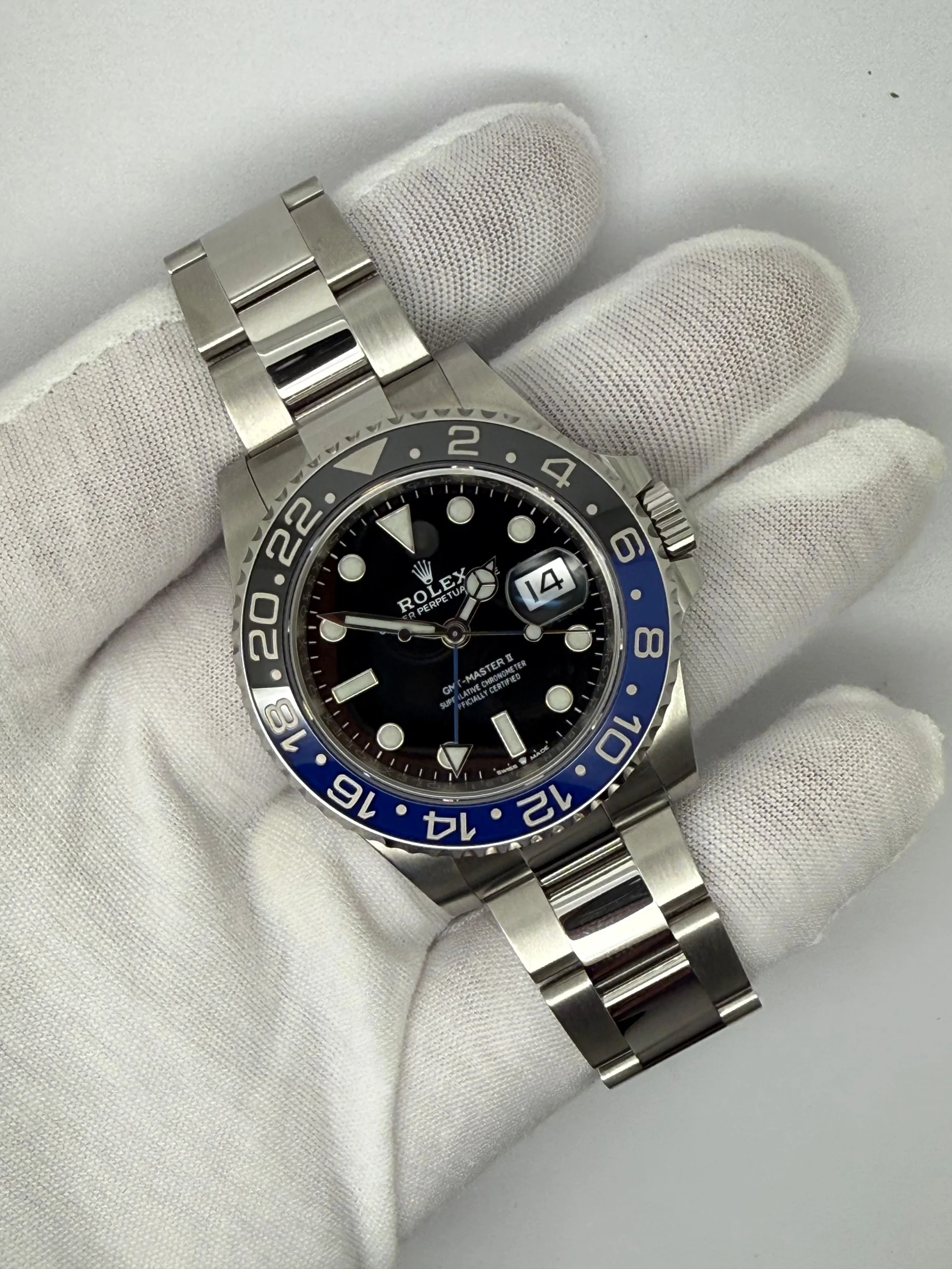 This 2021 Rolex GMT-Master II, reference 126710BLNR, is the iconic “Batman” model, instantly recognisable for its black and blue Cerachrom ceramic bezel. Crafted in 40mm stainless steel, the watch combines robust design with refined styling, making it one of Rolex’s most sought-after sports models. The black dial features luminous hour markers and the signature GMT hand, offering dual time zone functionality — a hallmark of the GMT-Master II collection.