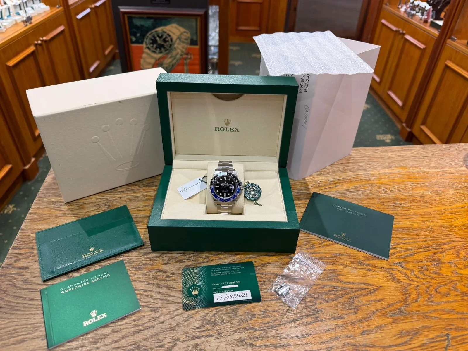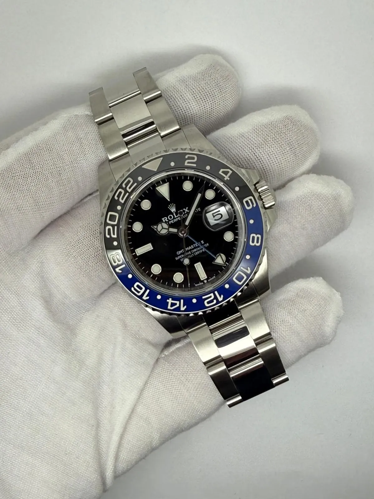 Supplied as a full set with Rolex box and papers and backed by a two-year guarantee, this is an excellent opportunity to secure one of the most sought-after GMT-Master II models.