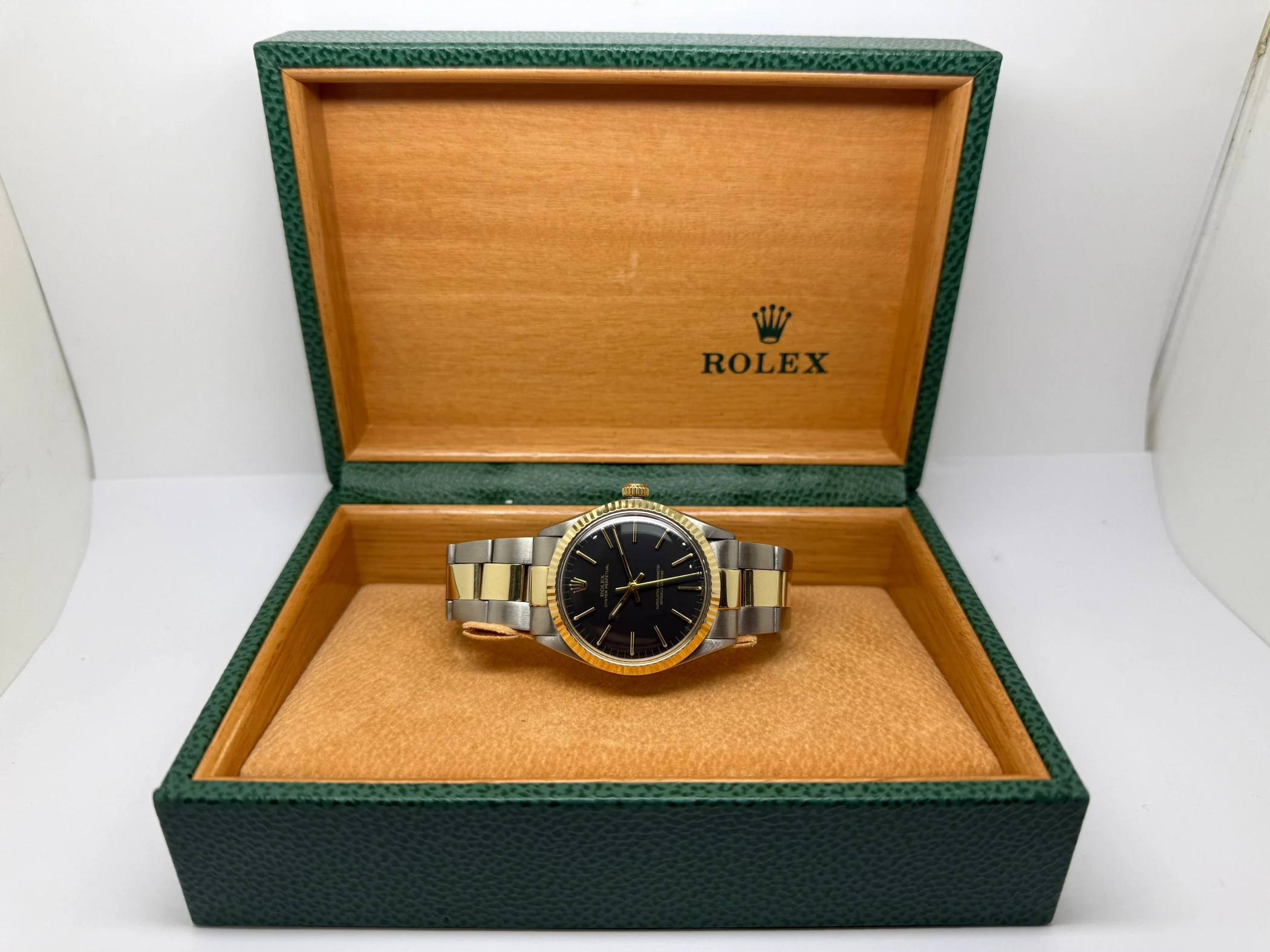 Presented in excellent condition, this Oyster Perpetual comes with a luxury Rolex box and has been fully serviced with a two-year guarantee. A superb example of a vintage Rolex, it embodies the timeless appeal and understated prestige that have made the Oyster Perpetual collection an enduring favourite.