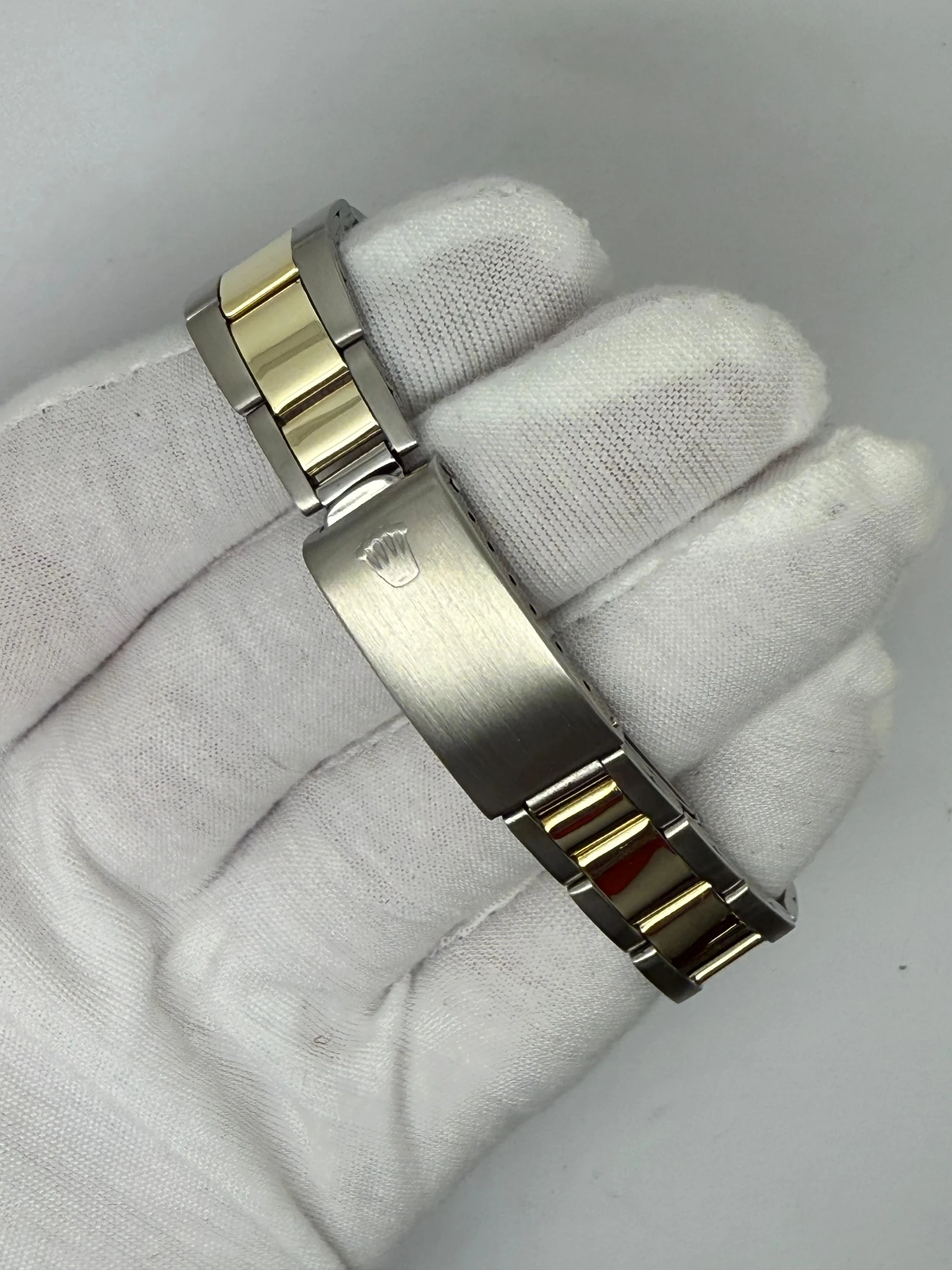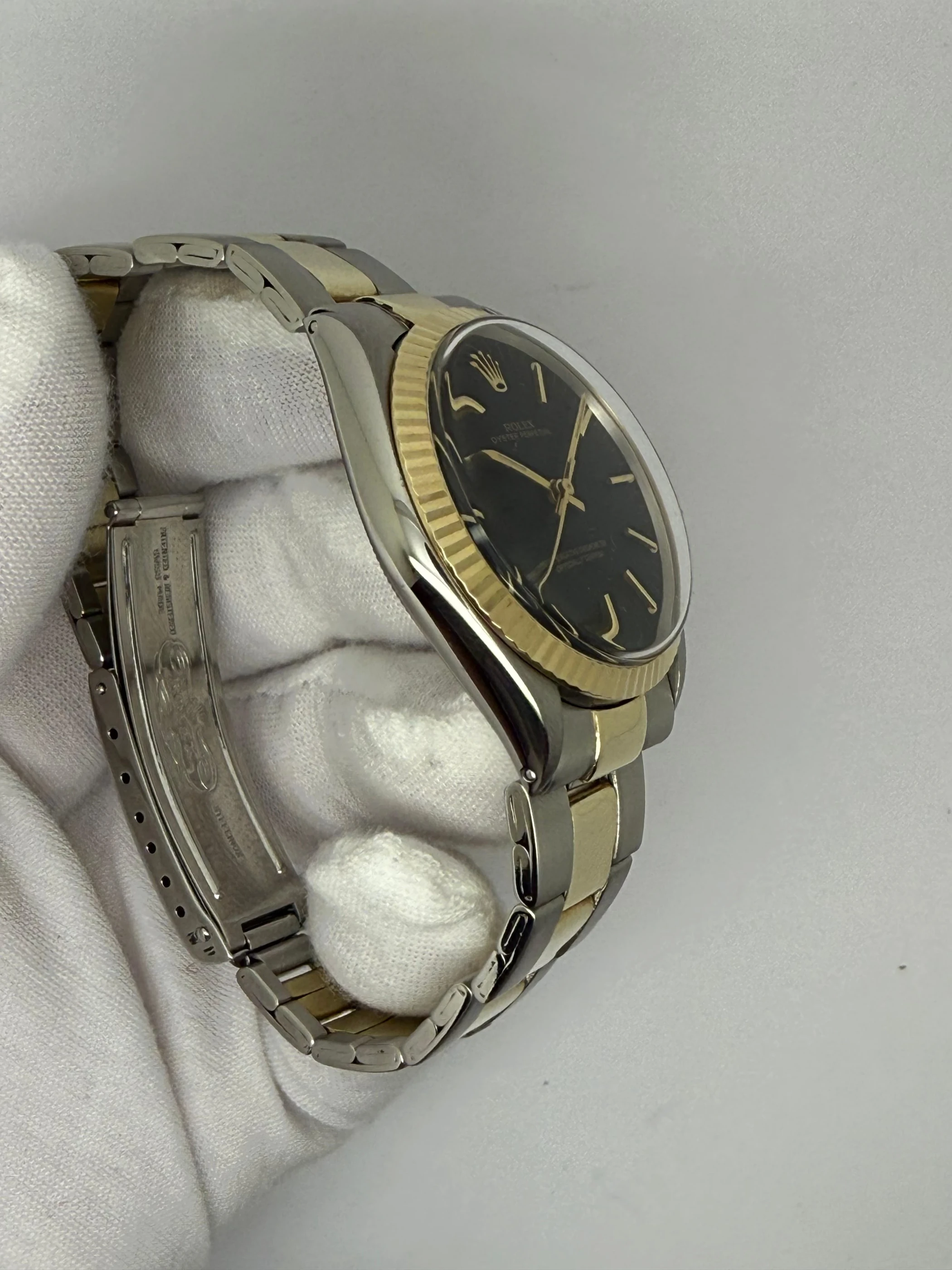 This 1969 Rolex Oyster Perpetual, reference 5500, is a rare and highly collectable vintage model. Measuring 34mm, the watch is crafted in a combination of stainless steel and gold, an unusual configuration that makes it particularly desirable. Its striking black dial offers strong contrast and a touch of elegance, setting it apart from more traditional designs of the era.