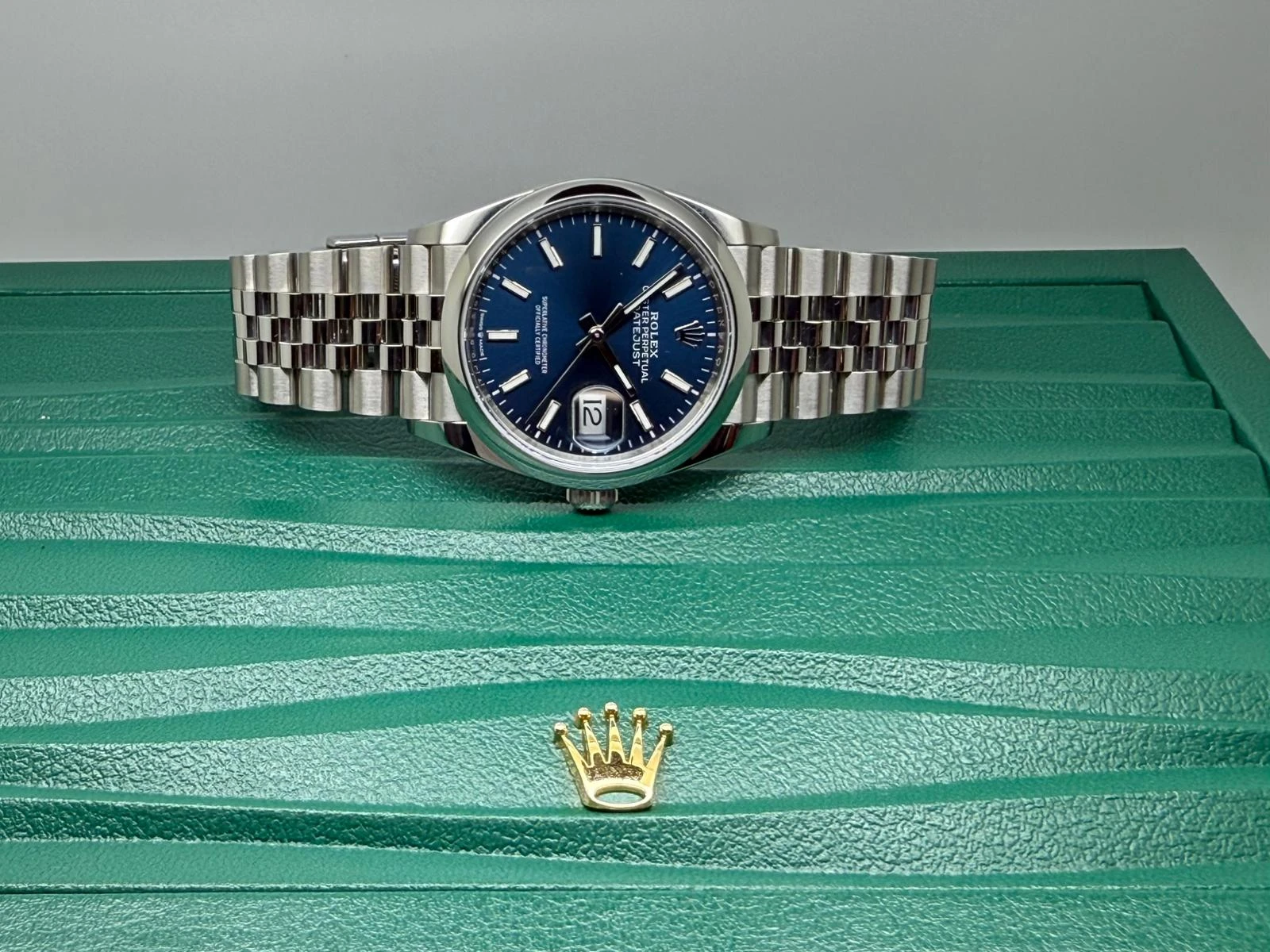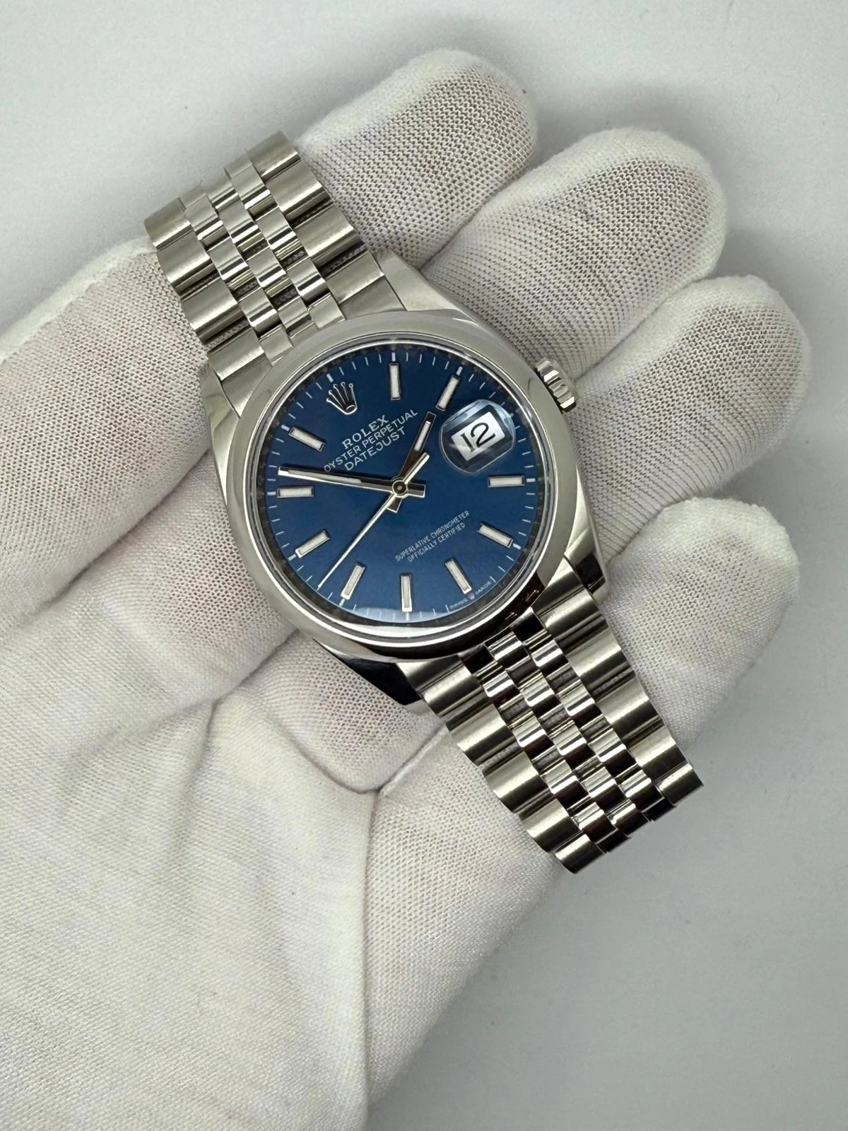 The watch features a stunning blue sunburst dial, giving off a subtle shimmer under changing light. Powered by the Rolex Calibre 3235 automatic movement, it offers outstanding accuracy, reliability, and a 70-hour power reserve — certified as a Superlative Chronometer for exceptional performance.