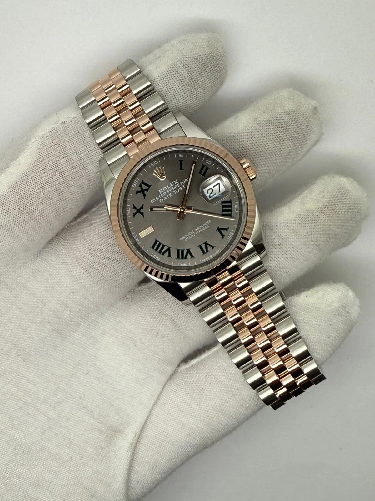 This 2021 Rolex Oyster Perpetual Datejust 36, reference 126231, features a refined blend of stainless steel and 18ct rose gold, paired with the highly sought-after Wimbledon dial. Presented in immaculate condition, this model offers the perfect balance of luxury and everyday wearability.
