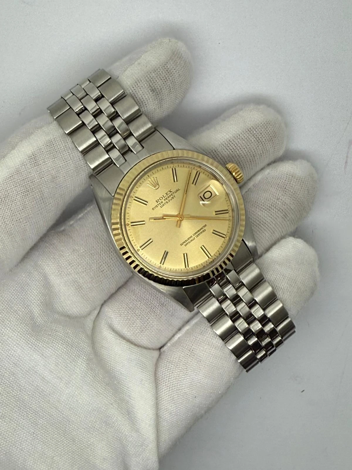 This 1973 Rolex Oyster Perpetual Datejust, reference 1601, is a classic vintage model combining stainless steel with 18ct yellow gold. The 36mm case is fitted with the iconic fluted bezel, while the champagne ‘Sigma’ dial — distinguished by its subtle sigma symbols flanking the “Swiss” text — adds both rarity and vintage charm. Fitted to the original Rolex Jubilee bracelet, the watch offers the timeless Datejust look that has become a cornerstone of Rolex design.