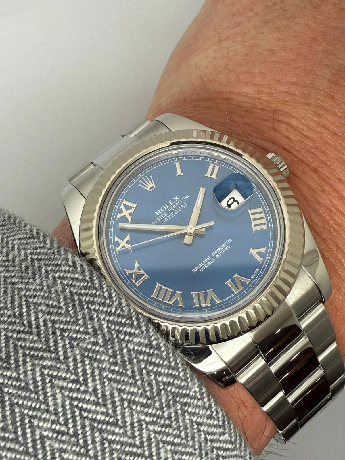 Presented in immaculate condition, this watch comes as a complete collector’s set with its original Rolex box and papers. Fully serviced and accompanied by a two-year guarantee, it stands as an exceptional example of one of Rolex’s most desirable contemporary Datejust references.