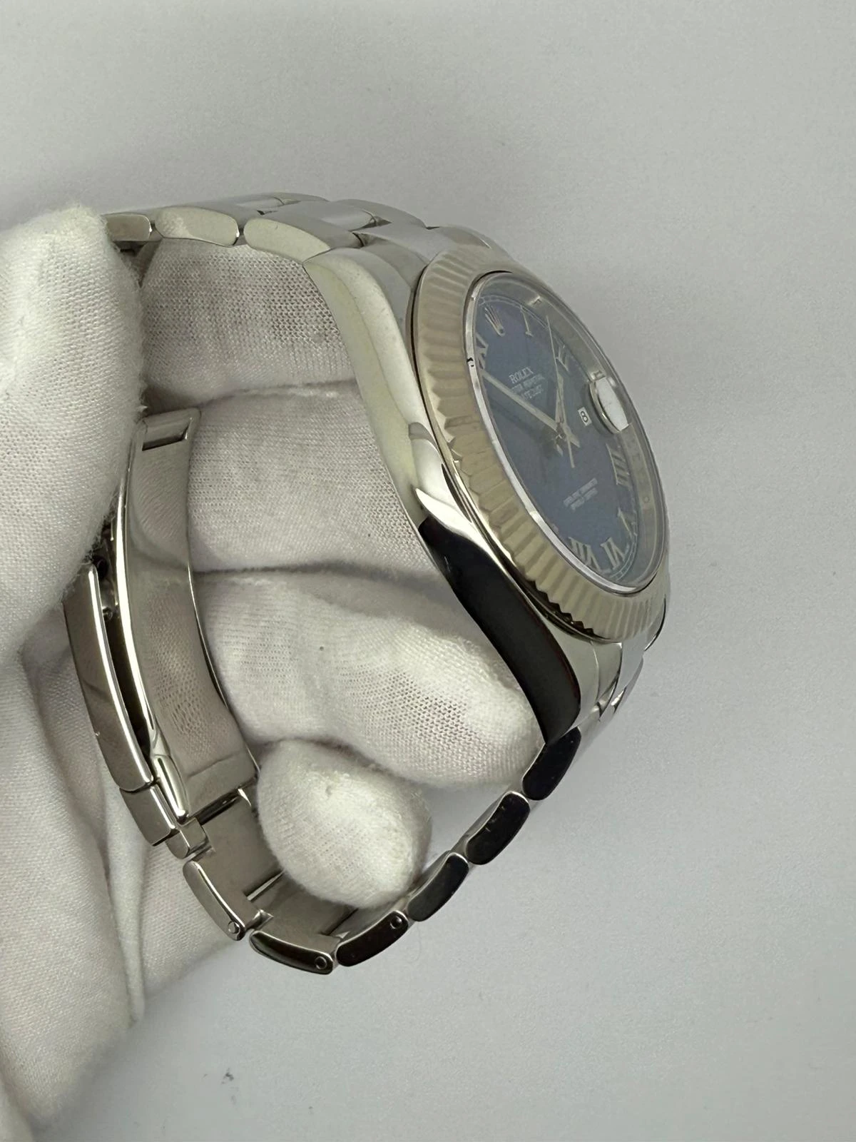 This exceptional Rolex Oyster Perpetual Datejust 41, reference 116334, features the stunning and highly sought-after Azzurro Blue dial, a distinctive shade that beautifully complements the classic fluted 18ct white gold bezel. Crafted from stainless steel, the 41mm case combines elegant design with everyday durability, fitted to a solid Oyster bracelet for a refined yet robust finish.