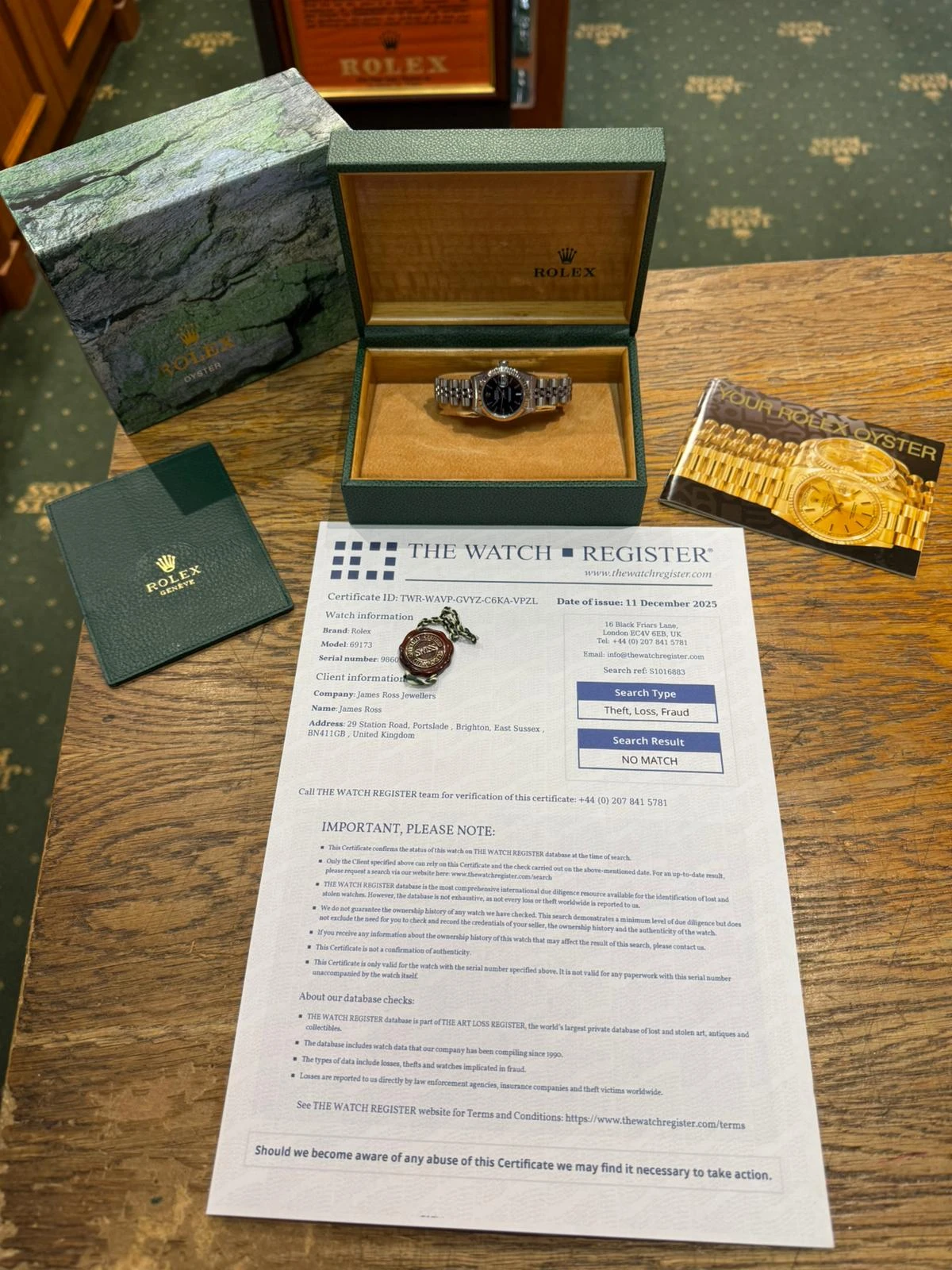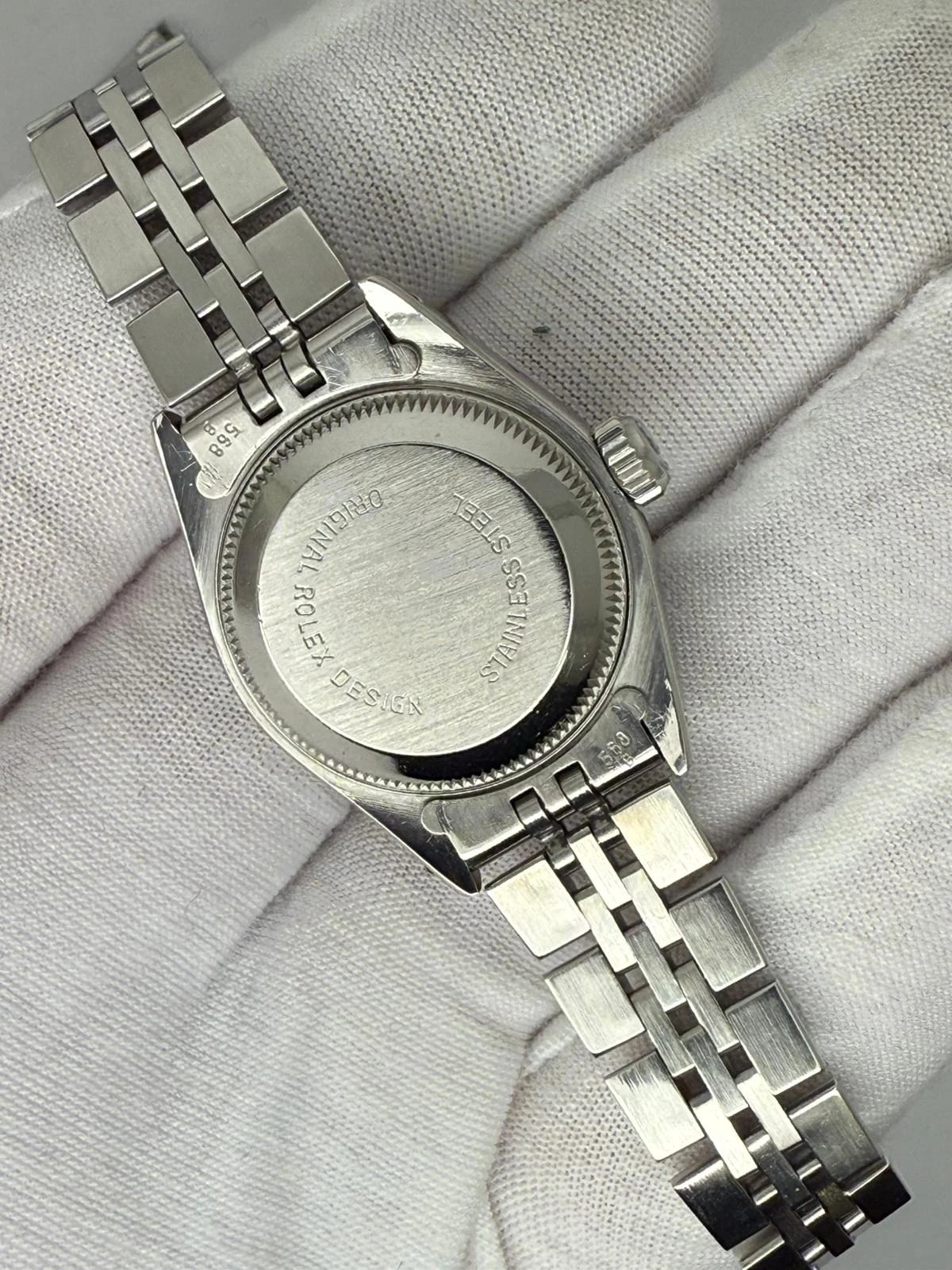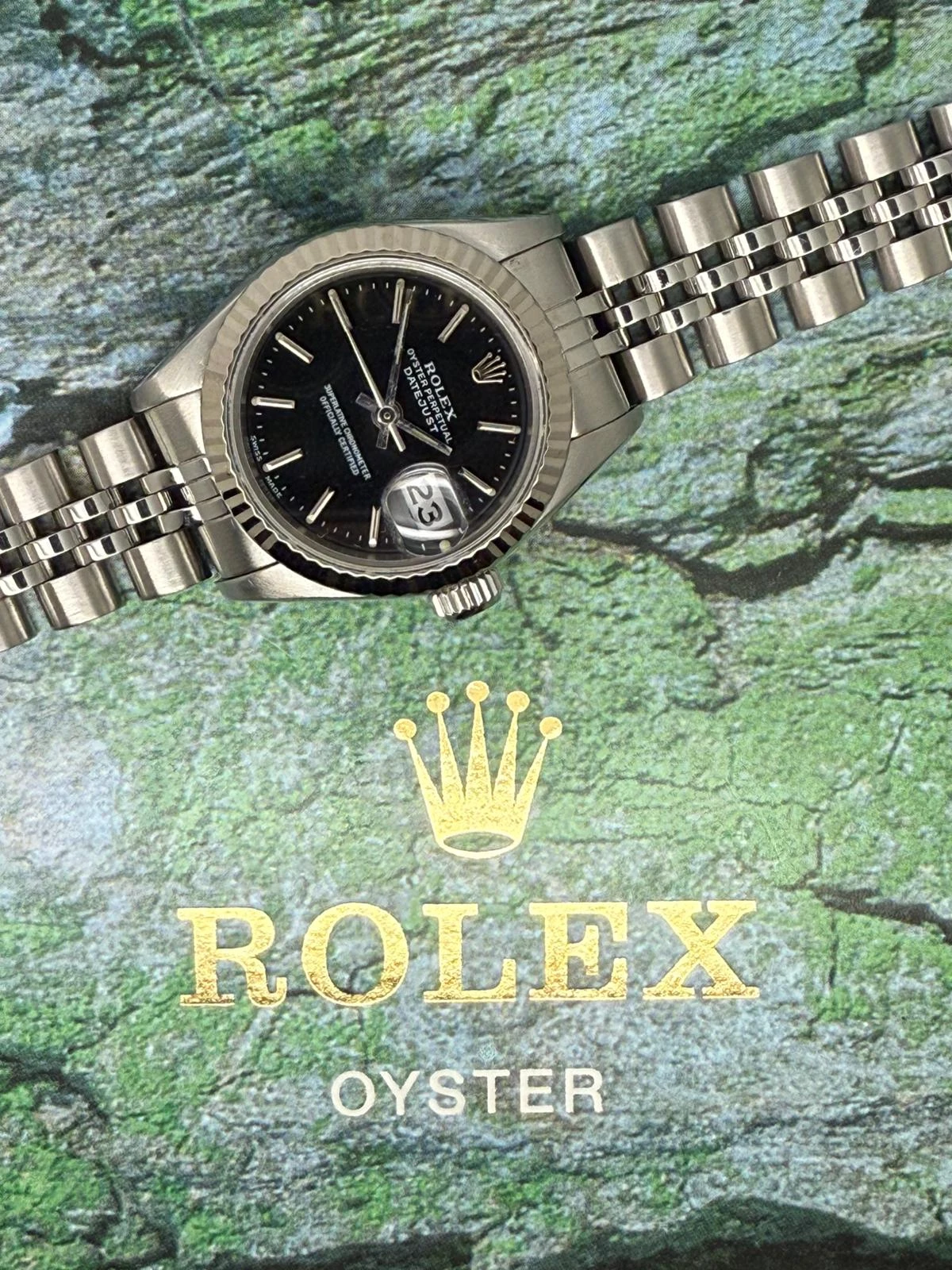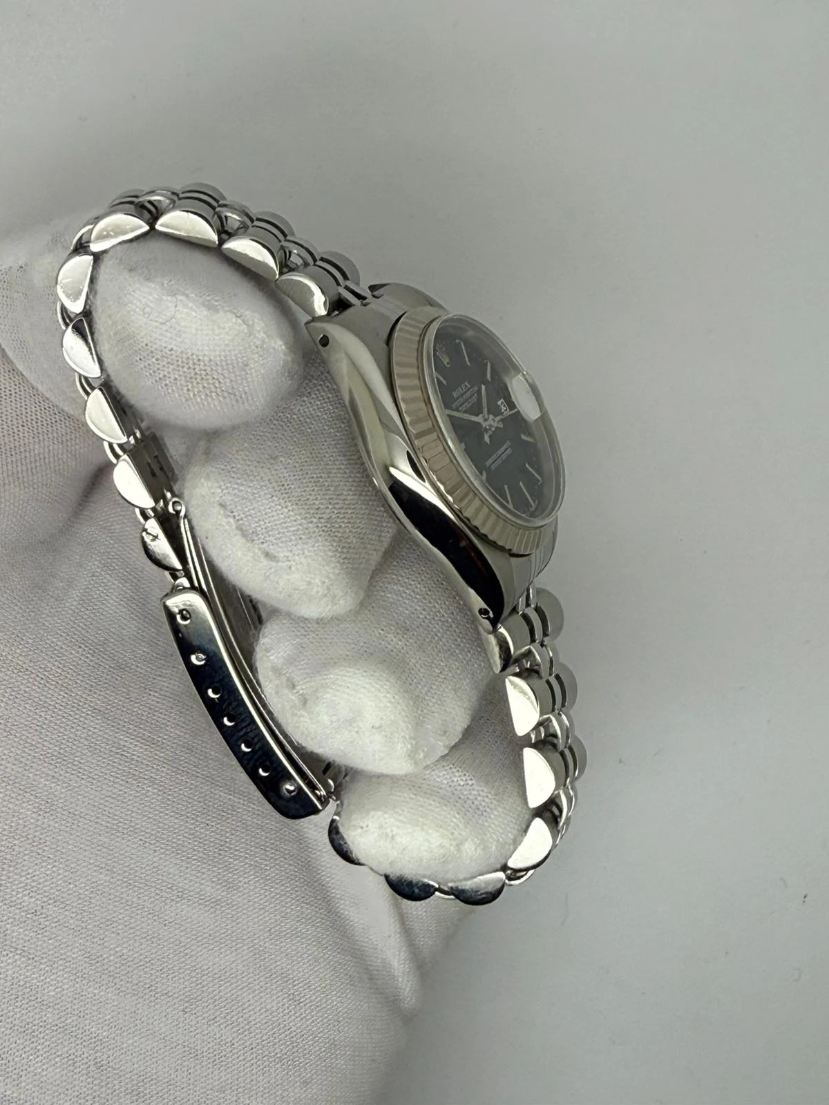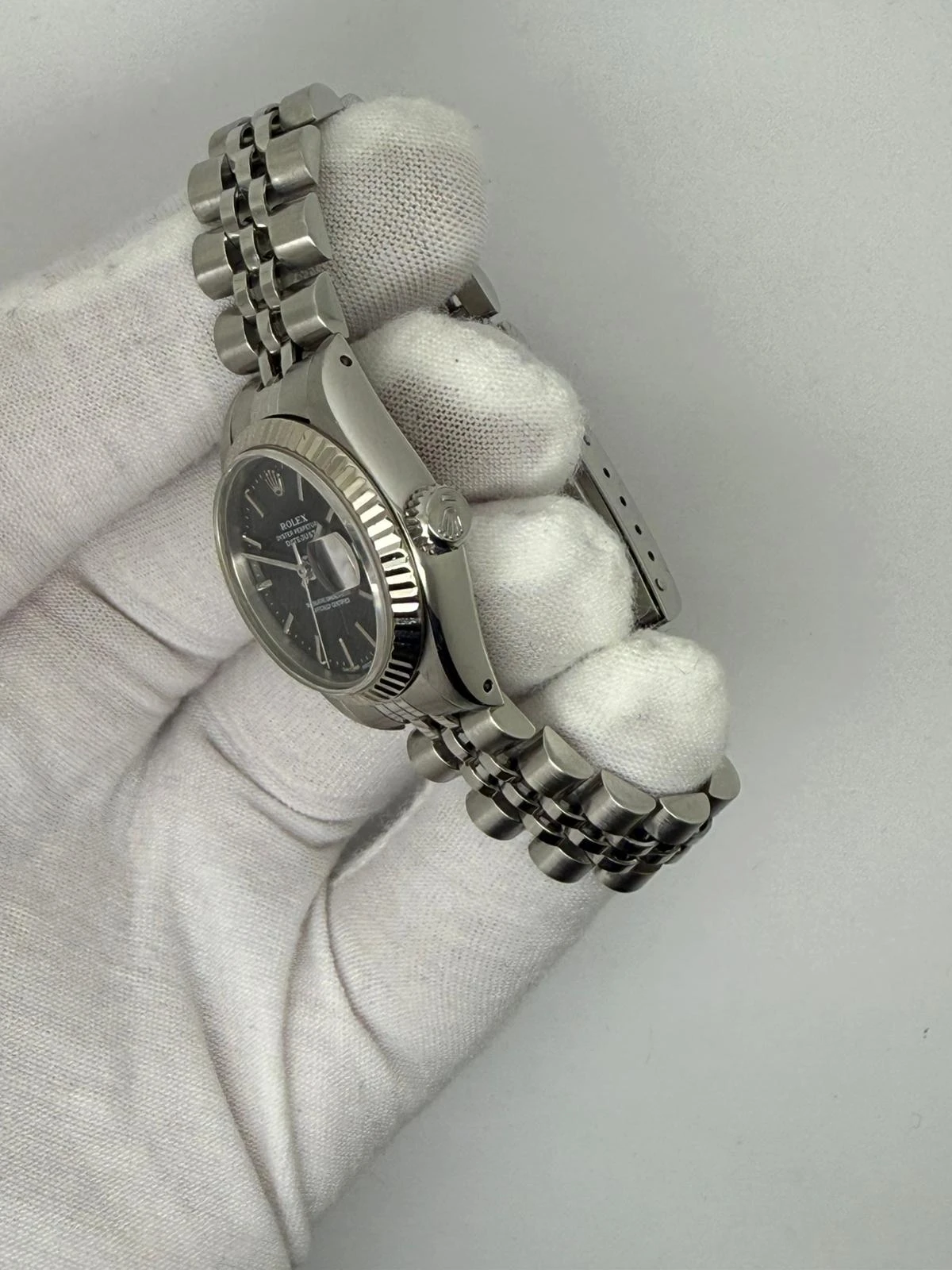 This 1987 Ladies Rolex Oyster Perpetual Datejust, reference 69173, features a classic 26mm stainless steel case with an 18ct yellow gold fluted bezel and elegant Jubilee bracelet. The striking black baton dial gives this model a refined, timeless look.