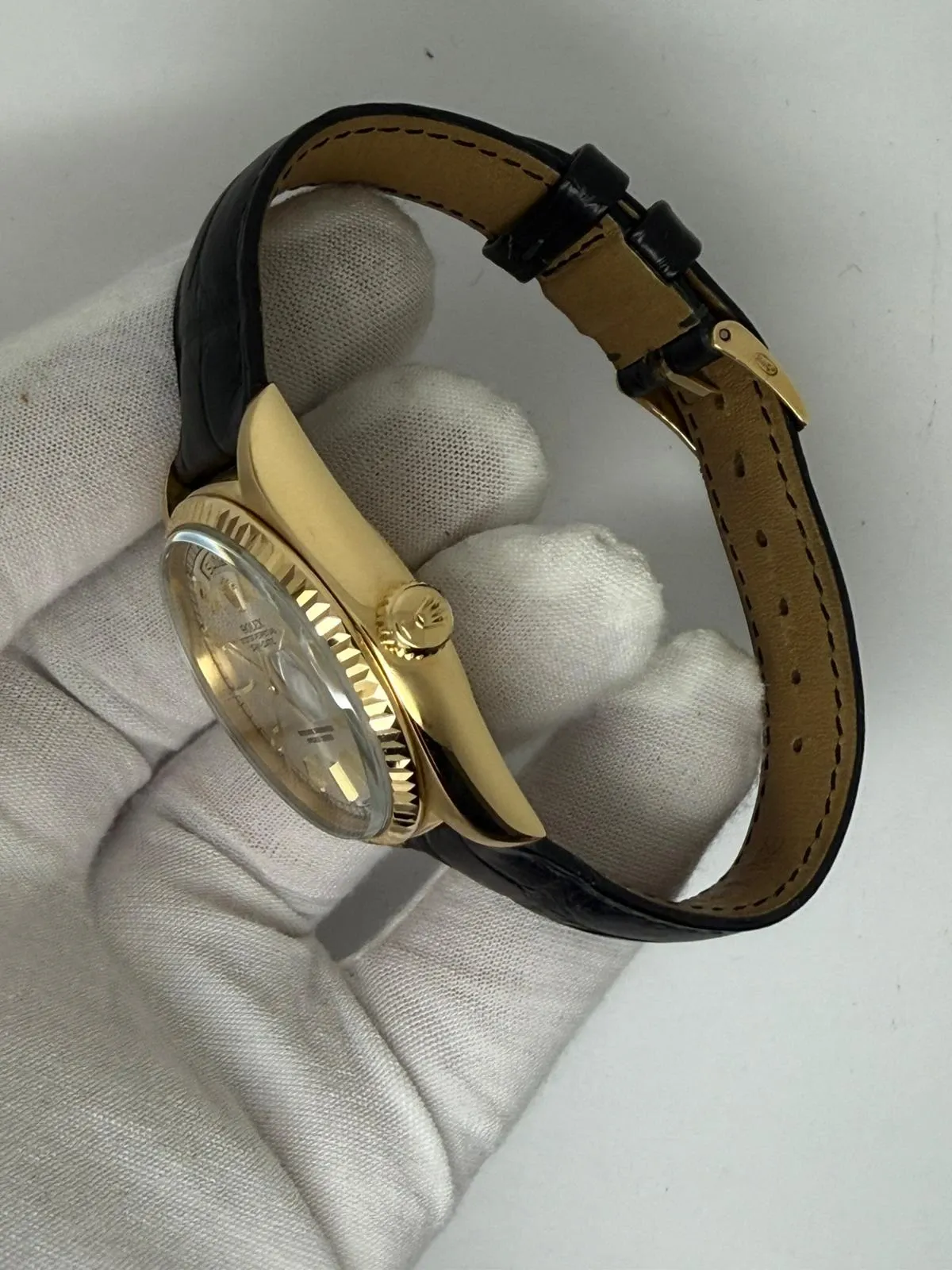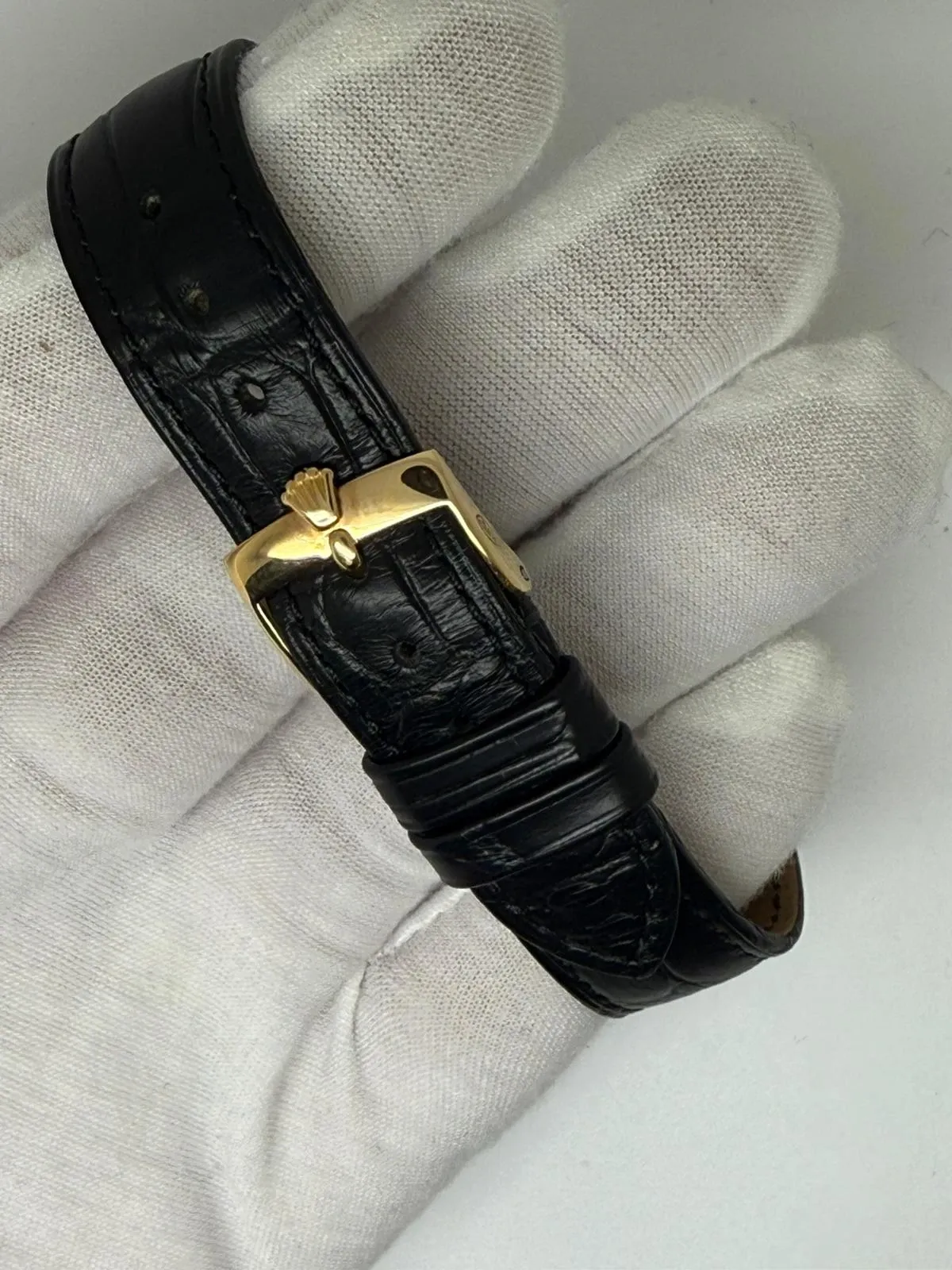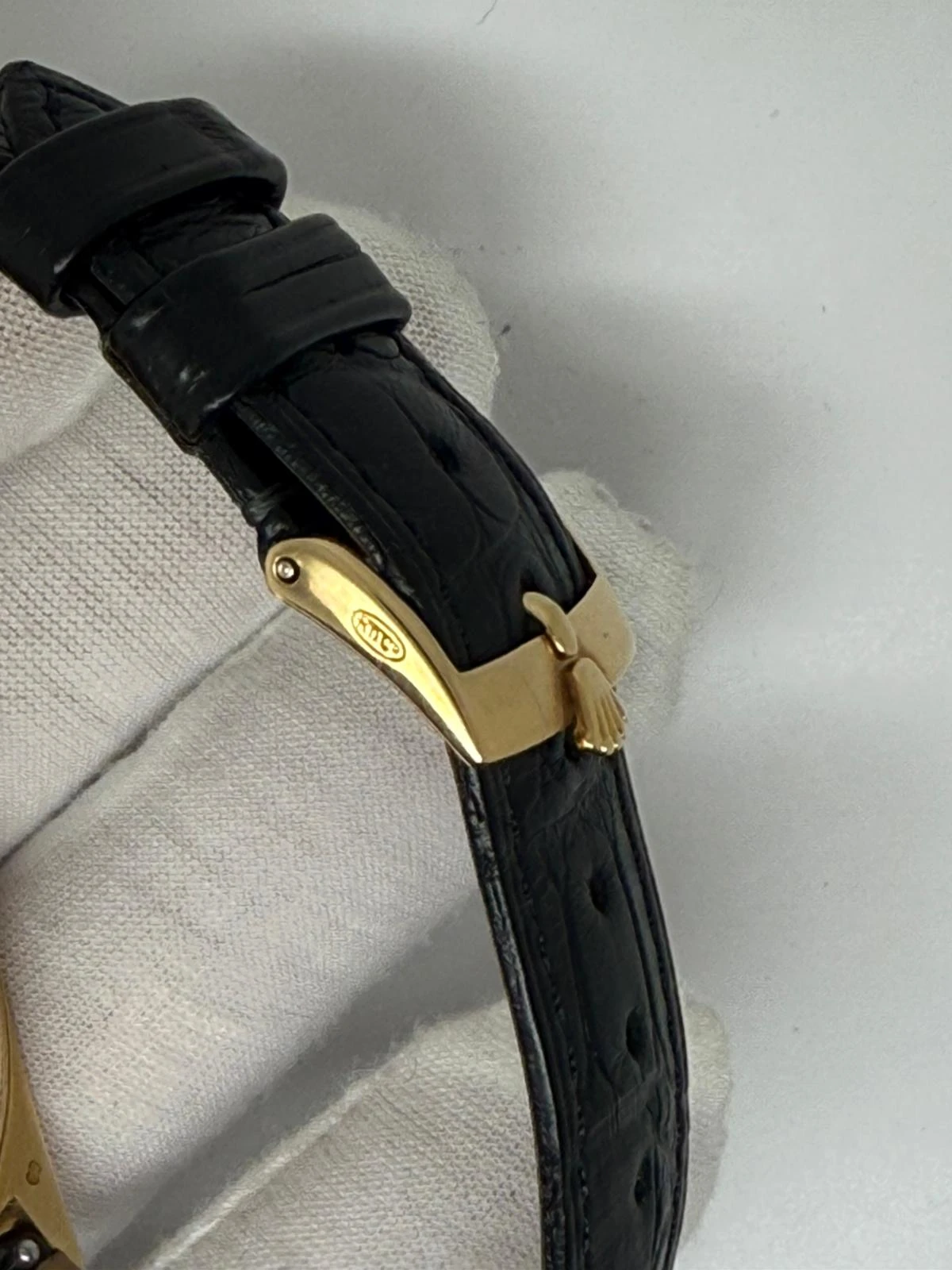 This 1979 Rolex Oyster Perpetual Day-Date, reference 18038, is crafted in solid 18ct yellow gold and features the classic 36mm case, synonymous with the iconic Day-Date design. Presented in excellent condition, the watch is fitted with a Hirsch genuine alligator strap and retains its original Rolex 18ct yellow gold buckle, adding both authenticity and luxury.