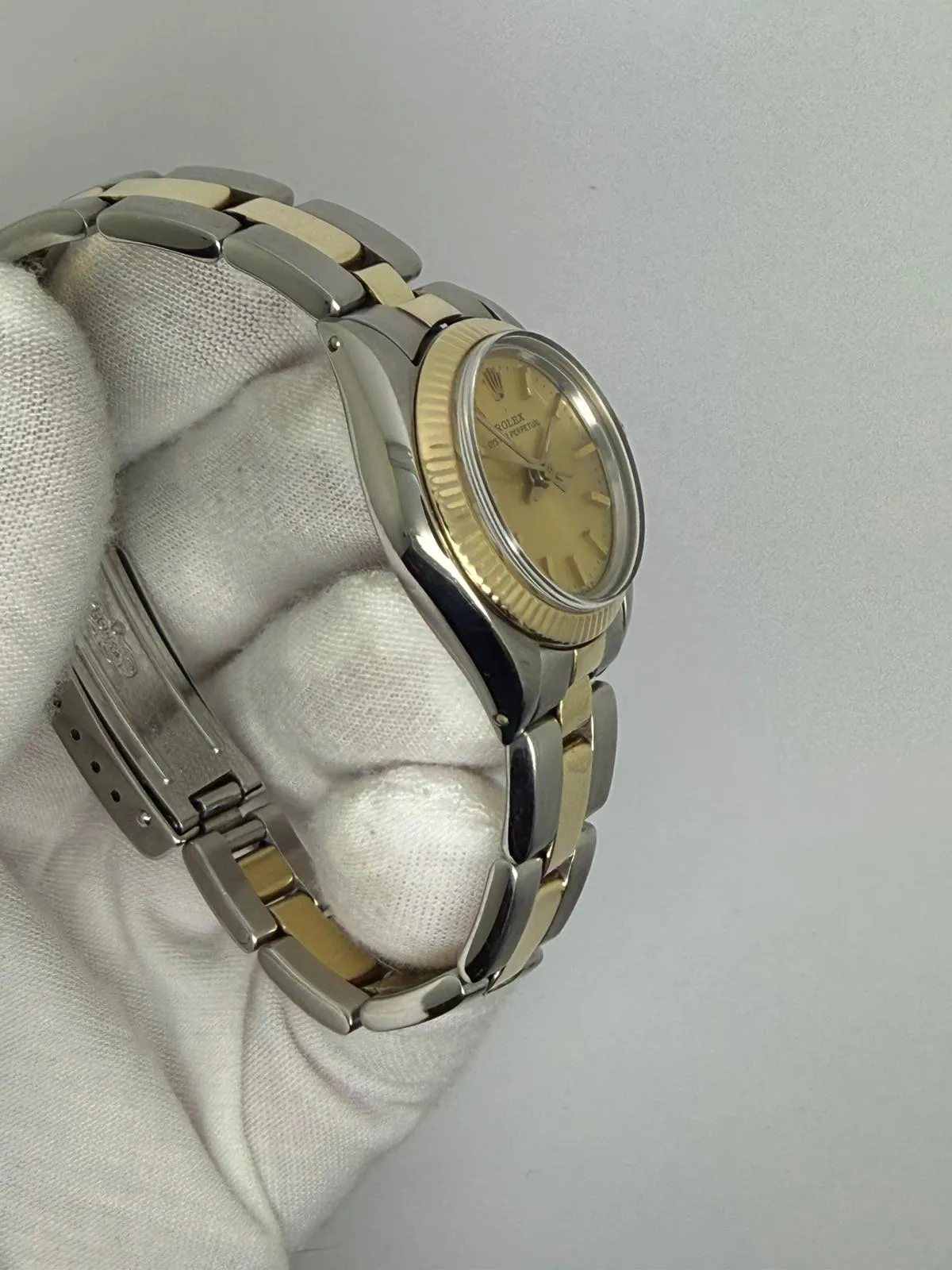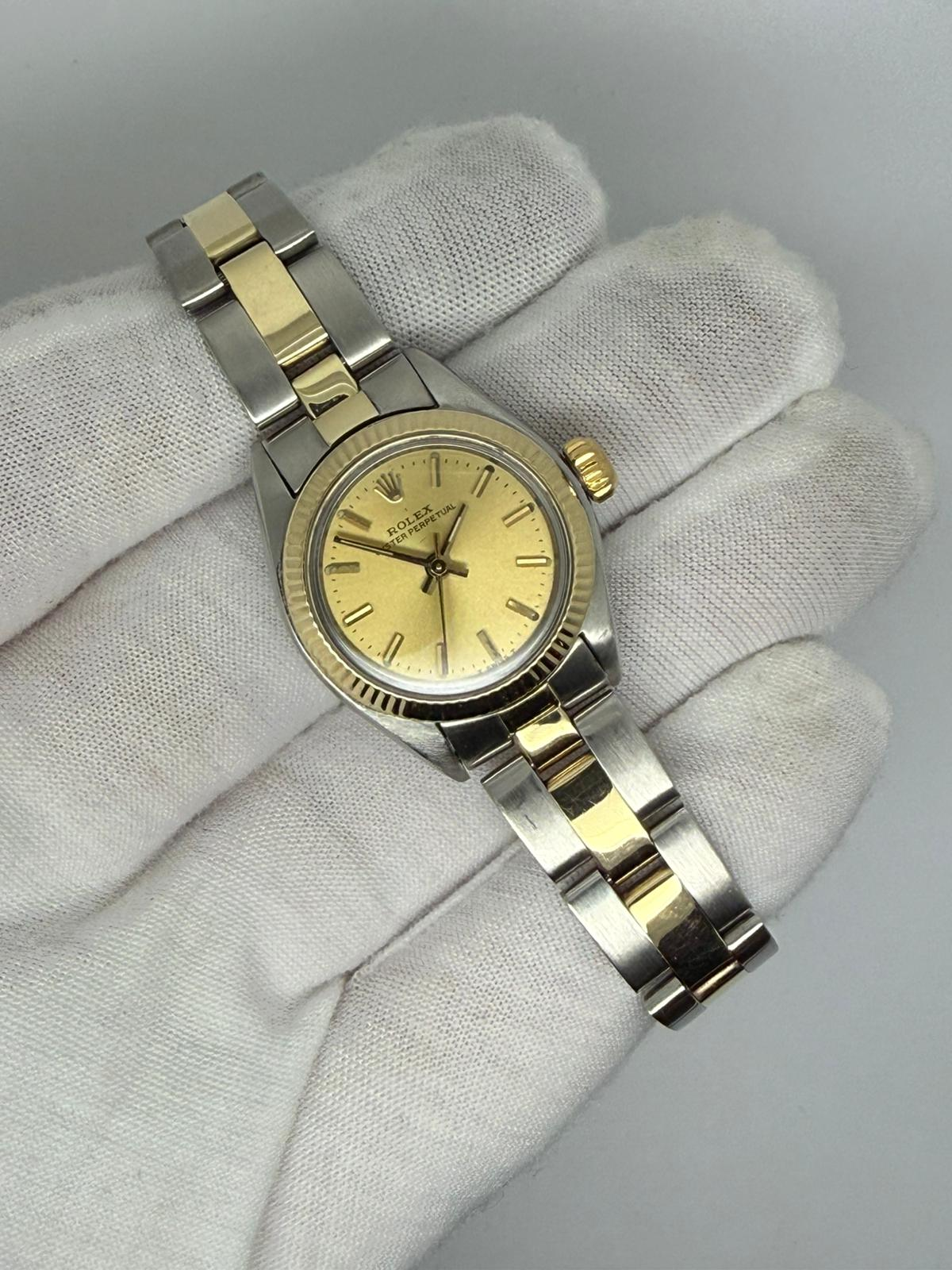 This elegant 1983 Rolex Ladies Oyster Perpetual, reference 6719, features a classic 26mm case crafted in stainless steel and 18ct yellow gold, paired with a matching Rolex steel and yellow gold Oyster bracelet. The timeless champagne baton dial enhances its refined and versatile aesthetic.