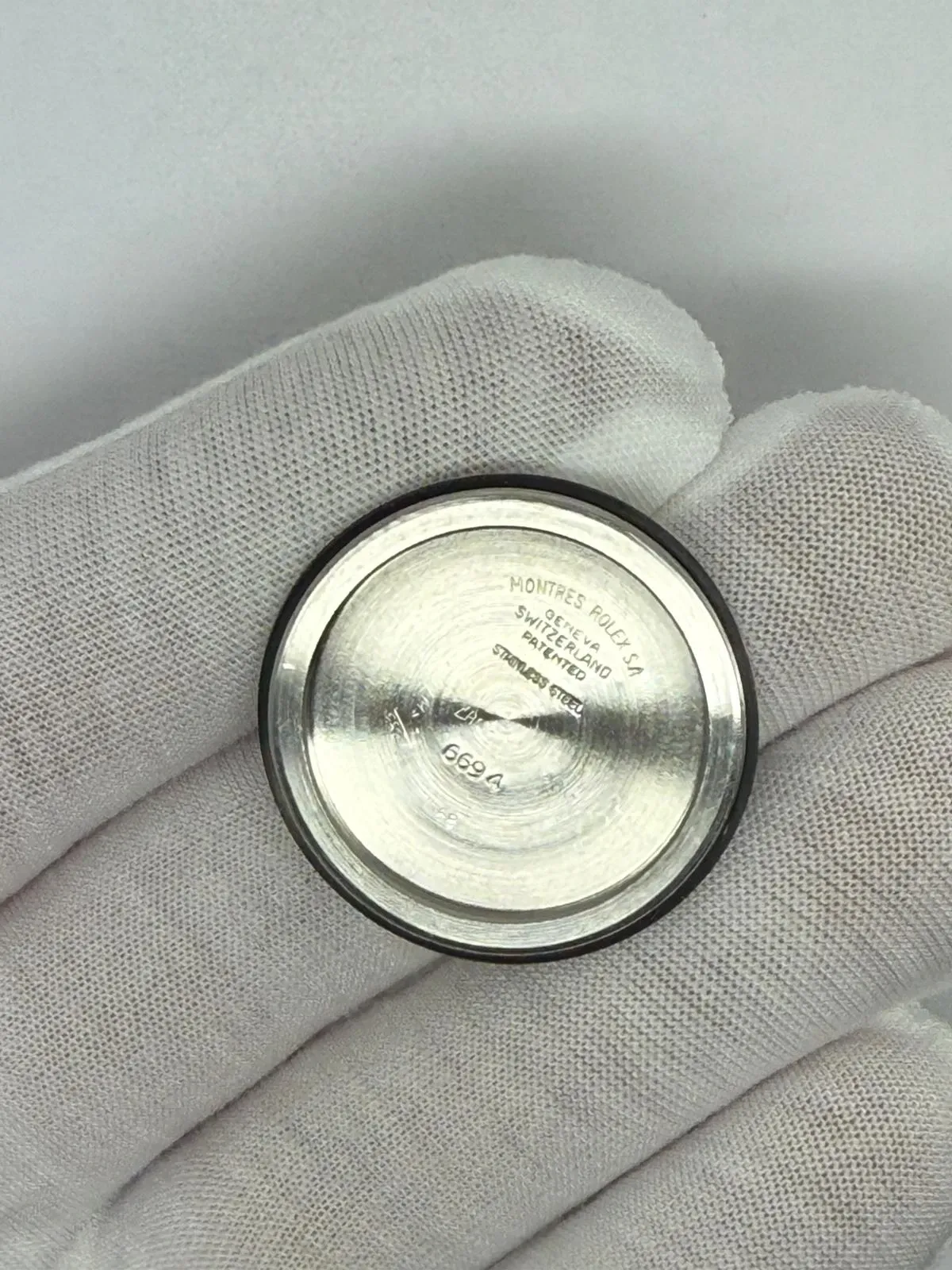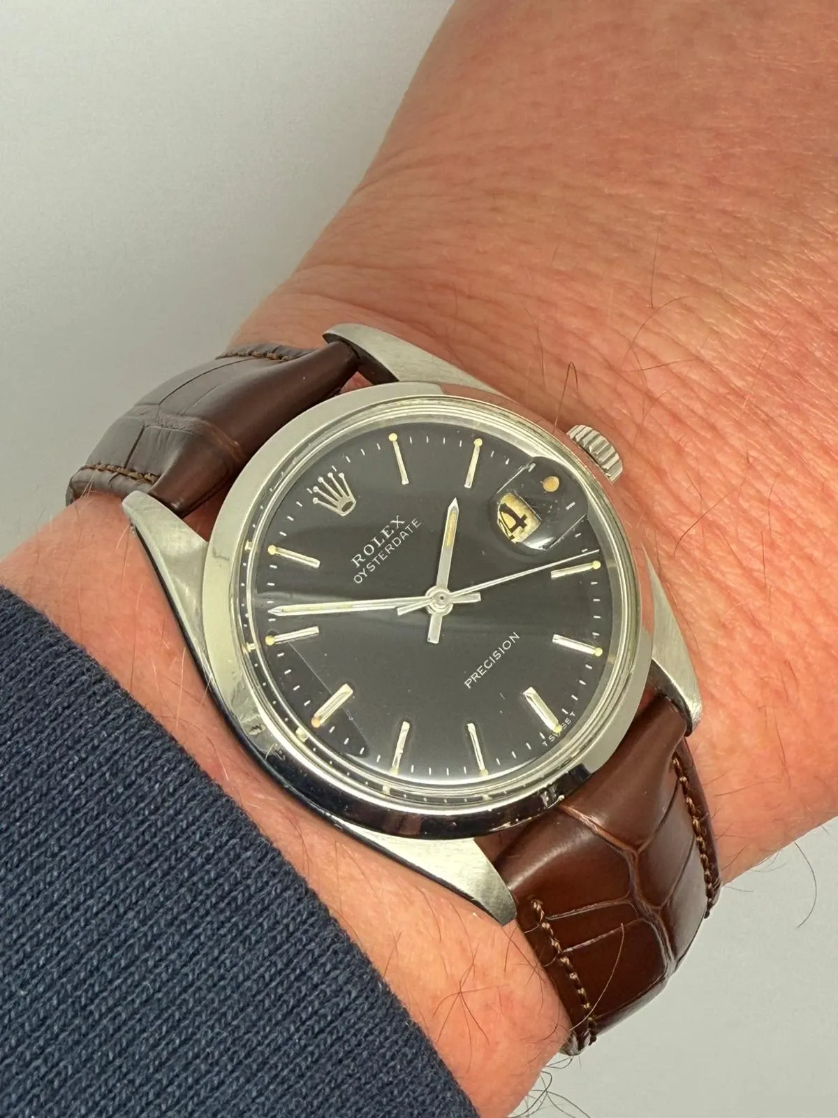 This 1968 Rolex Oysterdate Precision, reference 6694, features a classic 34mm stainless steel case and a reliable manual wind movement, offering timeless vintage Rolex appeal.