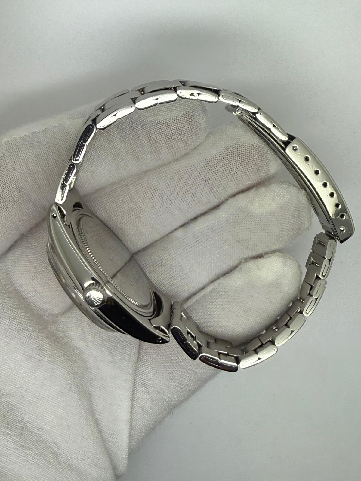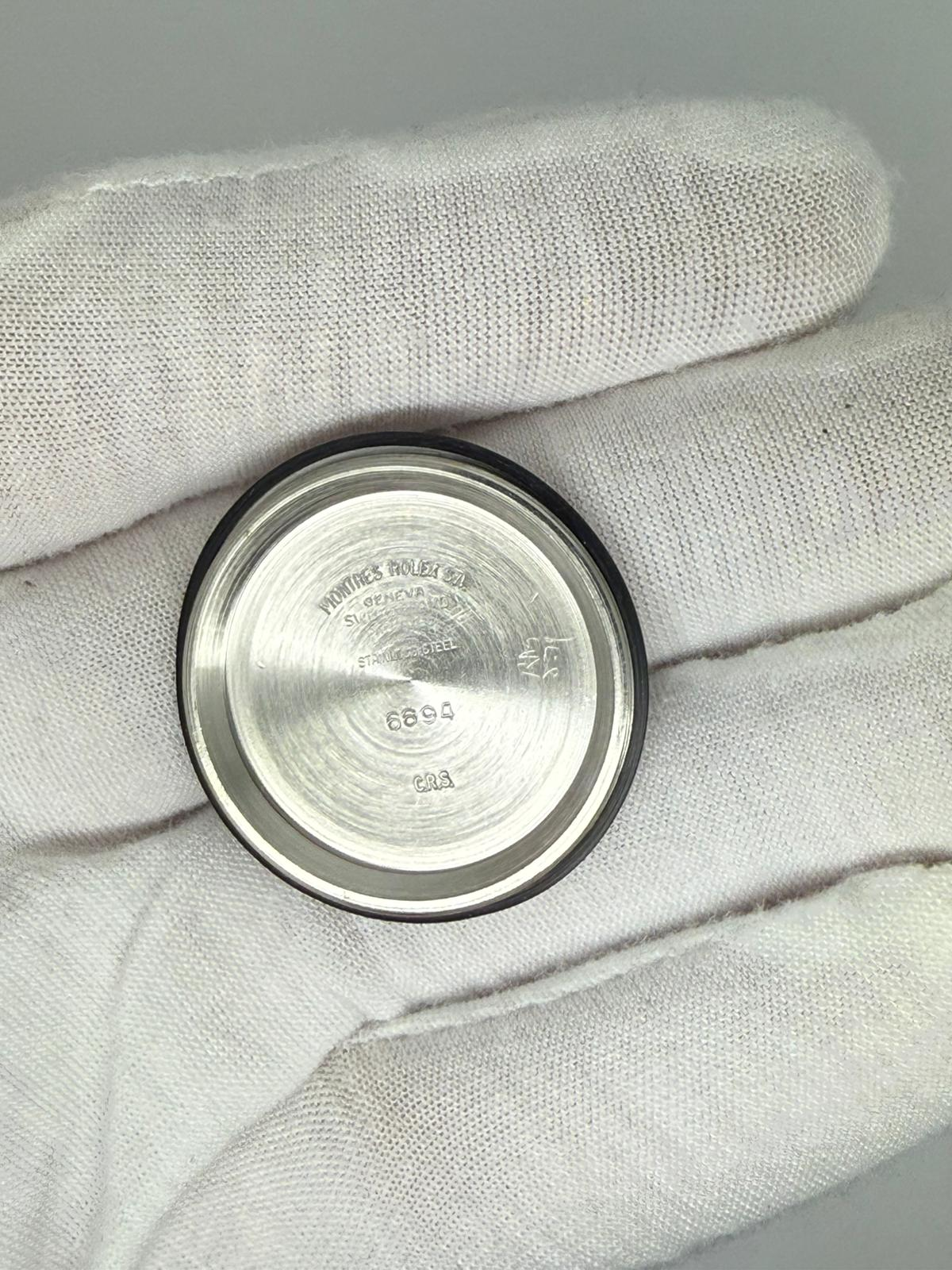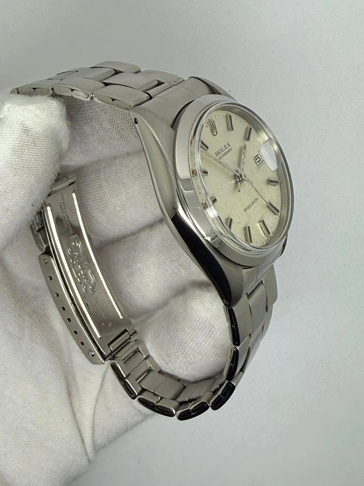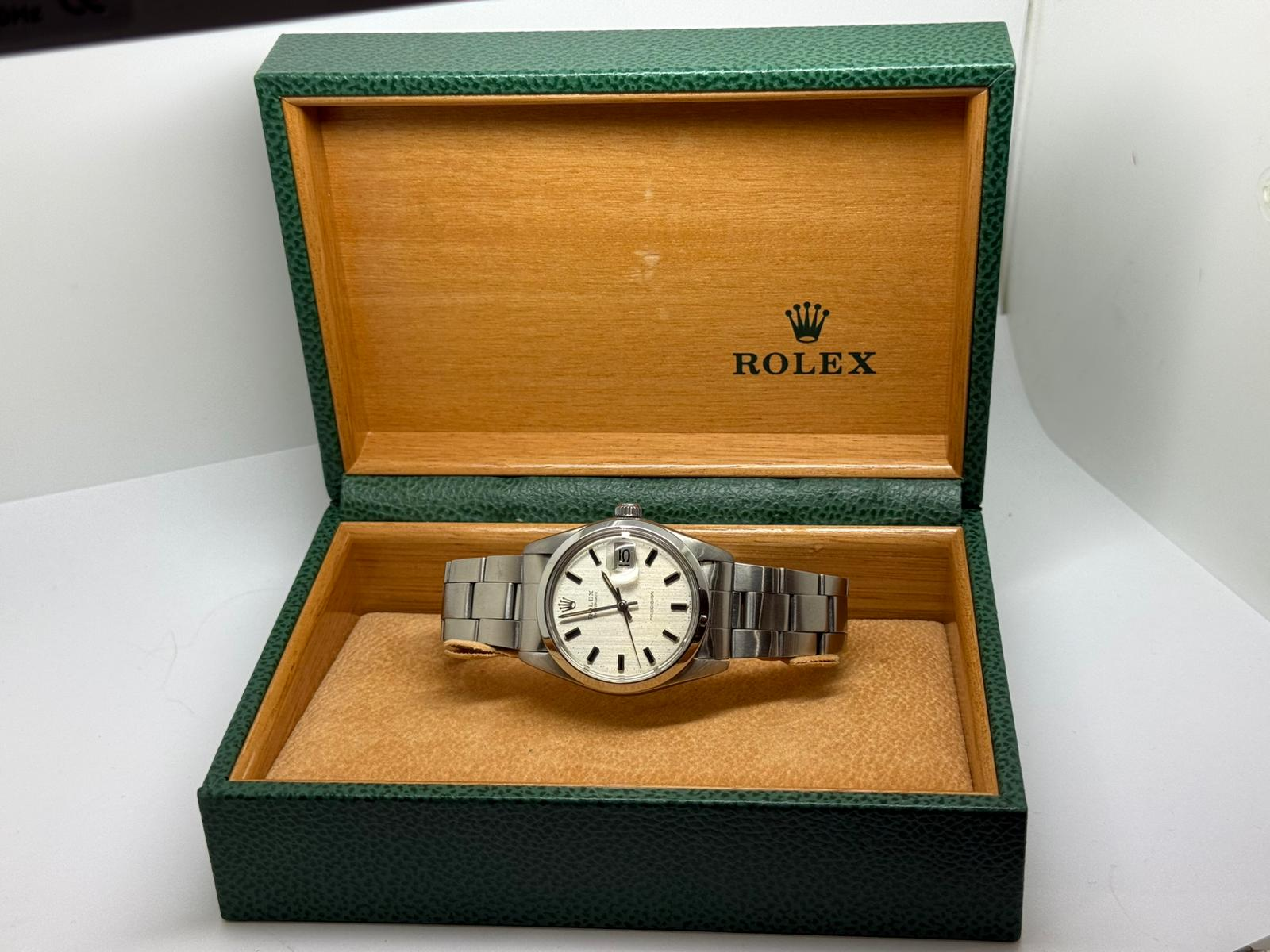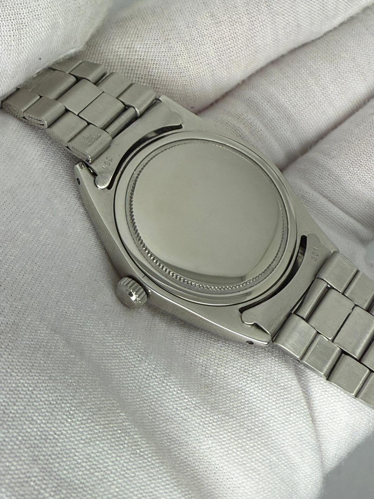 This 1973 Rolex Oysterdate Precision, reference 6694, features a classic 34mm stainless steel case paired with the original Rolex Oyster bracelet, offering timeless vintage Rolex proportions and everyday versatility.